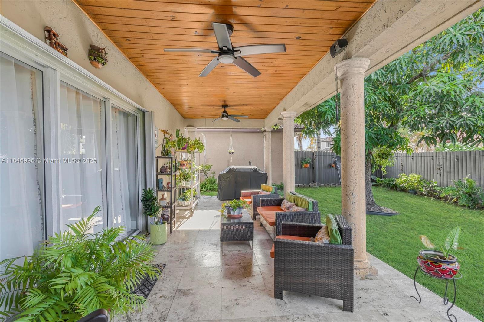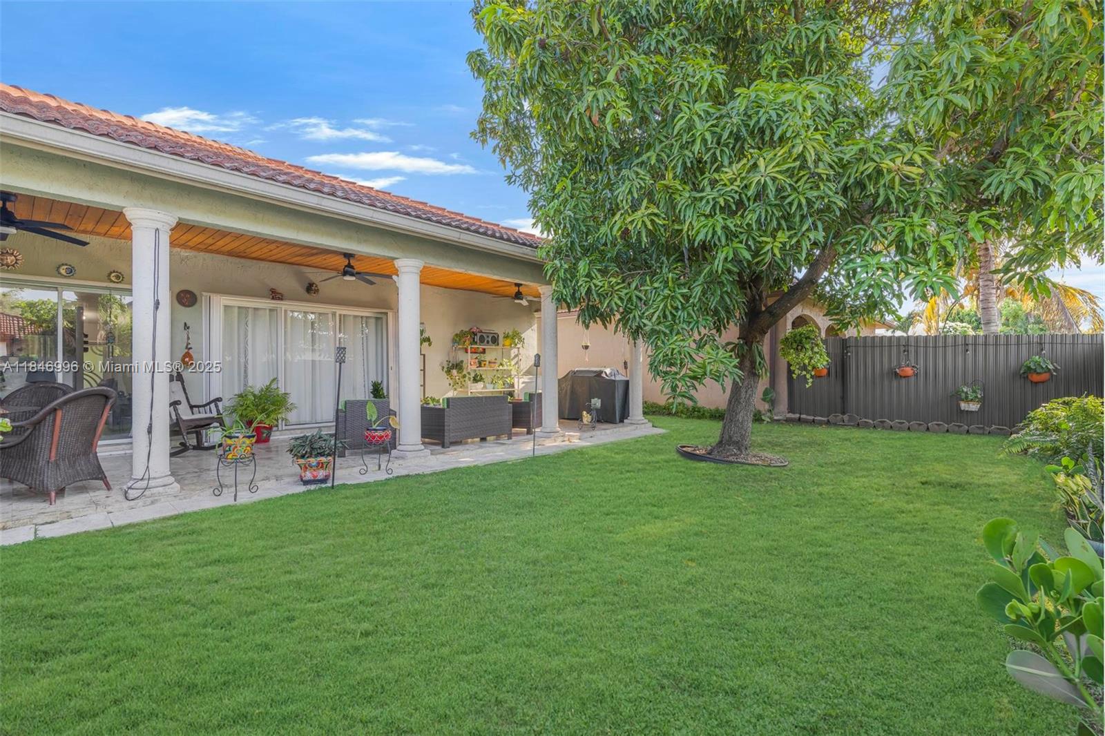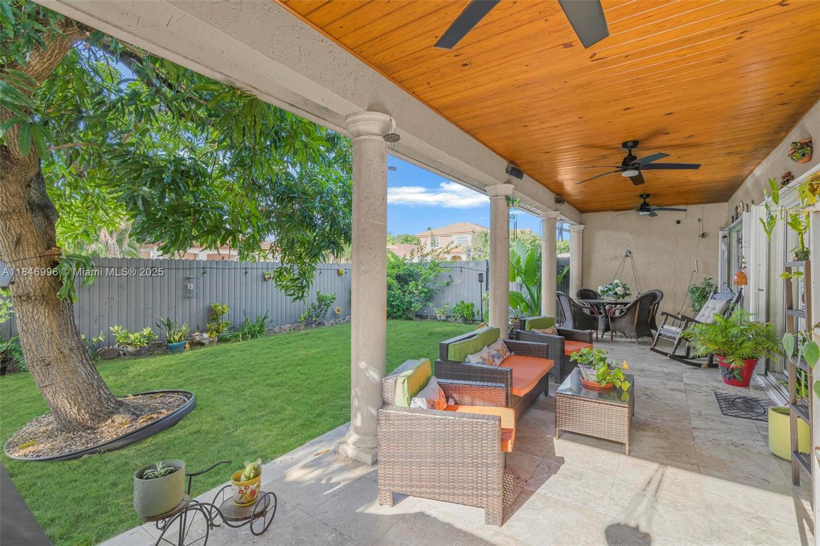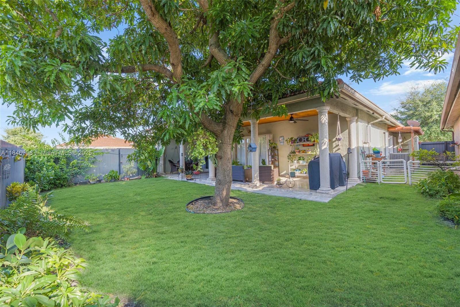 Spacious and well-maintained 4-bedroom, 2-bath single-family home featuring vaulted ceilings, energy-saving solar panels, and laminate flooring throughout. Enjoy a bright open layout, a 1-car garage, and a large covered terrace with beautiful wood ceilings and crown molding—perfect for outdoor living. The backyard has ample space for a pool and includes an exterior storage closet. Centrally located near top-rated schools, shopping, dining, and major highways for an easy commute. No HOA, giving you flexibility and freedom. This home is move-in ready with great curb appeal, nestled in a desirable, quiet neighborhood. A perfect blend of comfort, convenience, and value—ideal for families or anyone looking to enjoy the South Florida lifestyle.
