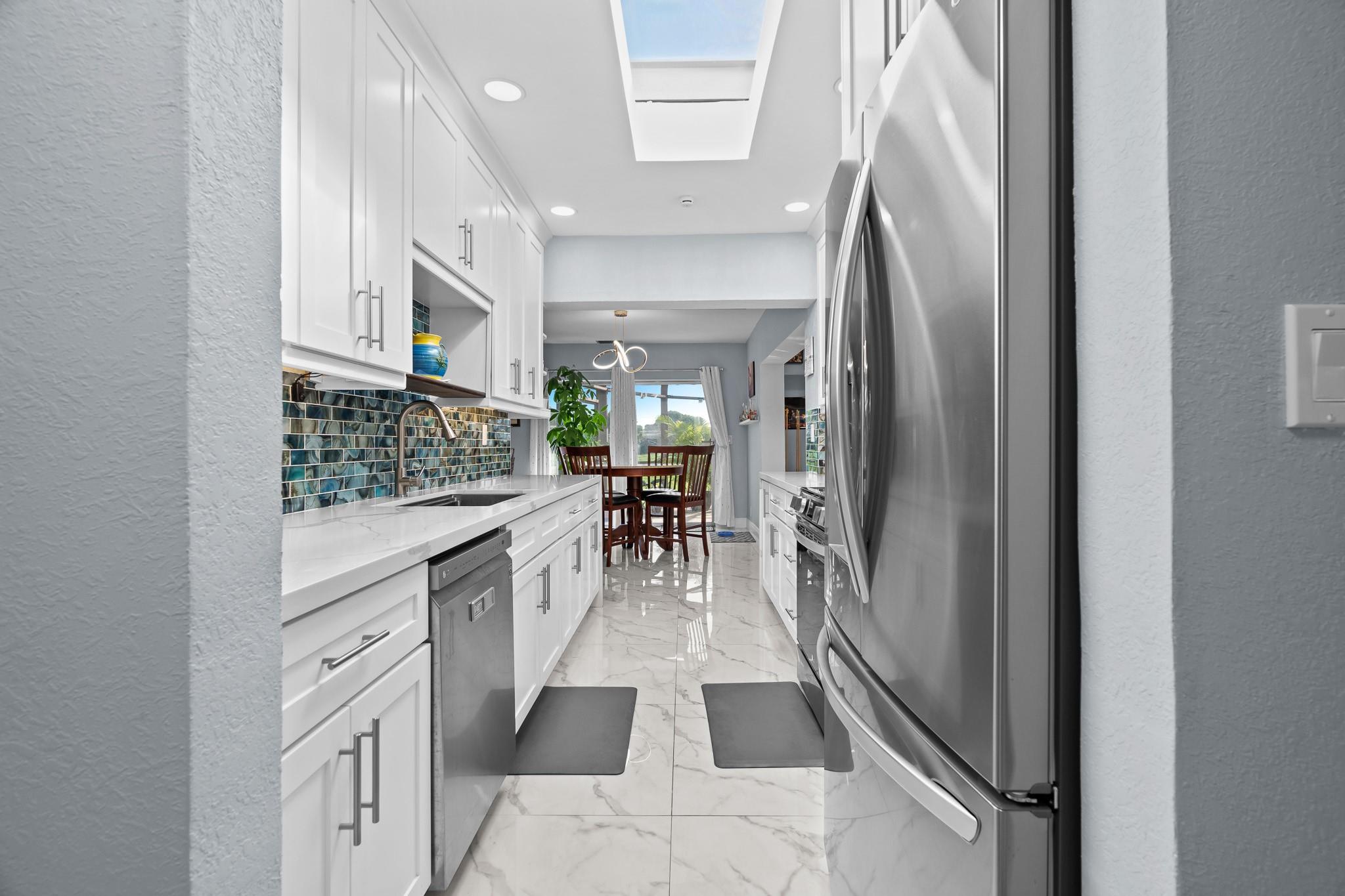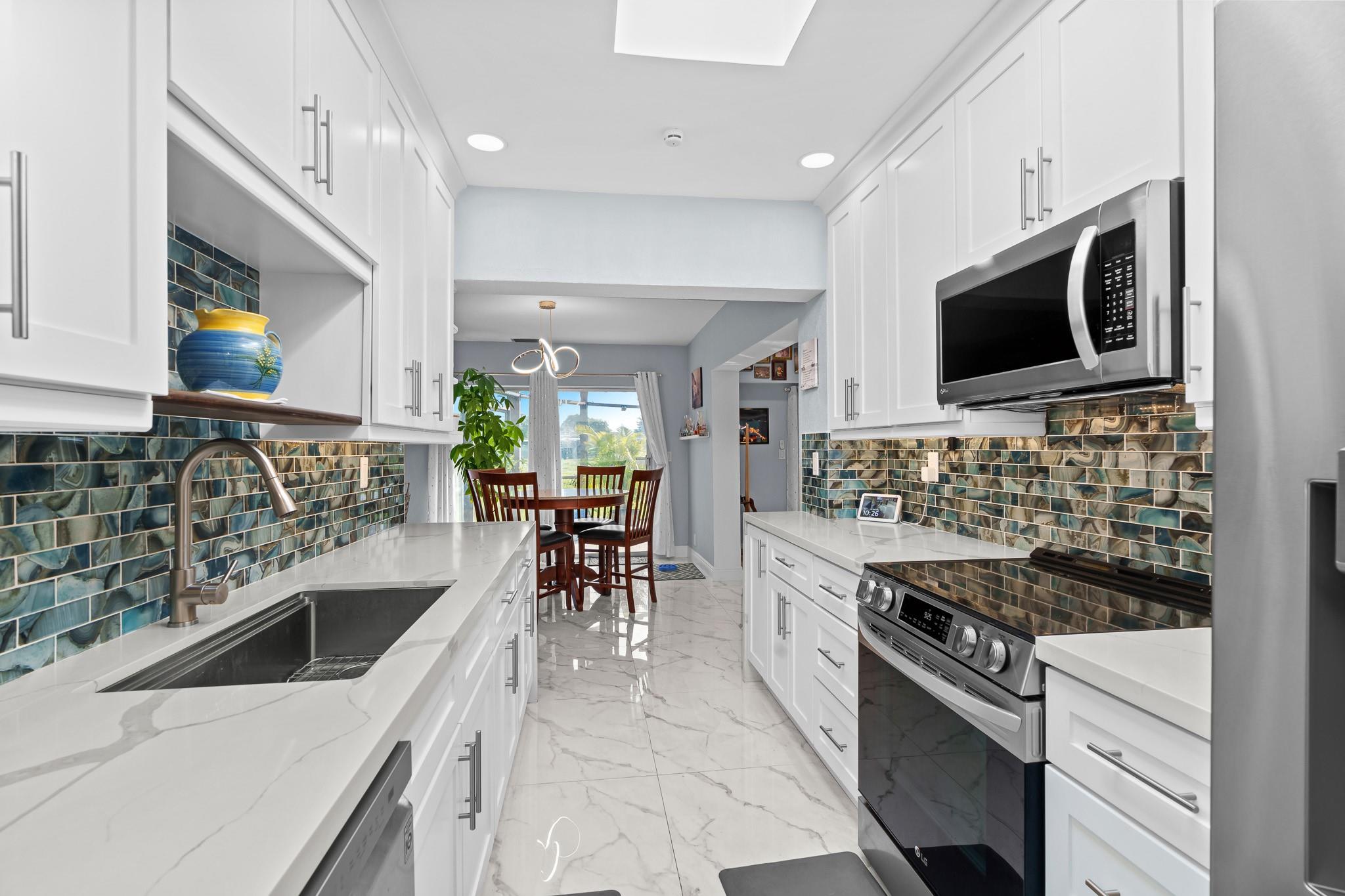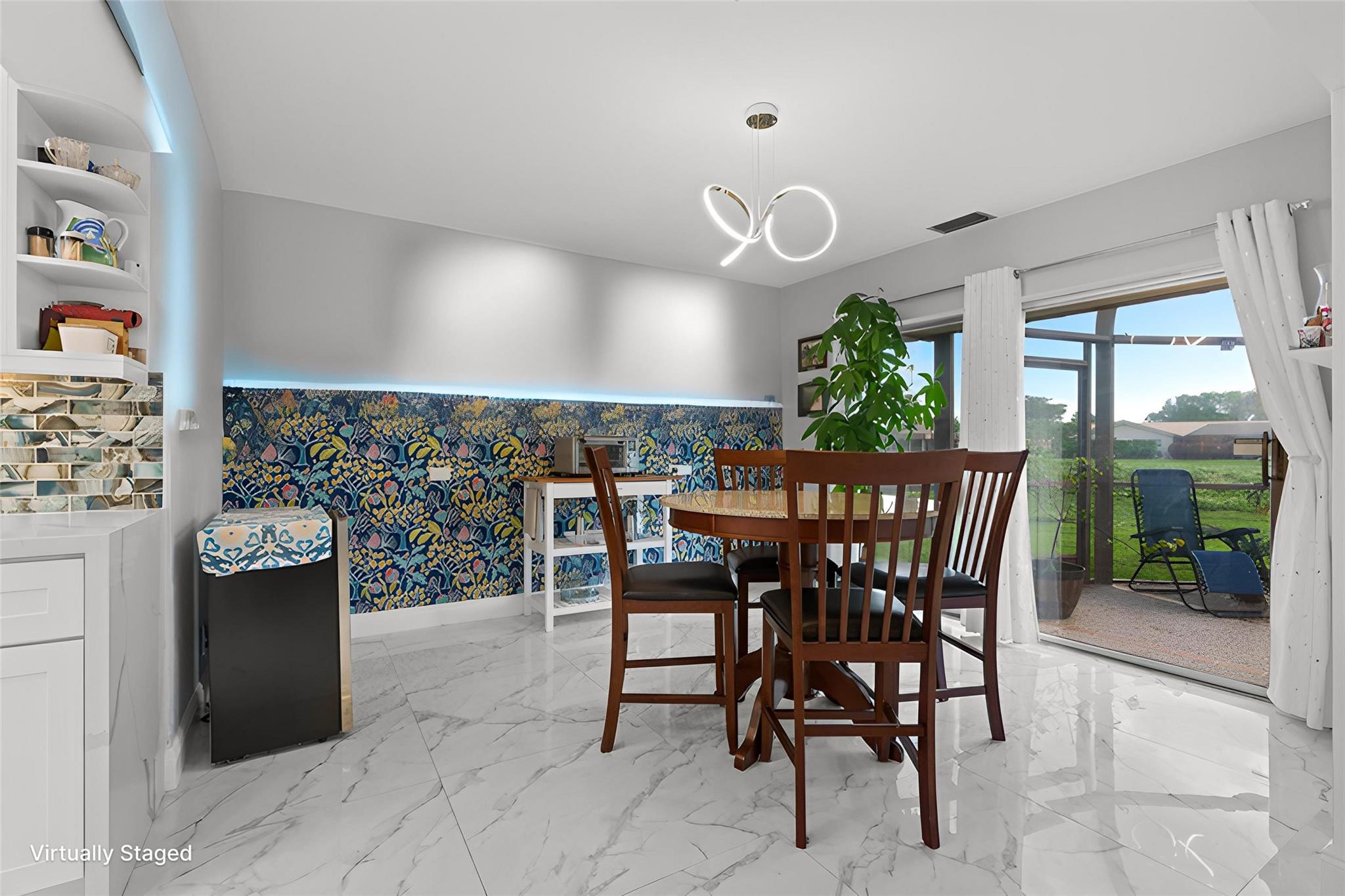 Welcome to your dream home in the prestigious WOODLANDS COMMUNITY! This remodeled 3/2 residence offers over 2,400 sq ft of luxurious living space on a spacious 0.28-acre lot. From the moment you arrive, you'll be captivated by the modern finishes, split floor plan, and rare 4-car garage—perfect for car enthusiasts or extra storage. Step inside to discover gleaming 24x24 MARBLE TILE FLOORS, WHITE SHAKER CABINETRY, and QUARTZ COUNTERTOPS throughout. The CHEF'S KITCHEN features stainless steel appliances and a breakfast nook. The expansive great room flows seamlessly into a game room and formal dining area, creating a versatile space for gatherings. Enjoy peace of mind with a 2019 ROOF, updated electric, Wi-Fi smart home setup and 2 zone a/c. The screened lanai offers a tranquil retreat.