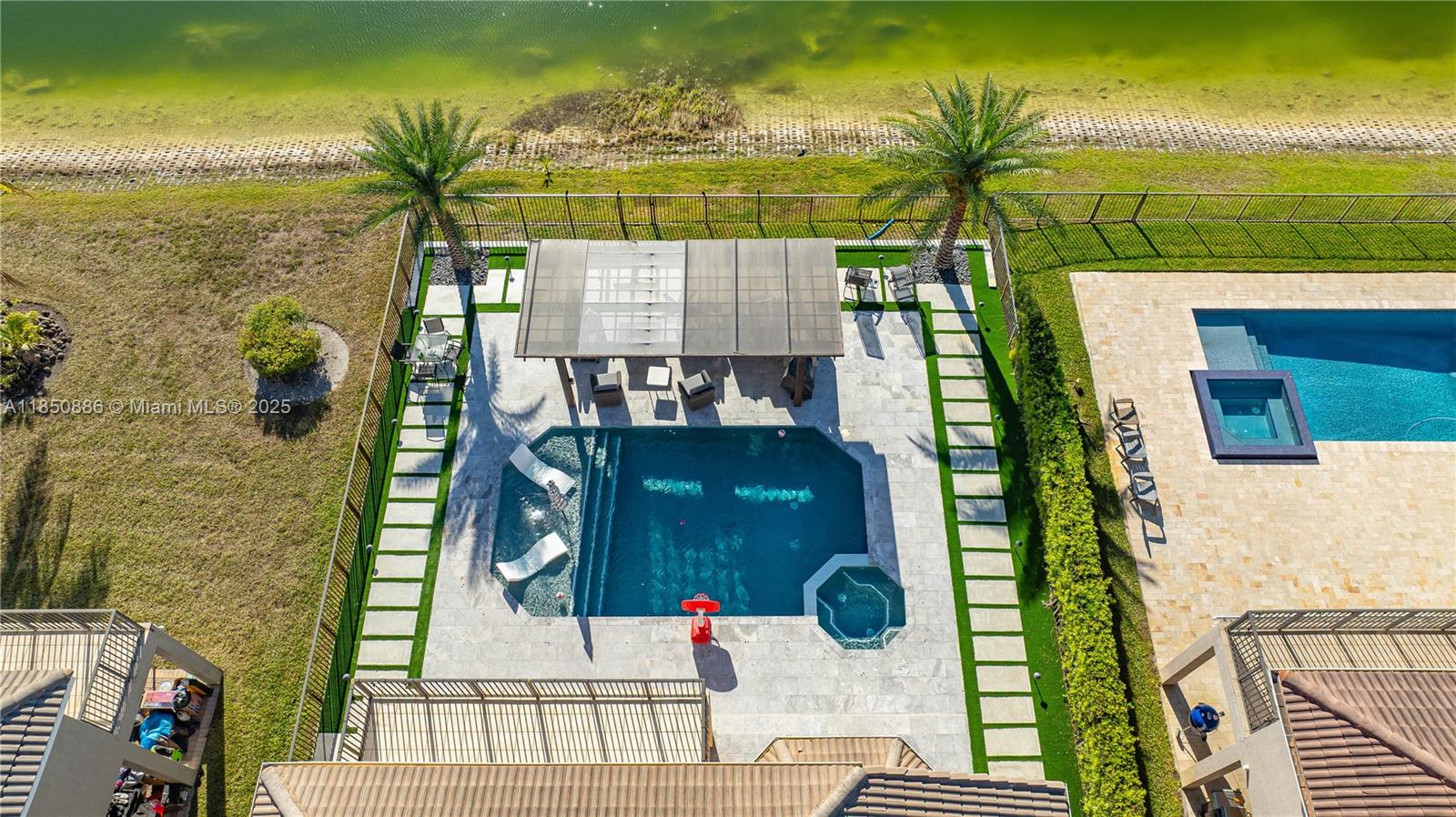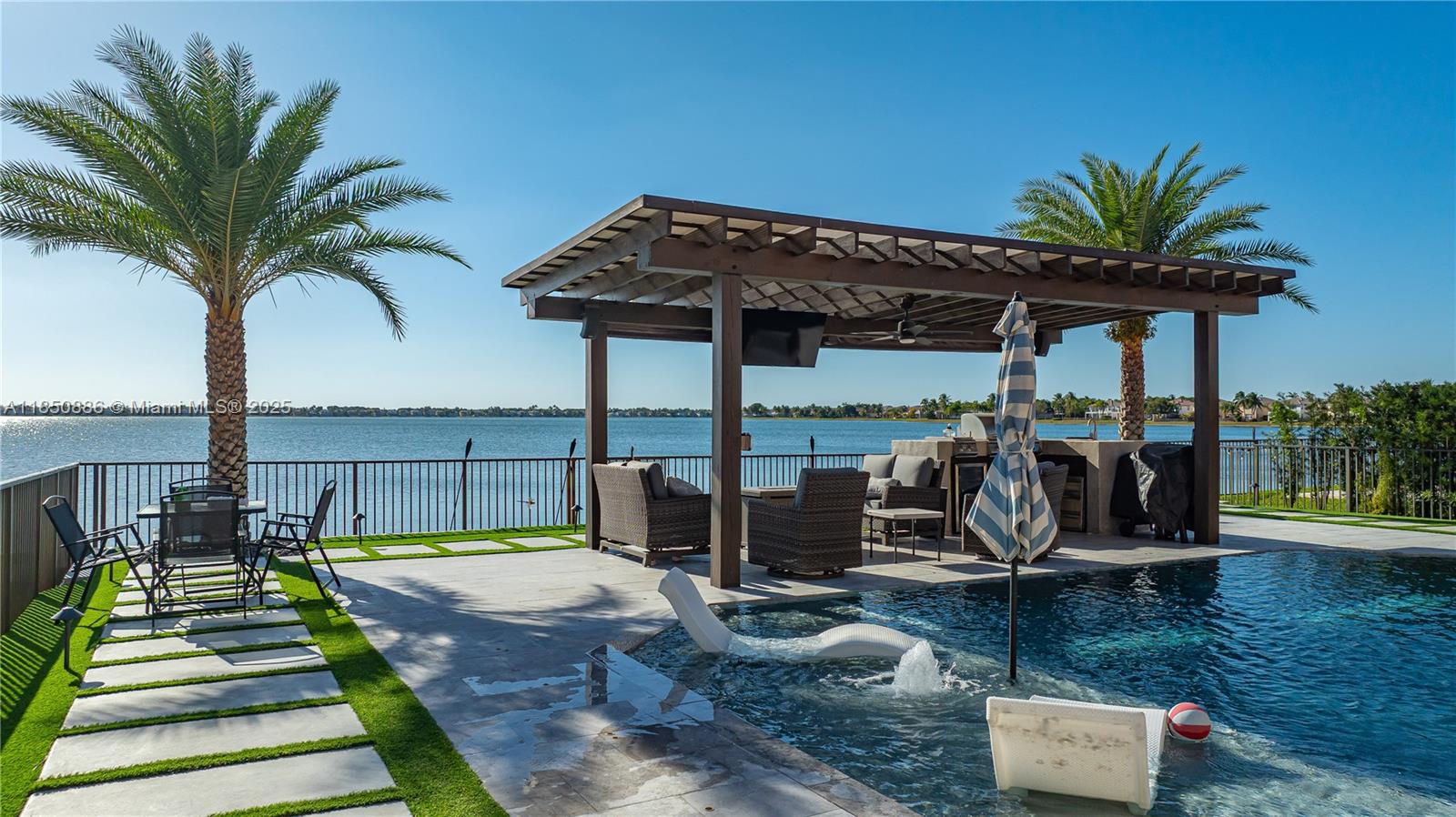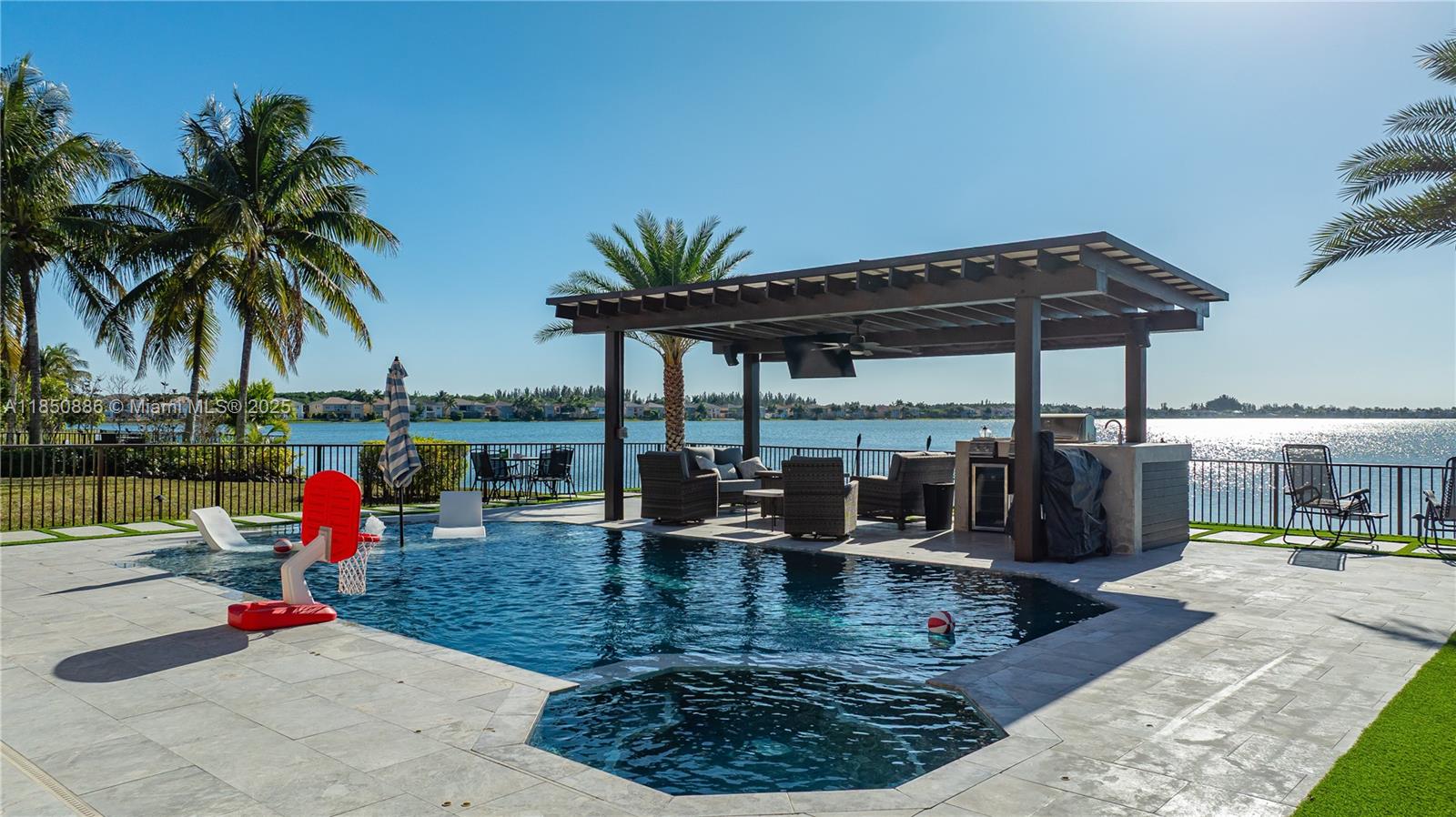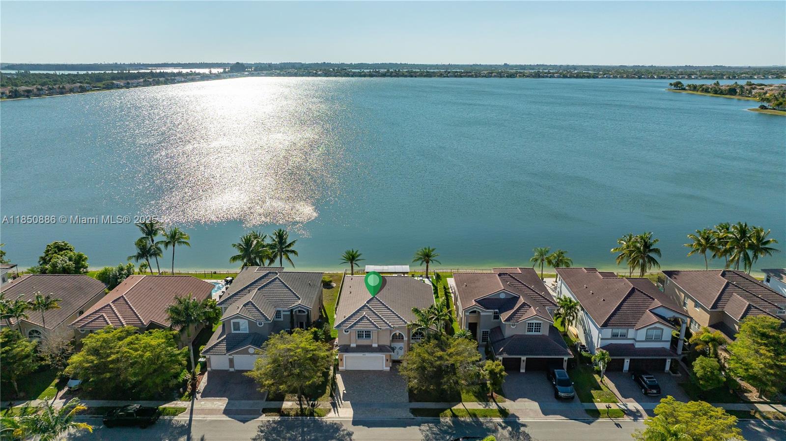 Welcome to your gorgeous new home with unparalleled lake view that looks out for miles in each direction. New porcelain floors & laminate upstairs. Kitchen updated Feb 2025, everything new from the Samsung appliances to the cabinets & quartz island. Beautiful lighting throughout both natural and from the chandeliers including a 6ft one hanging in the foyer. 2 car garage with 3 car paver driveway installed this month, plenty of space to park. Primary bedroom has dual primary bath with shared shower & baloney view of lake & backyard. Large format closets. The backyard is like no other. Enjoy the most incredible view & sunsets that will make everyone envious. Heated salt water pool with sun deck, fountain & hot tub. Pergola with drop down tv, built in bbq and sink. Truly one of a kind.