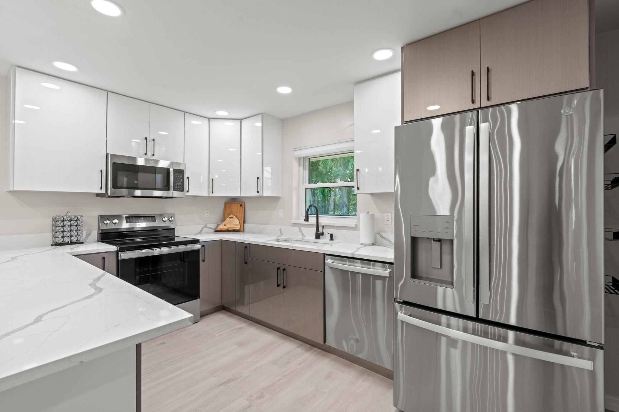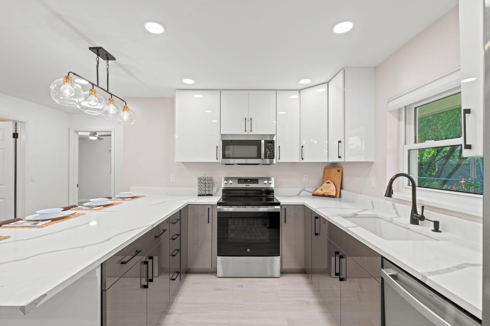Welcome to 1081 Bimini Lane -- the perfect combination of elegance, entertainment, and joyful relaxation. This beautifully renovated 3-bedroom, 2-bath open-concept home is nestled on the coveted Singer Island, just steps from the beach, scenic finger canals leading to the Intracoastal, and an array of shops and restaurants. Step into a bright, spacious living area filled with natural light and brand-new flooring throughout. The luxuriously remodeled kitchen features sleek European-style cabinets, quartz countertops, stainless steel appliances, an expansive peninsula, and a touchless faucet -- all seamlessly connected to the dining area and a stunning elegant wine wall. Two lazy Susans add thoughtful functionality. An entertainer's dream! The master bedroom is spacious and airy, with...