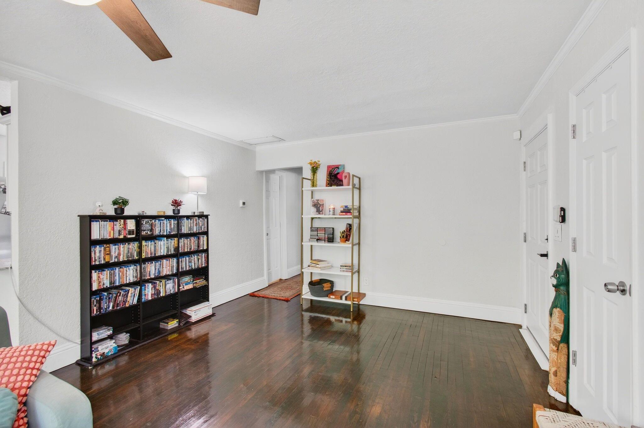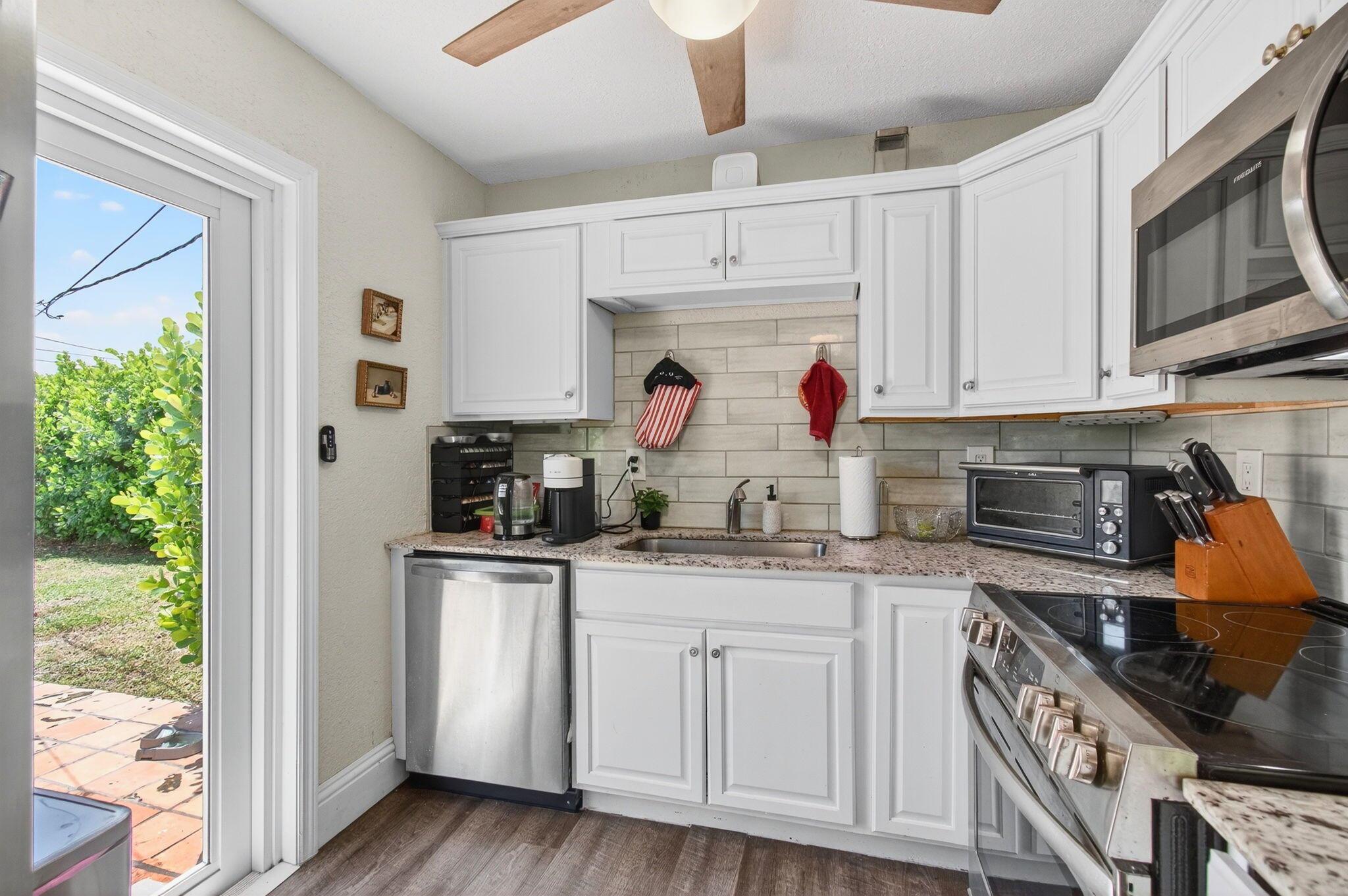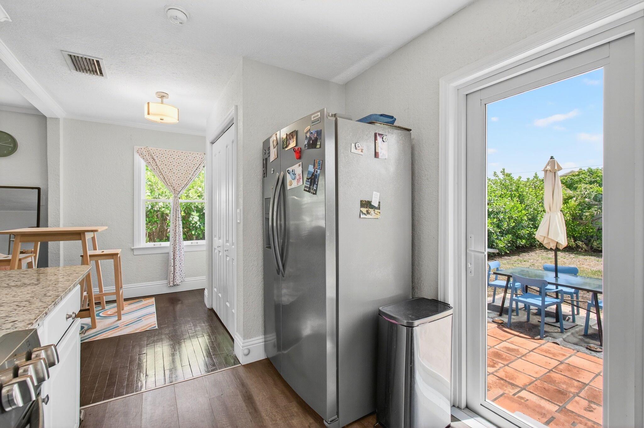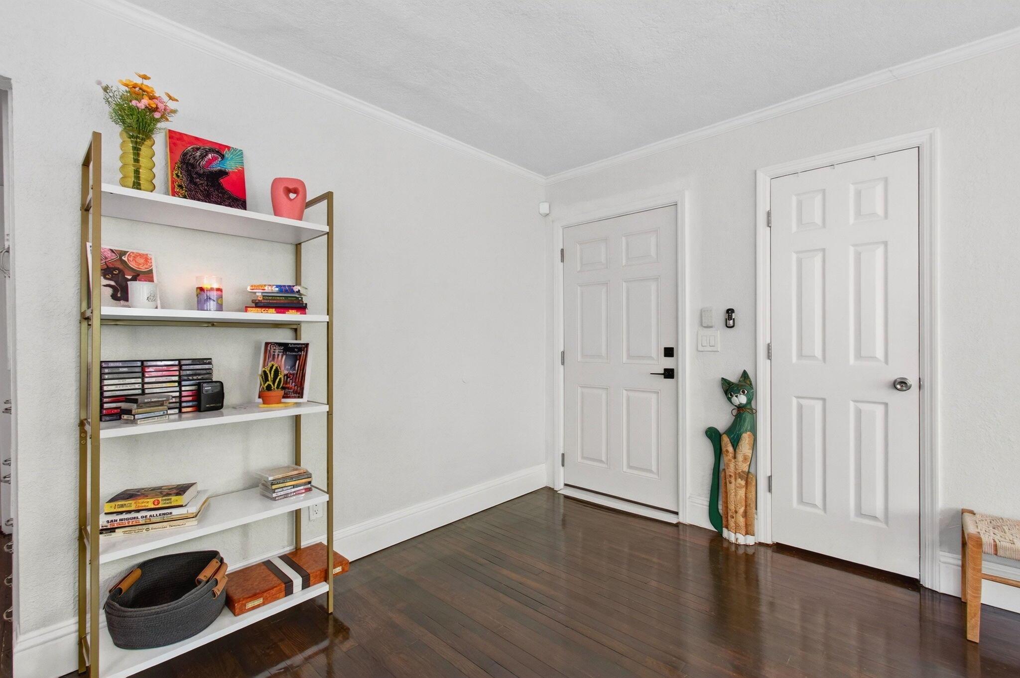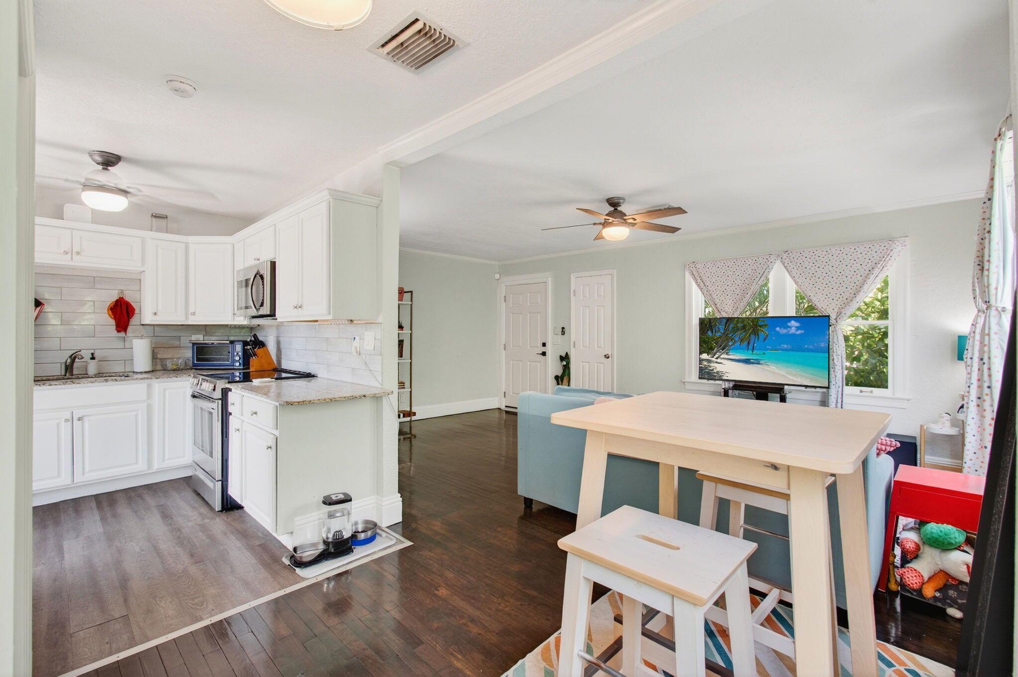 NO HOA!! Step into timeless character blended with modern upgrades in this beautifully maintained 2-bed, 1-bath home. Original refinished hardwood floors set the tone for a warm & inviting atmosphere. The fully renovated bathroom adds a fresh, contemporary touch. The kitchen features granite countertops, under-cabinet lighting, a modern tile backsplash, and top-of-the-line stainless steel appliances. Outside, enjoy Florida living at its finest on the tiled back patio, overlooking a botanical, fully fenced yard. There's ample space for entertaining, gardening, or room for a pool. The large shed offers extra storage. Off-street parking adds convenience, and with no HOA, you'll enjoy freedom and flexibility.