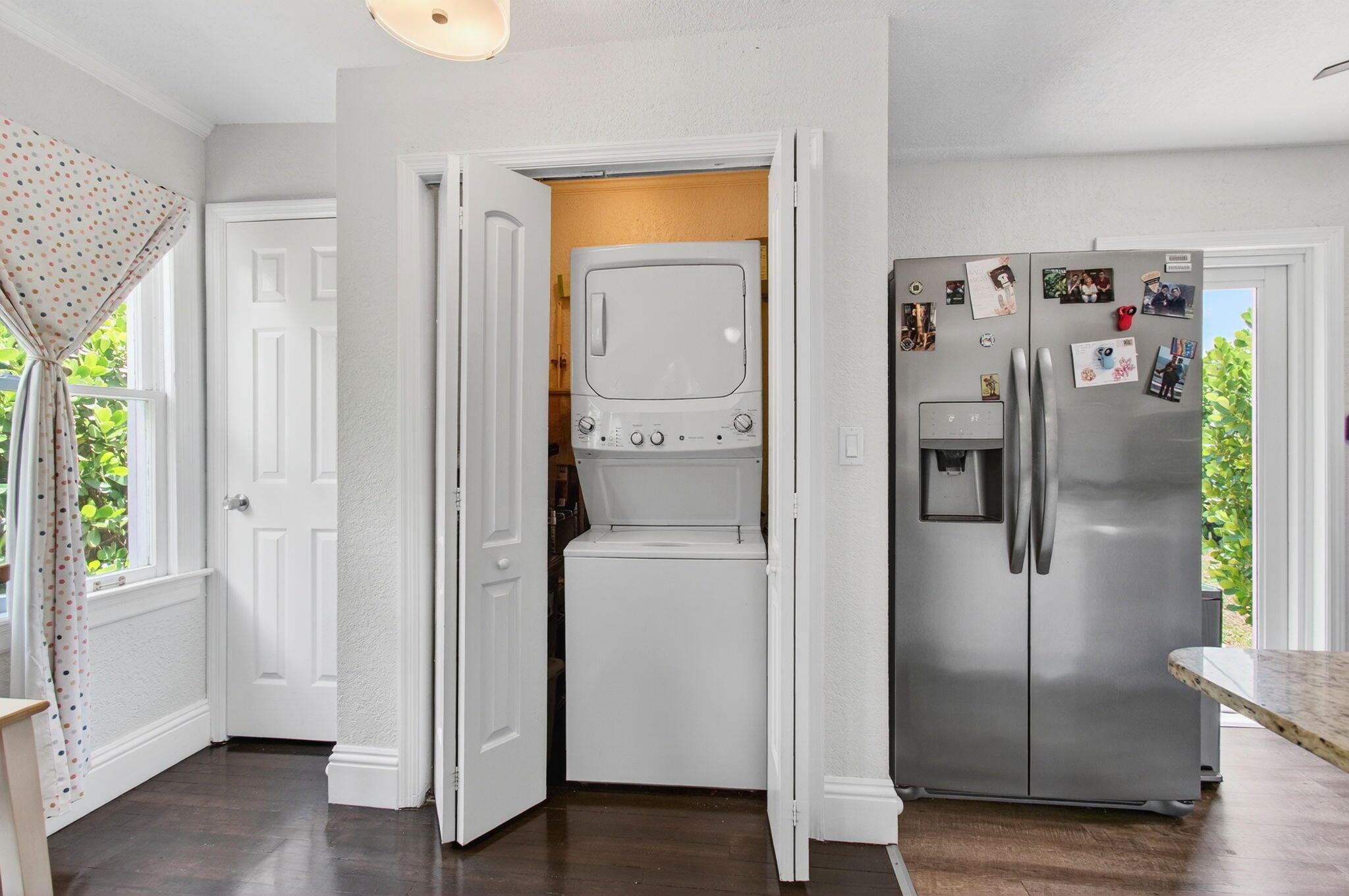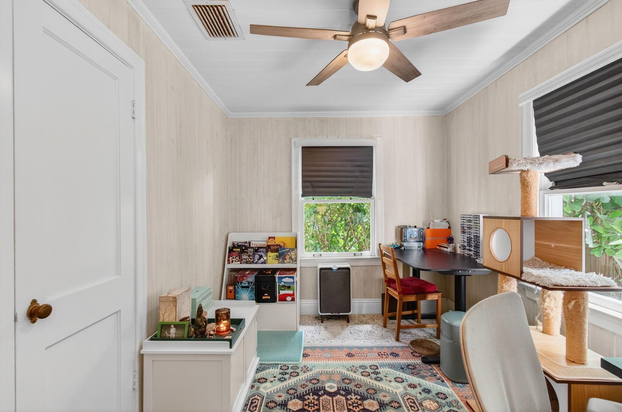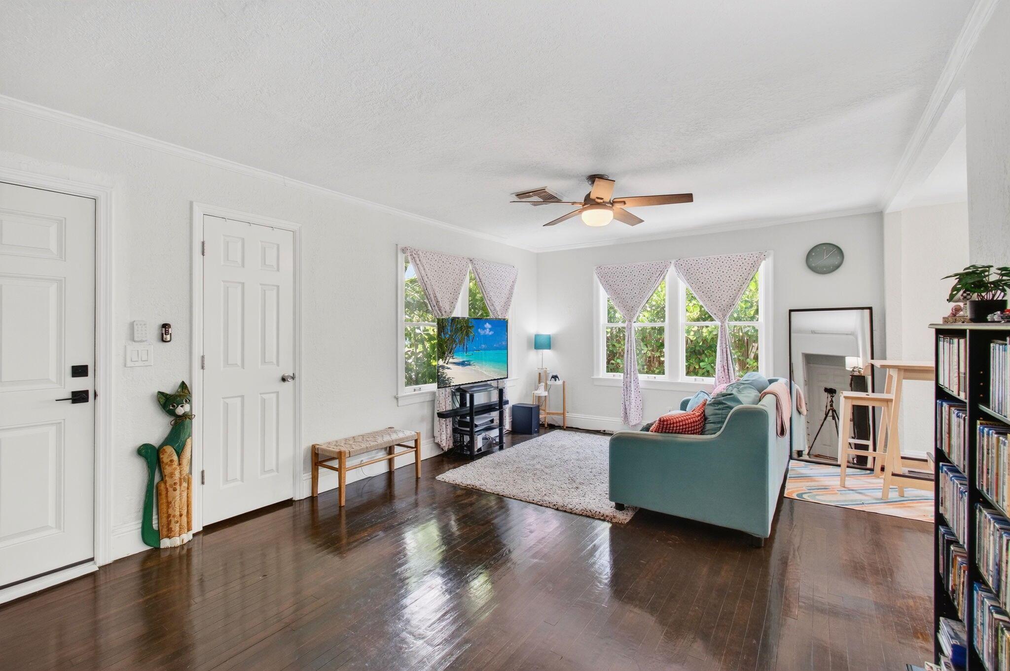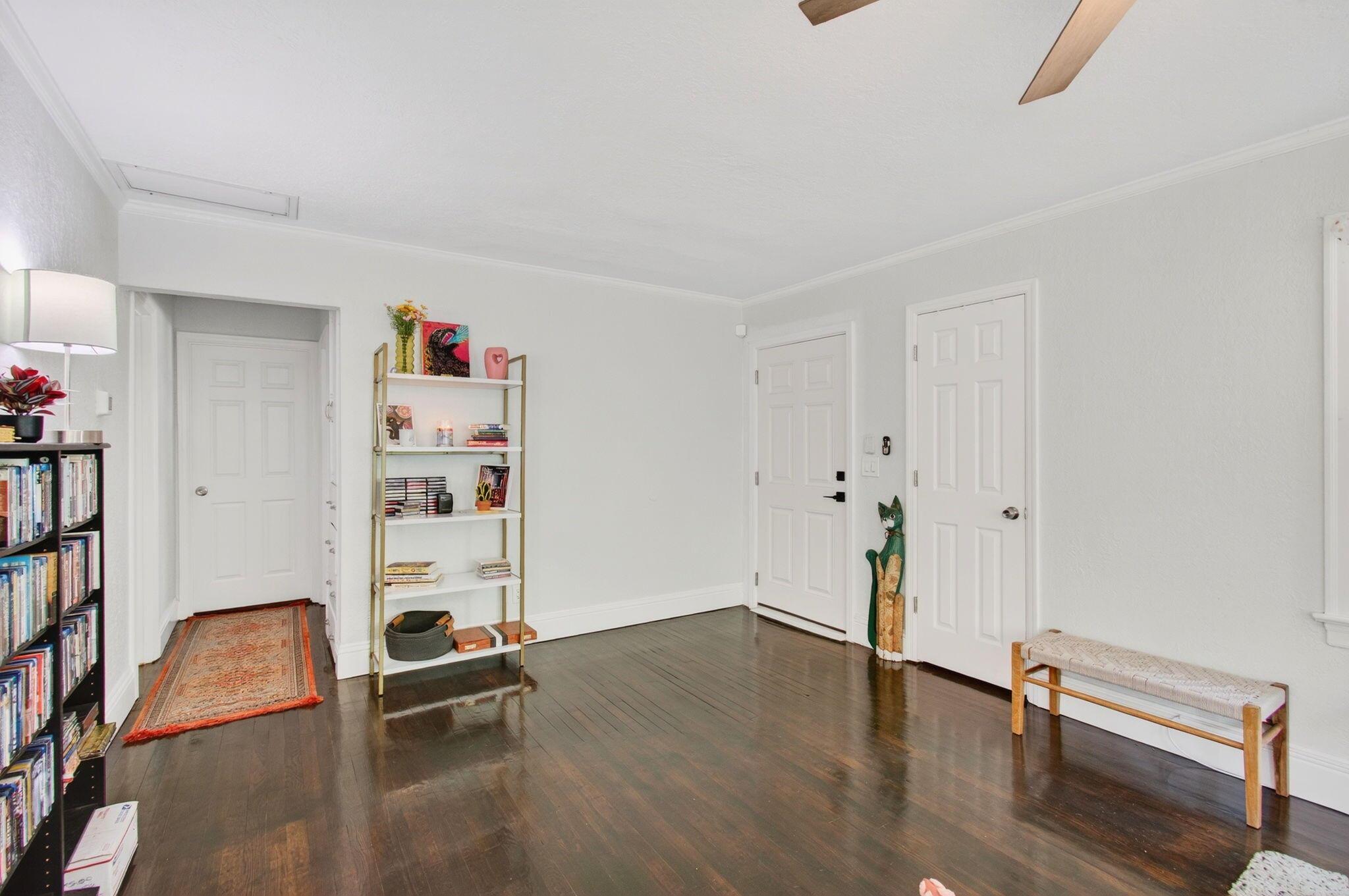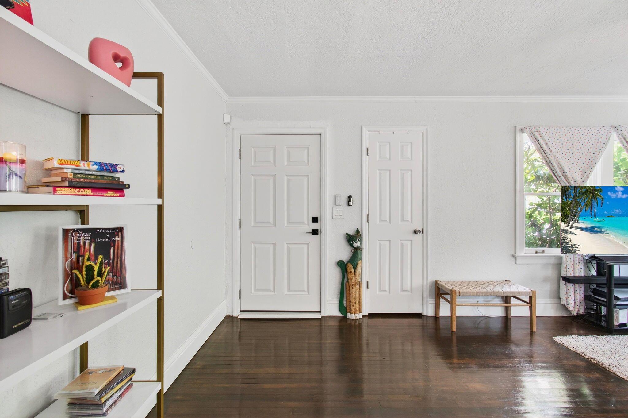 NO HOA!! Step into timeless character blended with modern upgrades in this beautifully maintained 2-bed, 1-bath home. Original refinished hardwood floors set the tone for a warm & inviting atmosphere. The fully renovated bathroom adds a fresh, contemporary touch. The kitchen features granite countertops, under-cabinet lighting, a modern tile backsplash, and top-of-the-line stainless steel appliances. Outside, enjoy Florida living at its finest on the tiled back patio, overlooking a botanical, fully fenced yard. There's ample space for entertaining, gardening, or room for a pool. The large shed offers extra storage. Off-street parking adds convenience, and with no HOA, you'll enjoy freedom and flexibility.