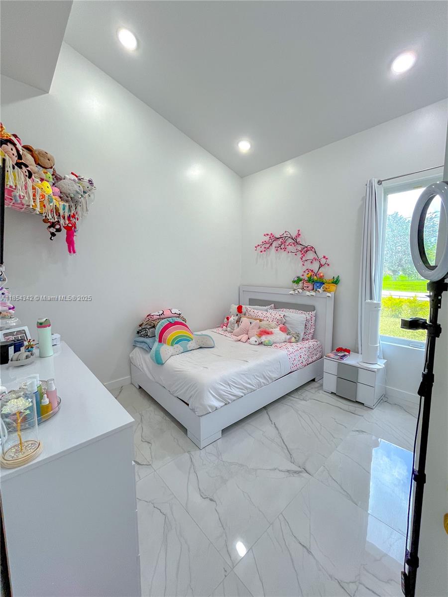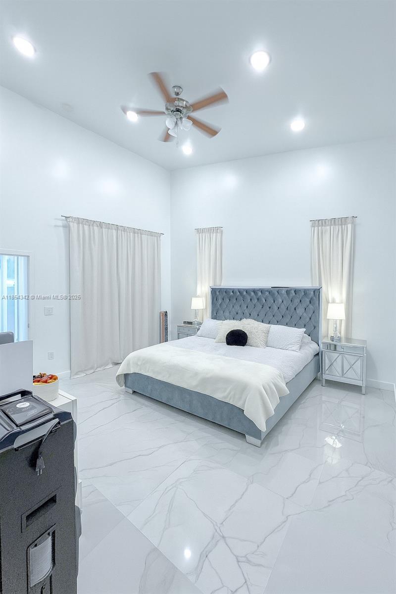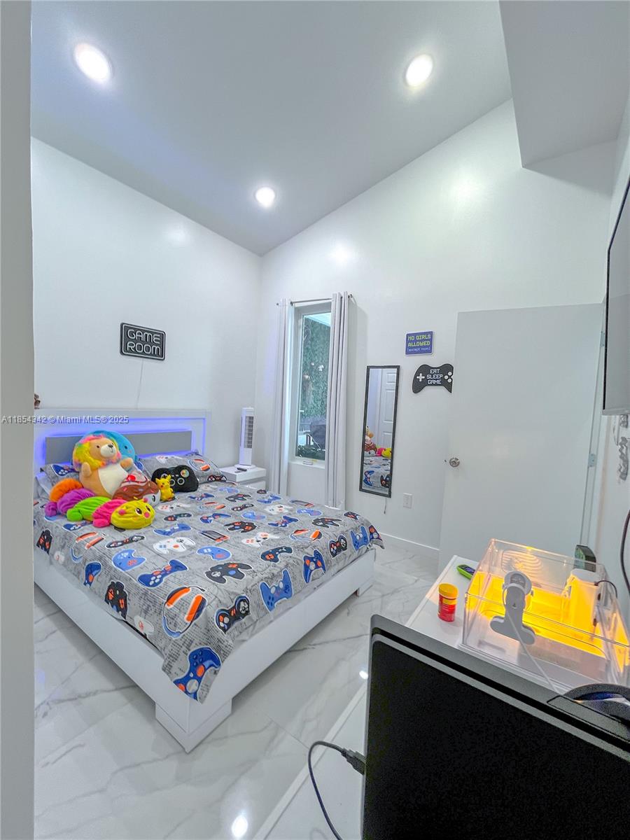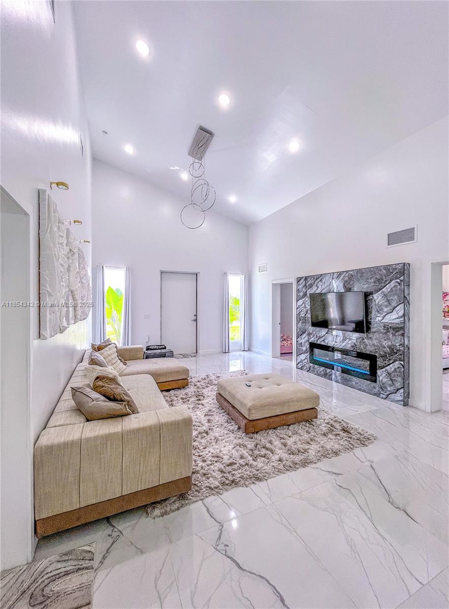 Architecturally distinctive modern home with soaring 18-ft ceilings. The only new-build in Lehigh under a half-million to offer a pool! Tall impact windows fill the open plan in natural light, while large-format tile grounds every room. Unlike typical builds, this home has full CBS construction—including interior walls—for enhanced soundproofing and superior storm protection. Furnished living room, outdoor loungers, umbrellas, electric fireplace, RO system, security cameras, appliances, washer/dryer & finished closets all convey. 3-BD/2-BA plan + private den. Screened, covered patio holds full outdoor kitchen; beyond, a 12×28 travertine-decked pool with tanning ledge invites effortless indoor-outdoor living. Oversized 2-car garage, broad drive, generous fenced lot. No HOA. Ready now.