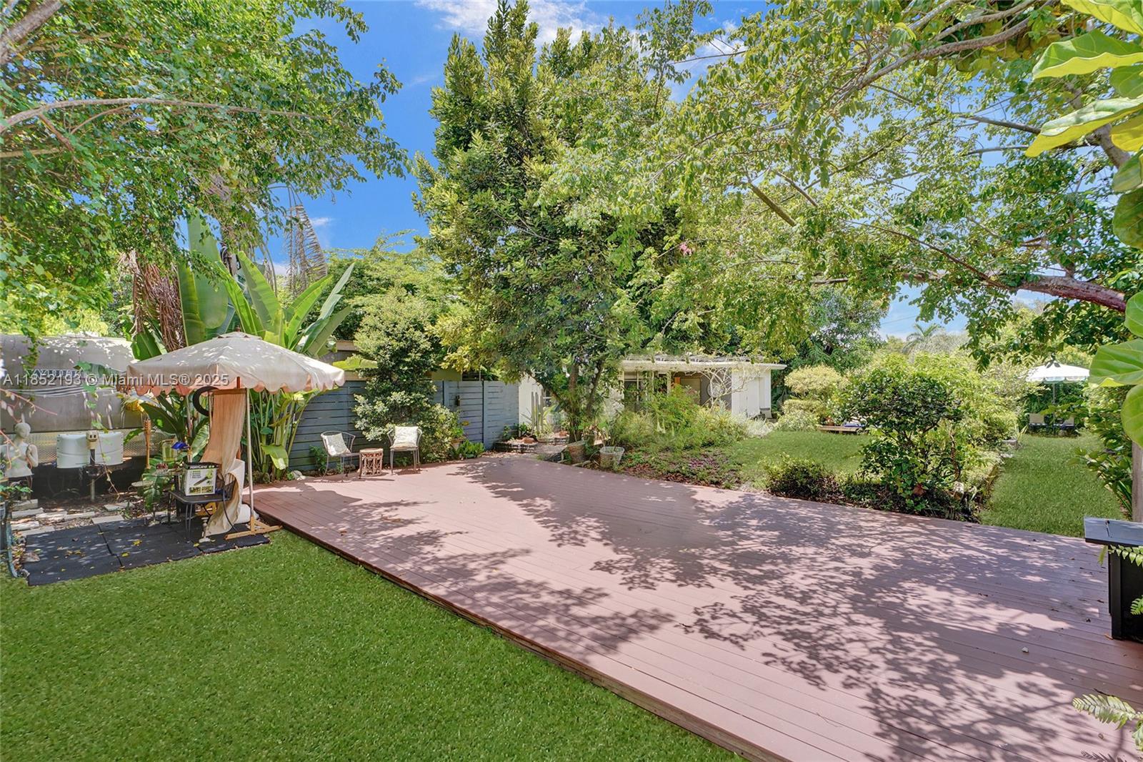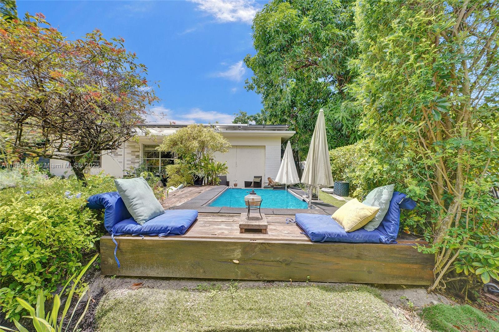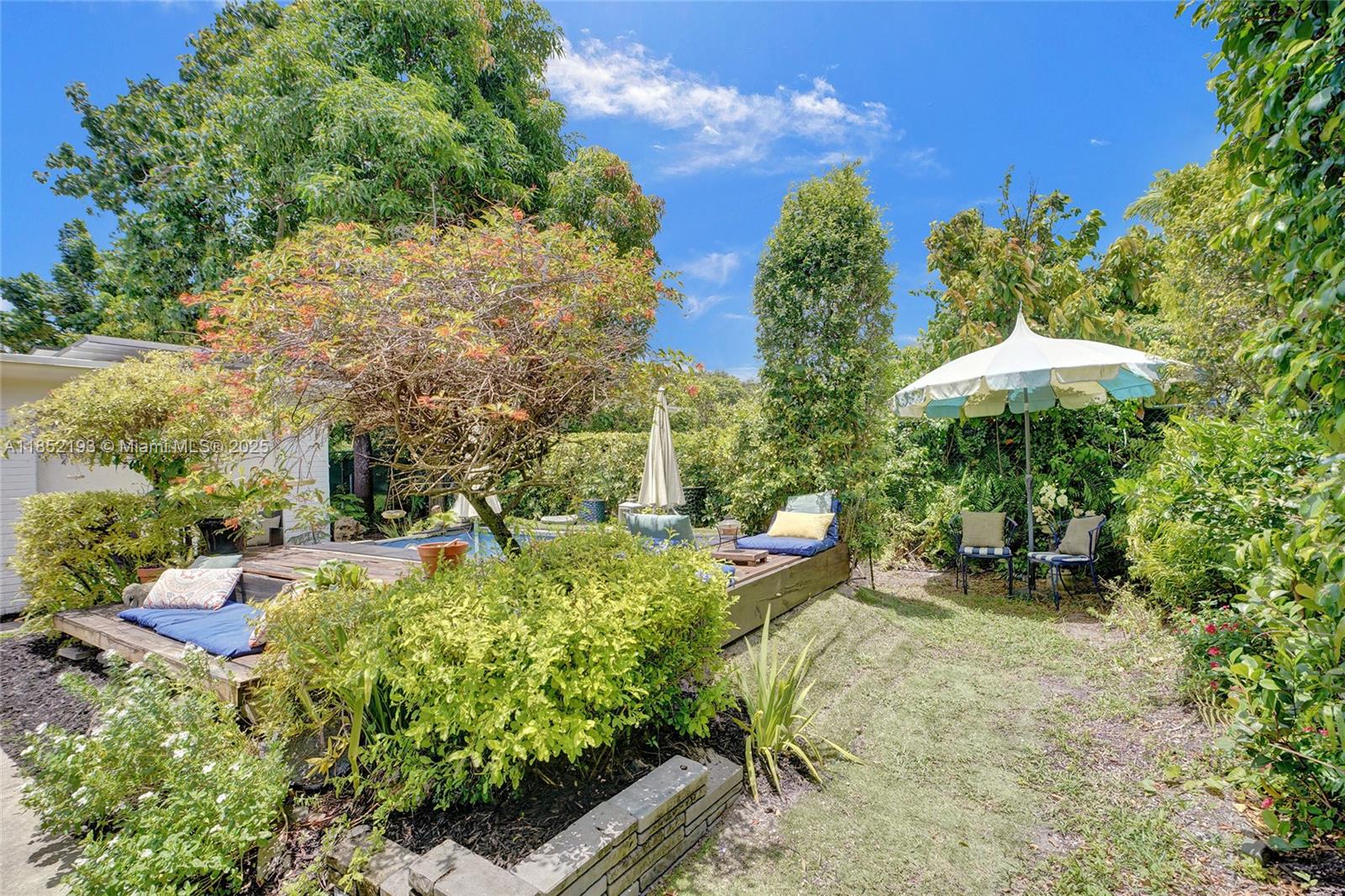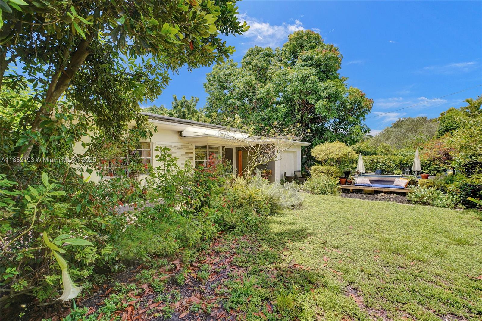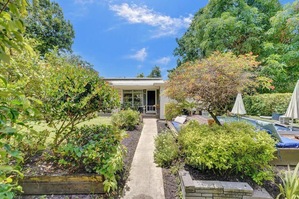 Lush mid-century 2BR/1BA+ large garage on oversized lot in quiet, flood-free Miami enclave. Immersed in a hand-planted butterfly, bee & bird sanctuary w/15+ mature edible trees incl. mango, lychee, macadamia, avocado, starfruit & bay leaf. Privacy—green views from every window, no shades needed! Solar panels, terrazzo flrs, vintage Cuban tile & cedar-beamed ceiling. Cocktail pool. Yoga deck, meditation path, Japanese garden & screened Orchid House ideal for guests. Expansive front feels like a private park perfect for entertaining. Extra drvwy fits RV/boat w/ W+E—rental/income potential. Skylit kitchen, scullery/mini kitchen, cozy guest BR & airy porch. Former wellness retreat w/room for permaculture or dream pool. Rare opportunity to own serene green space just mins from city action