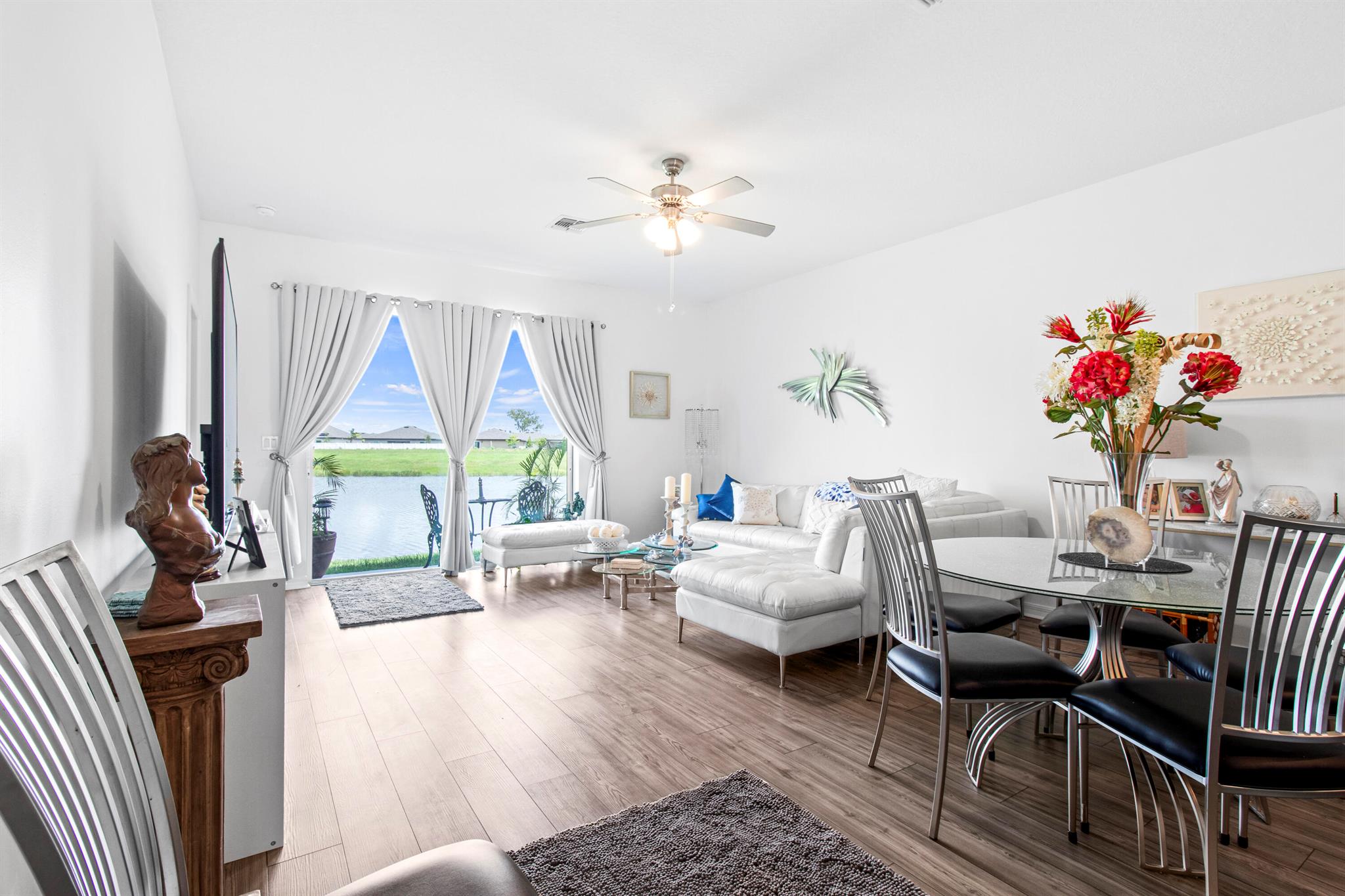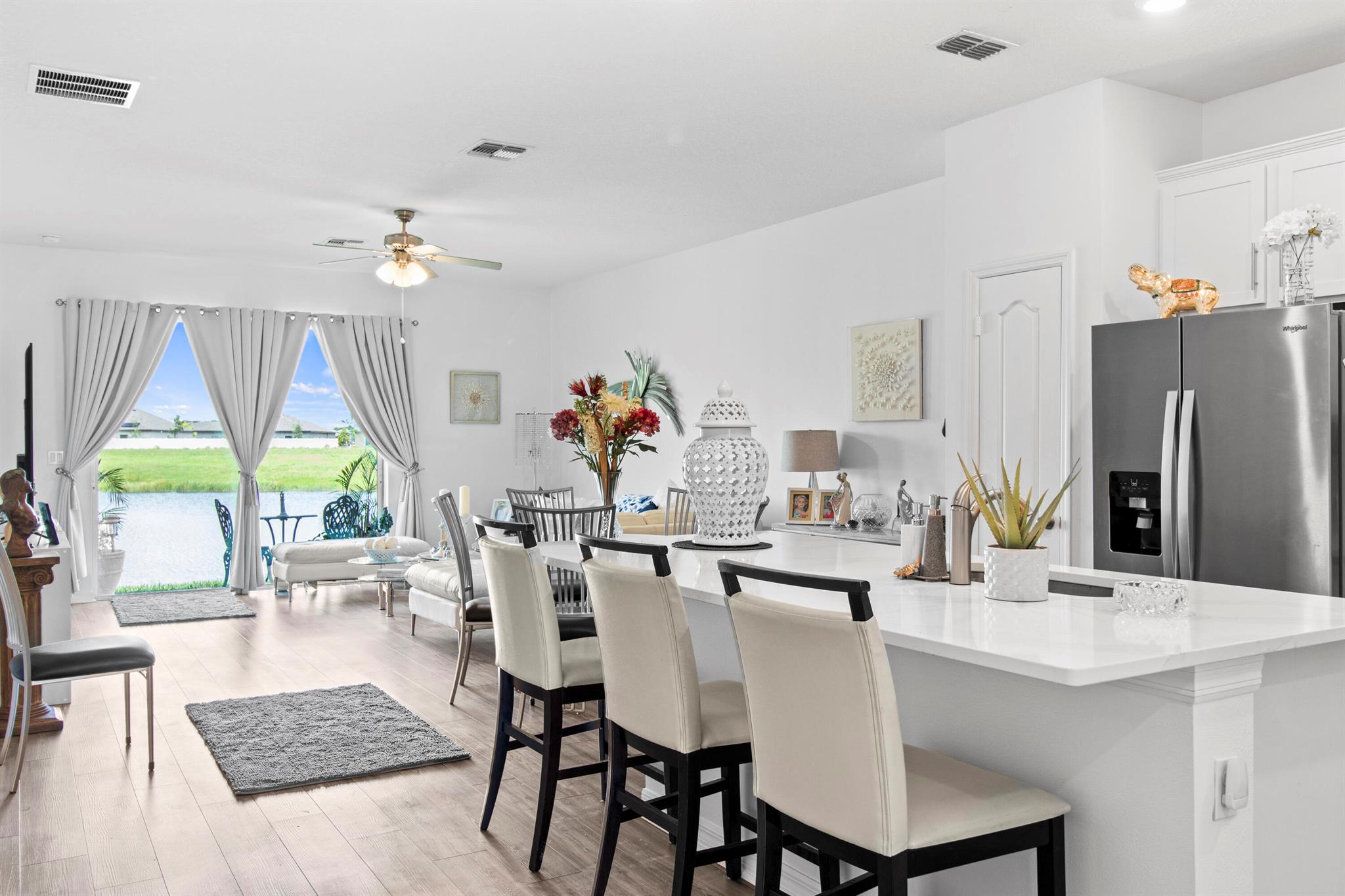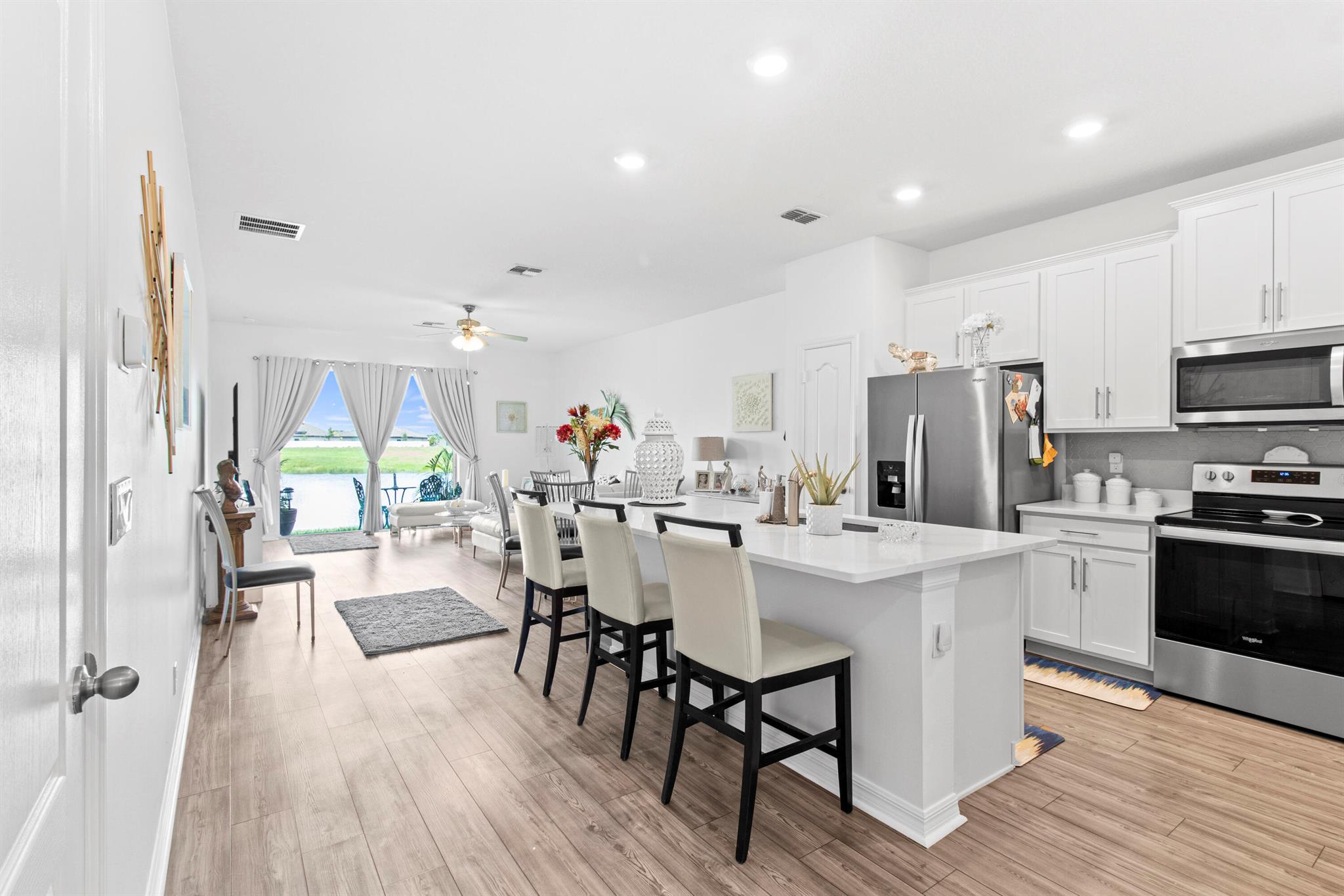 This beautifully designed 3-bedroom, 2-bath waterfront home welcomes you with a bright, open floor plan. From the moment you walk in, the water view is the first thing you notice. The layout keeps the living, dining, and kitchen areas connected, creating a space that works just as well for quiet mornings as it does for hosting friends.