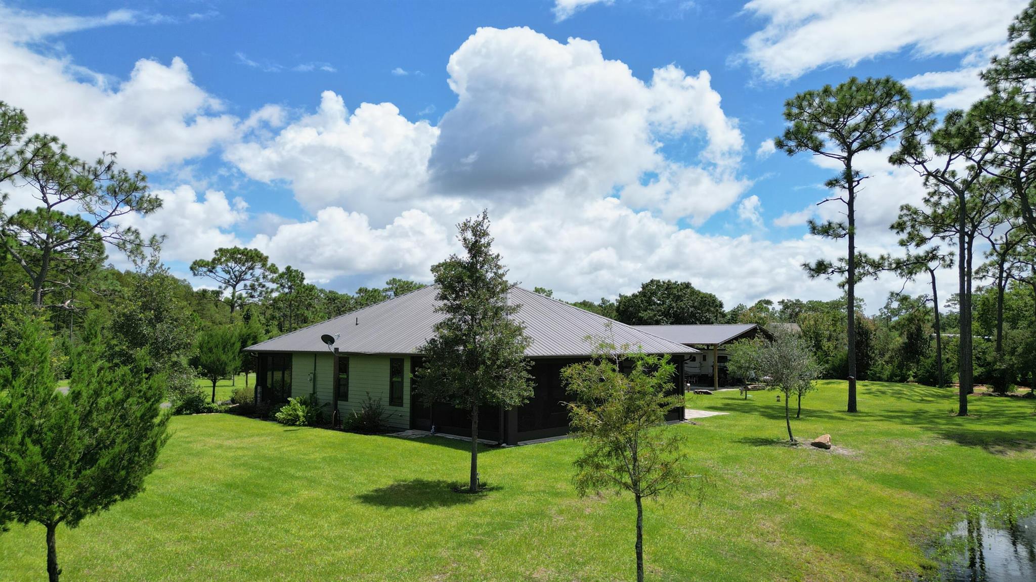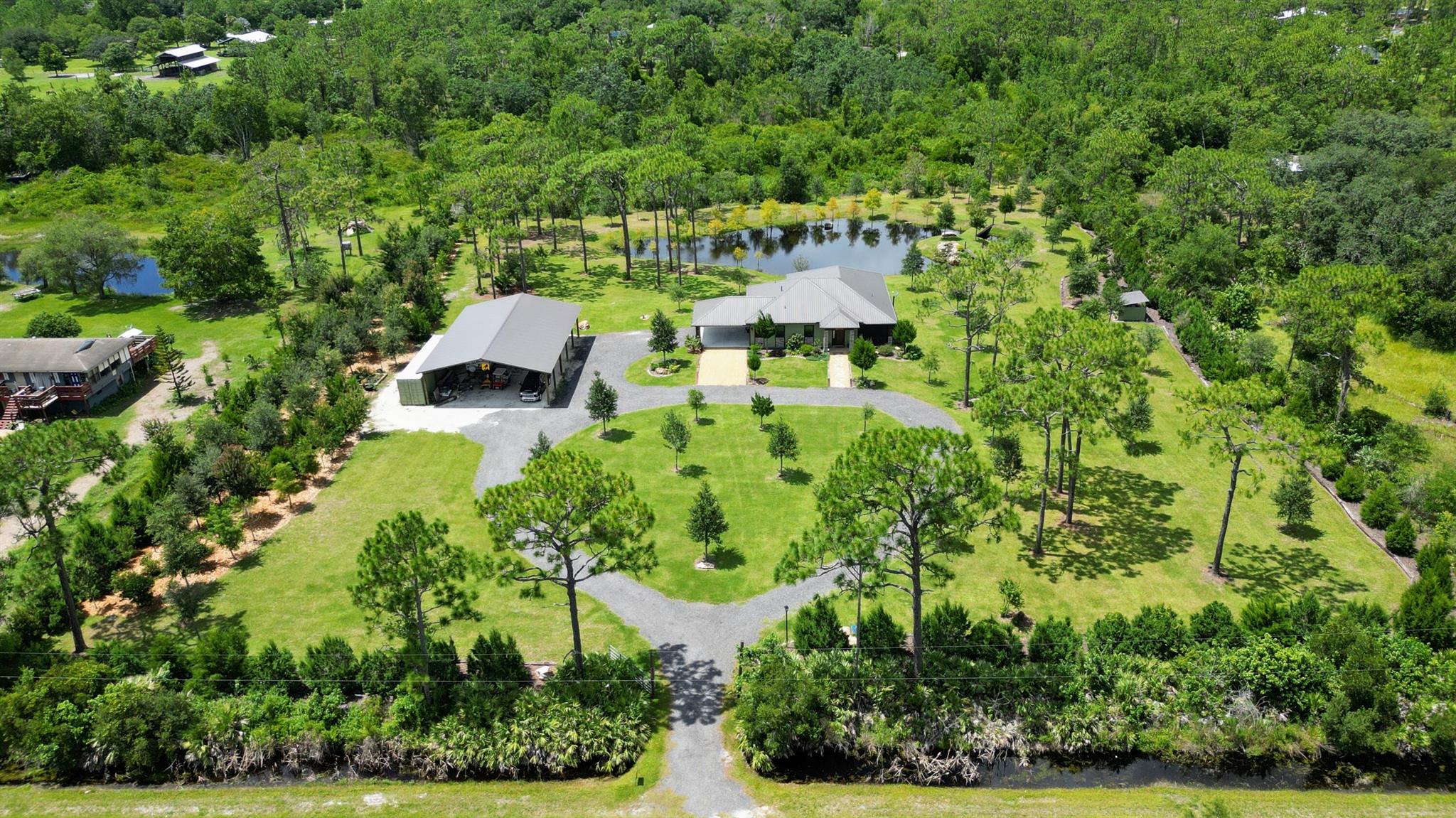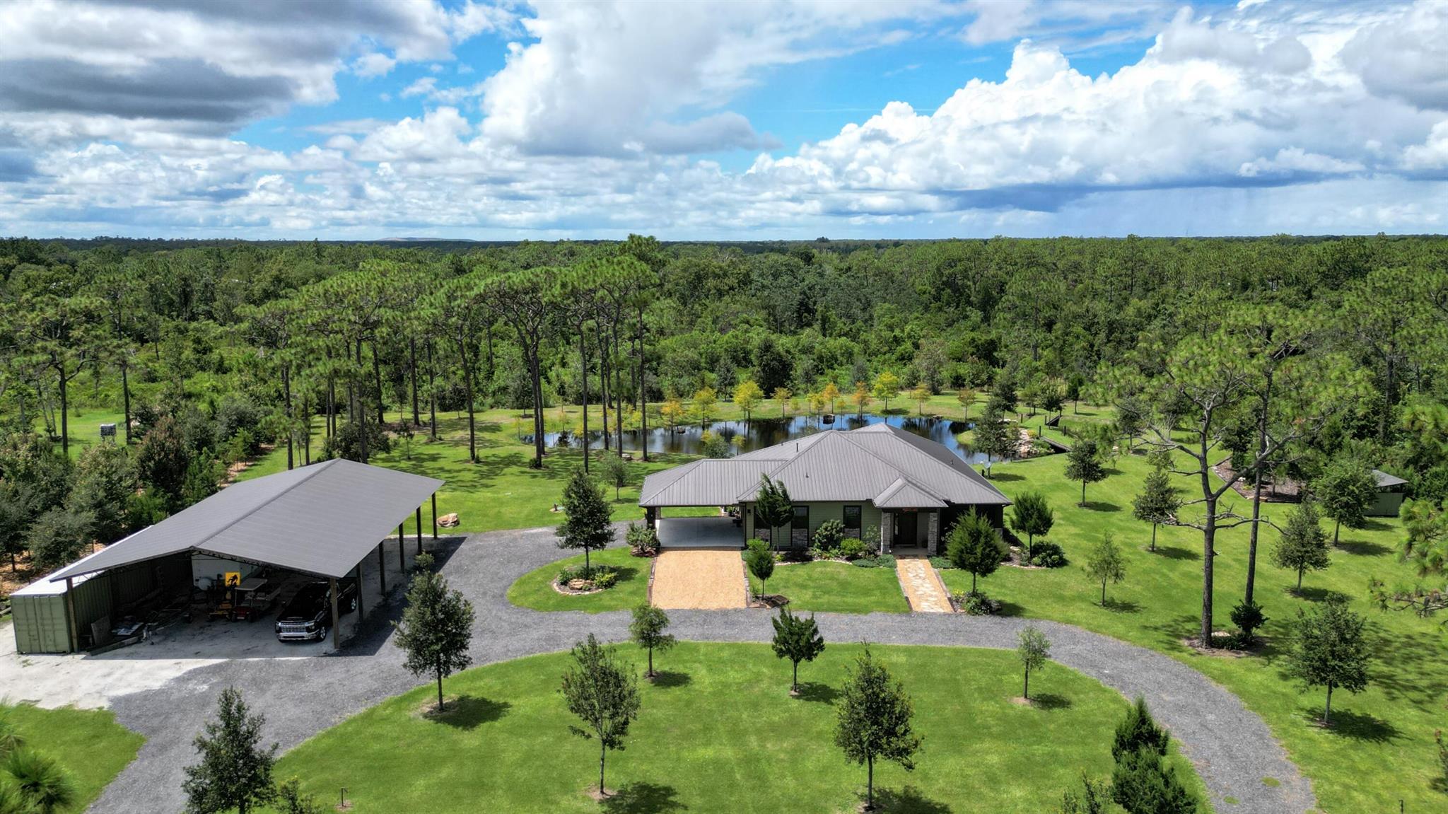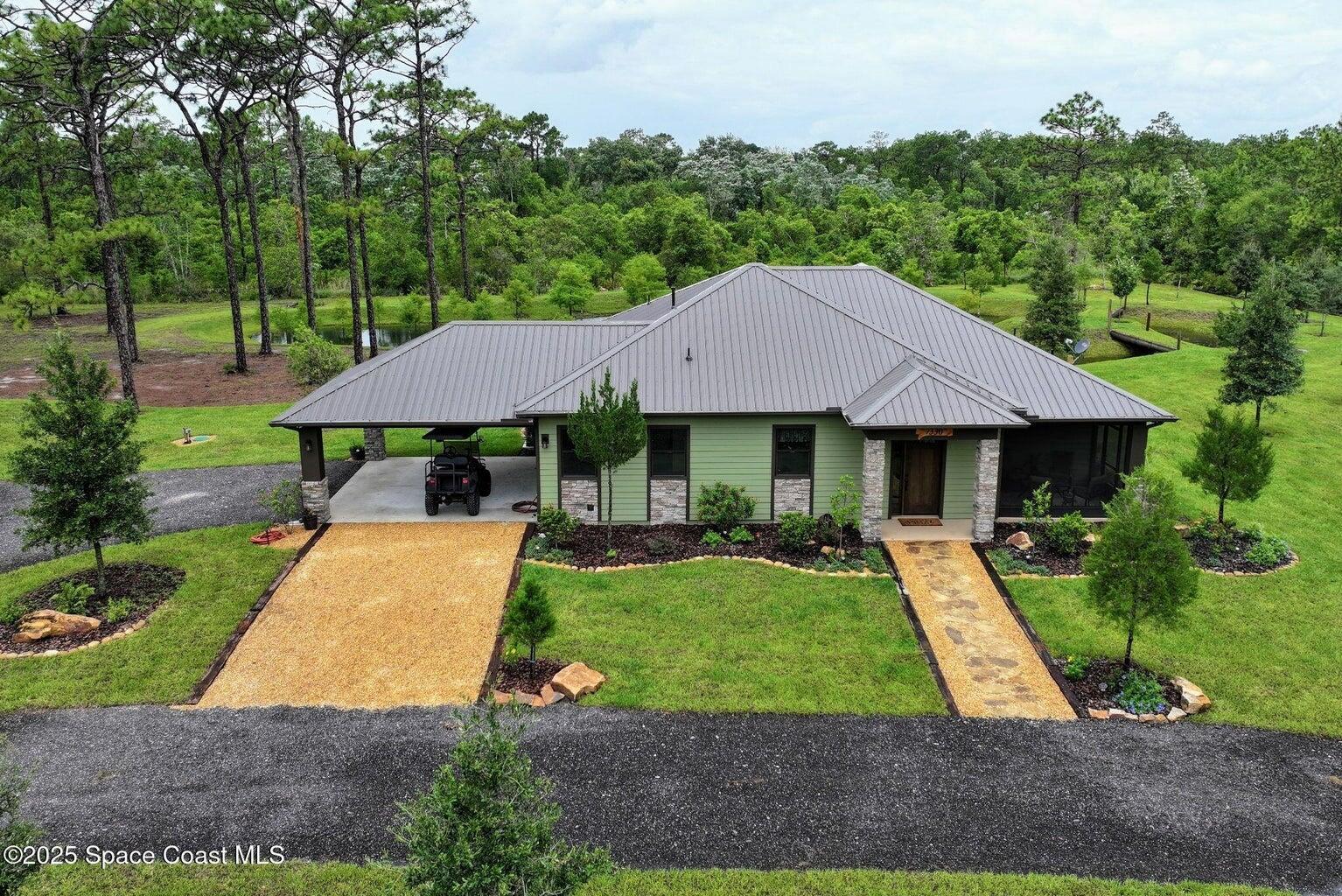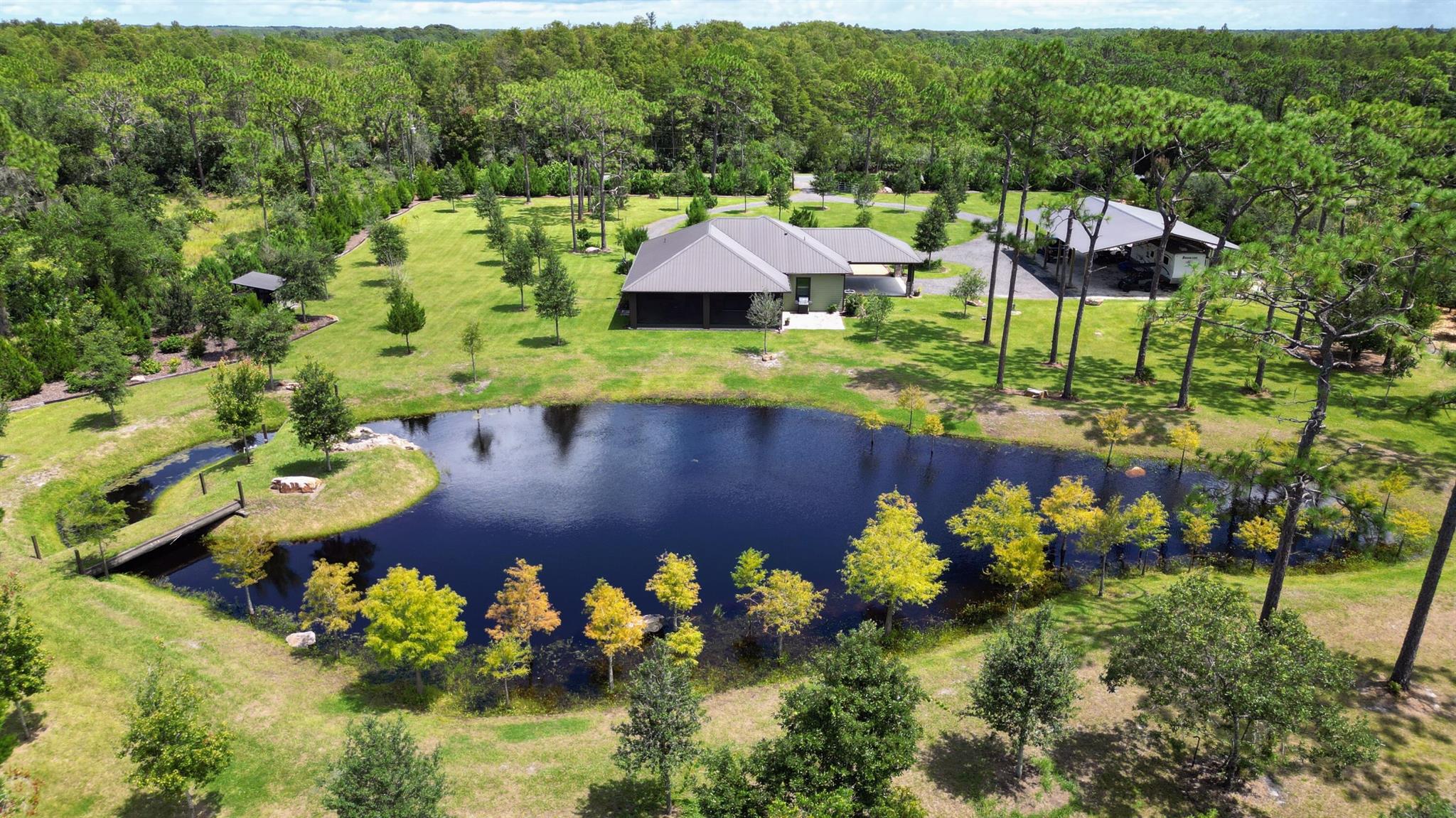 Discover peaceful seclusion in this custom CBS two bedroom two bathroom split floor plan home on five private acres. A pond with an island, waterfall, and land bridges creates a serene retreat. Beetle kill pine adds natural warmth throughout the interior and triple sliding doors open to relaxing views. The kitchen and baths feature granite counters and knotty pine accents. The primary bath offers a walk in shower and the guest bath includes a deep soaking tub. An oversized flex space holds laundry and includes a built in dog wash station. A forty by sixty pole barn, two RV hookups, room to expand, more than three hundred trees, and frequent wildlife sightings complete this private setting near the Space Coast and Orlando attractions.