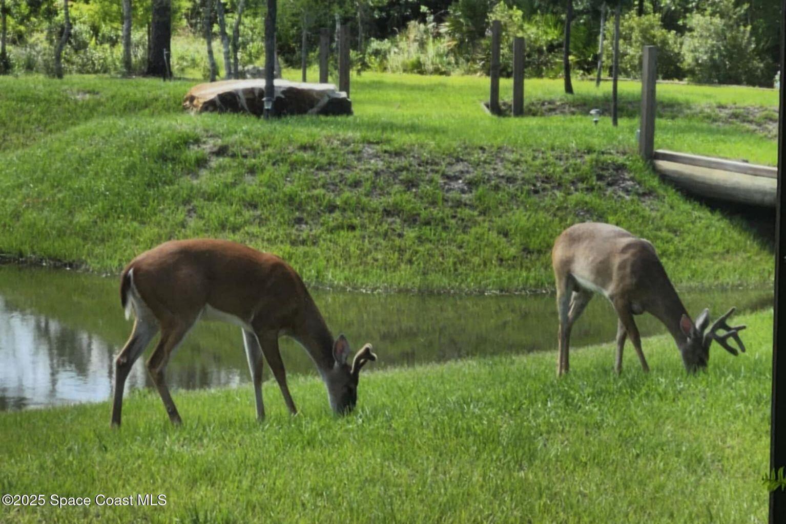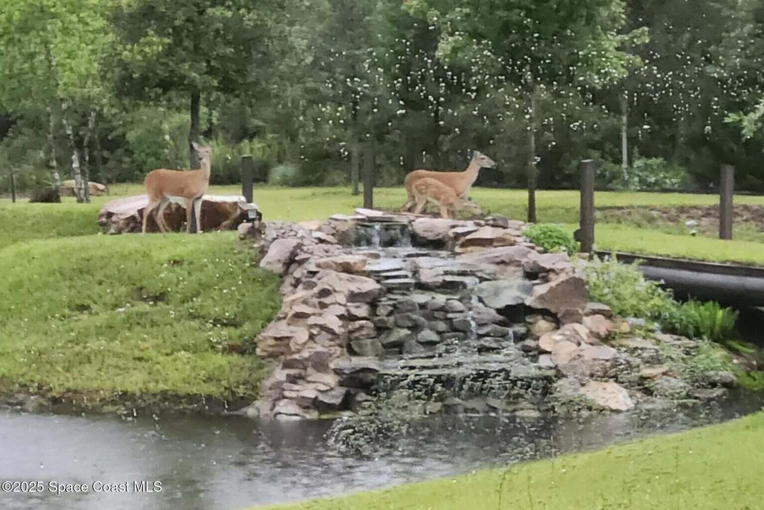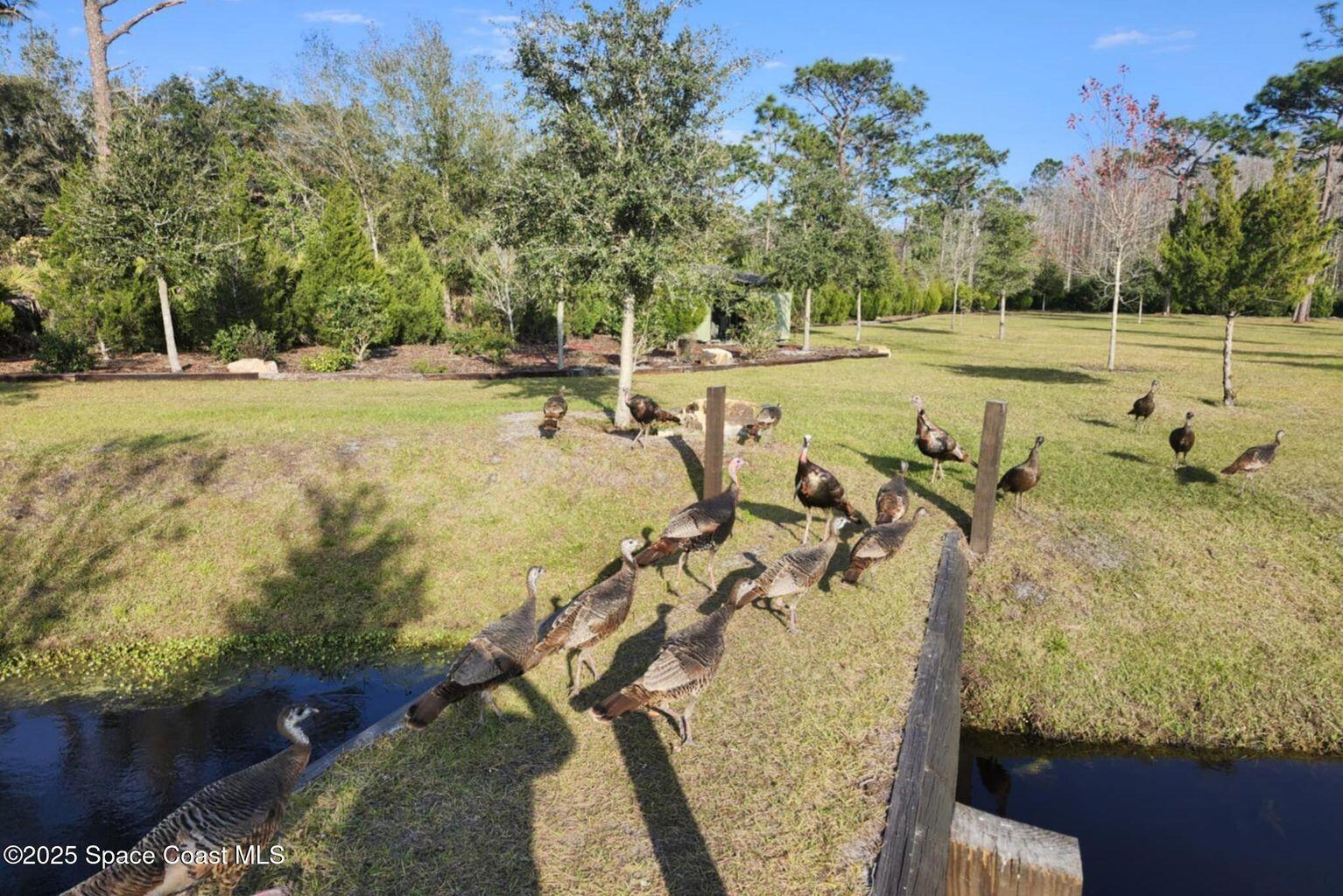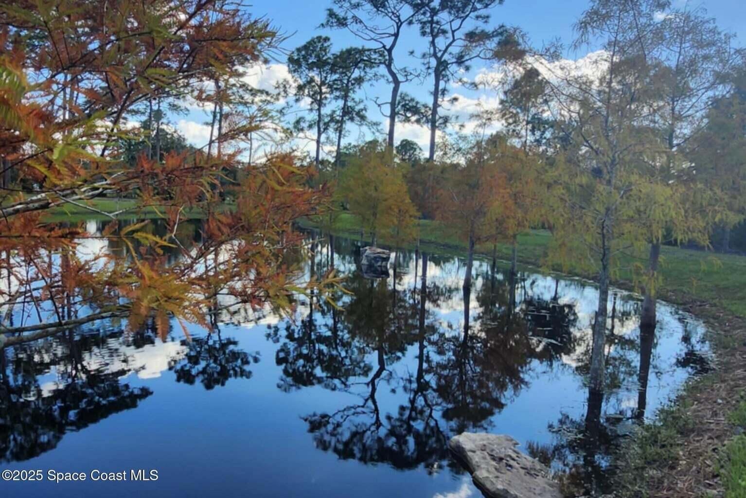 Discover peaceful seclusion in this custom CBS two bedroom two bathroom split floor plan home on five private acres. A pond with an island, waterfall, and land bridges creates a serene retreat. Beetle kill pine adds natural warmth throughout the interior and triple sliding doors open to relaxing views. The kitchen and baths feature granite counters and knotty pine accents. The primary bath offers a walk in shower and the guest bath includes a deep soaking tub. An oversized flex space holds laundry and includes a built in dog wash station. A forty by sixty pole barn, two RV hookups, room to expand, more than three hundred trees, and frequent wildlife sightings complete this private setting near the Space Coast and Orlando attractions.