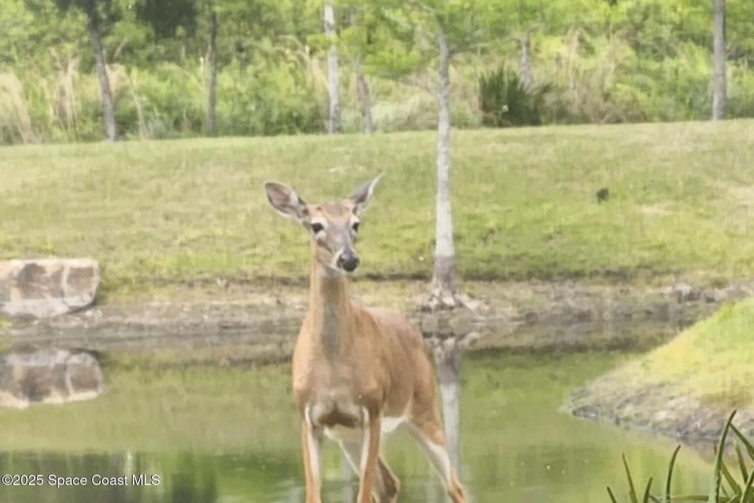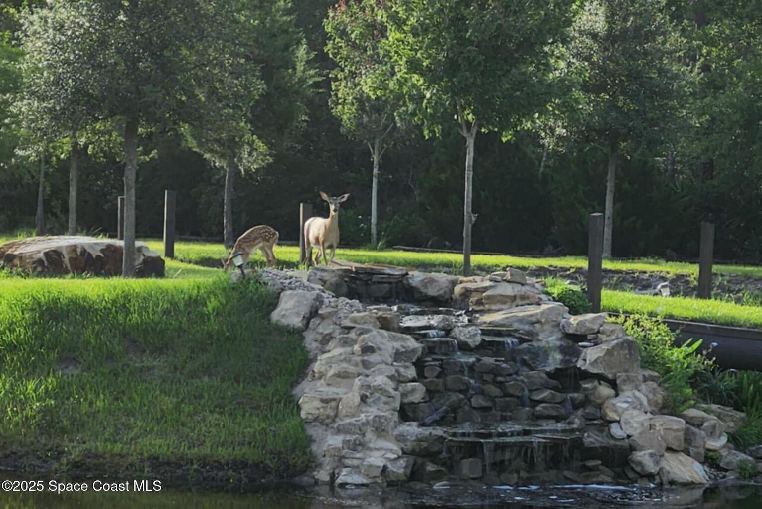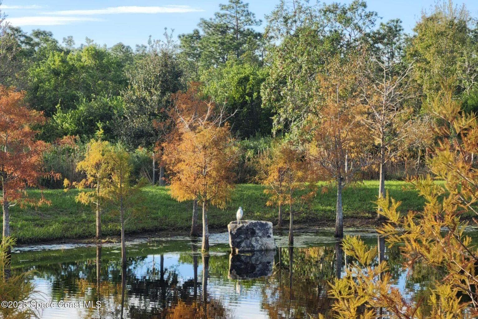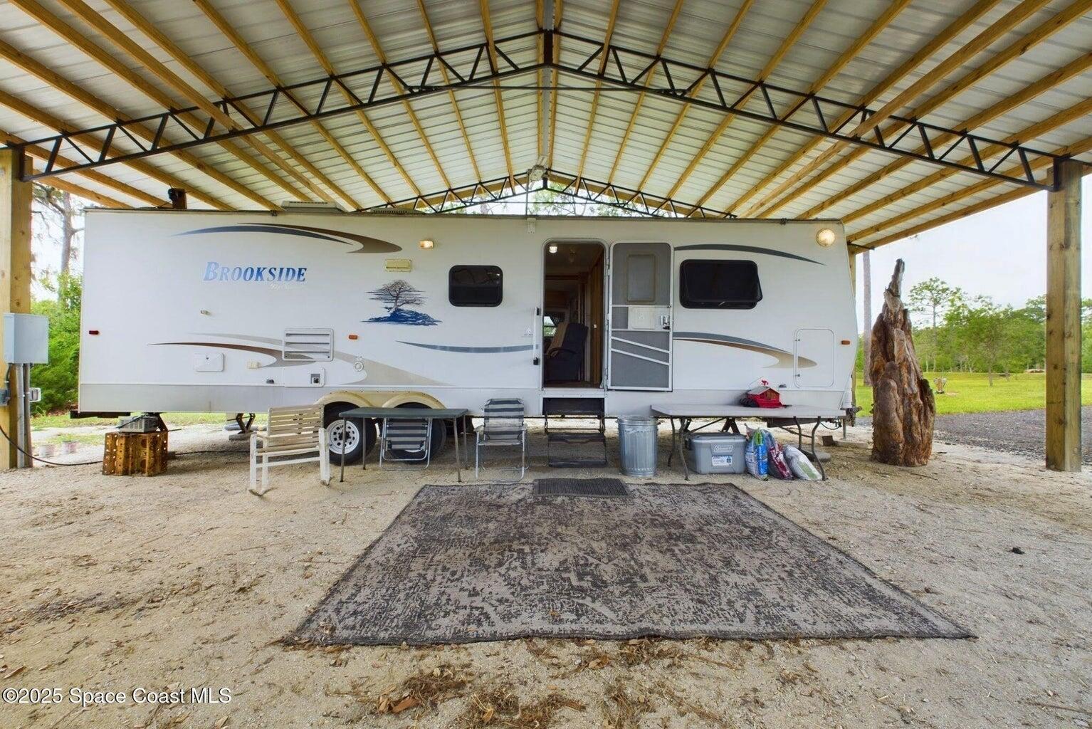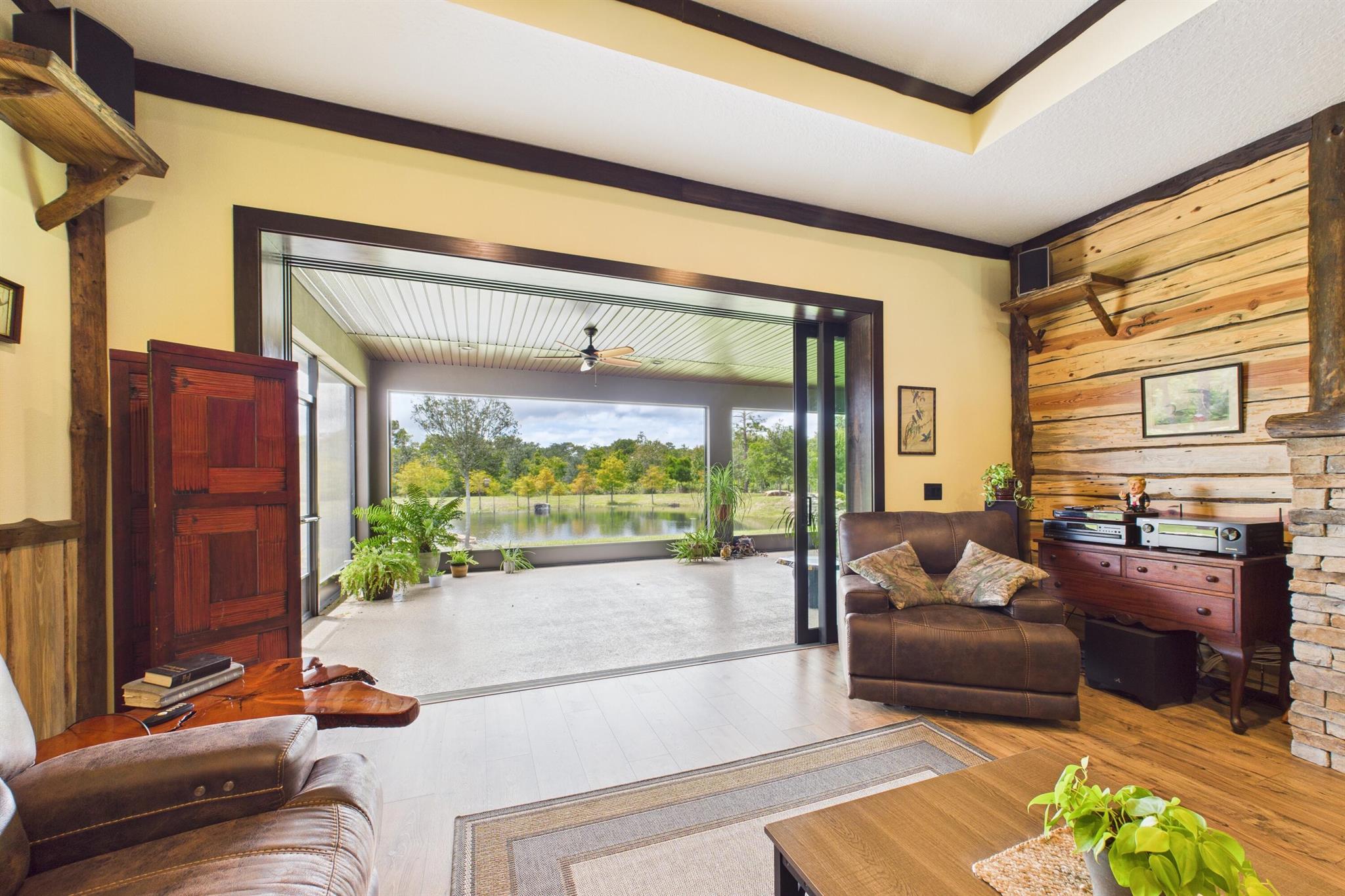 Discover peaceful seclusion in this custom CBS two bedroom two bathroom split floor plan home on five private acres. A pond with an island, waterfall, and land bridges creates a serene retreat. Beetle kill pine adds natural warmth throughout the interior and triple sliding doors open to relaxing views. The kitchen and baths feature granite counters and knotty pine accents. The primary bath offers a walk in shower and the guest bath includes a deep soaking tub. An oversized flex space holds laundry and includes a built in dog wash station. A forty by sixty pole barn, two RV hookups, room to expand, more than three hundred trees, and frequent wildlife sightings complete this private setting near the Space Coast and Orlando attractions.