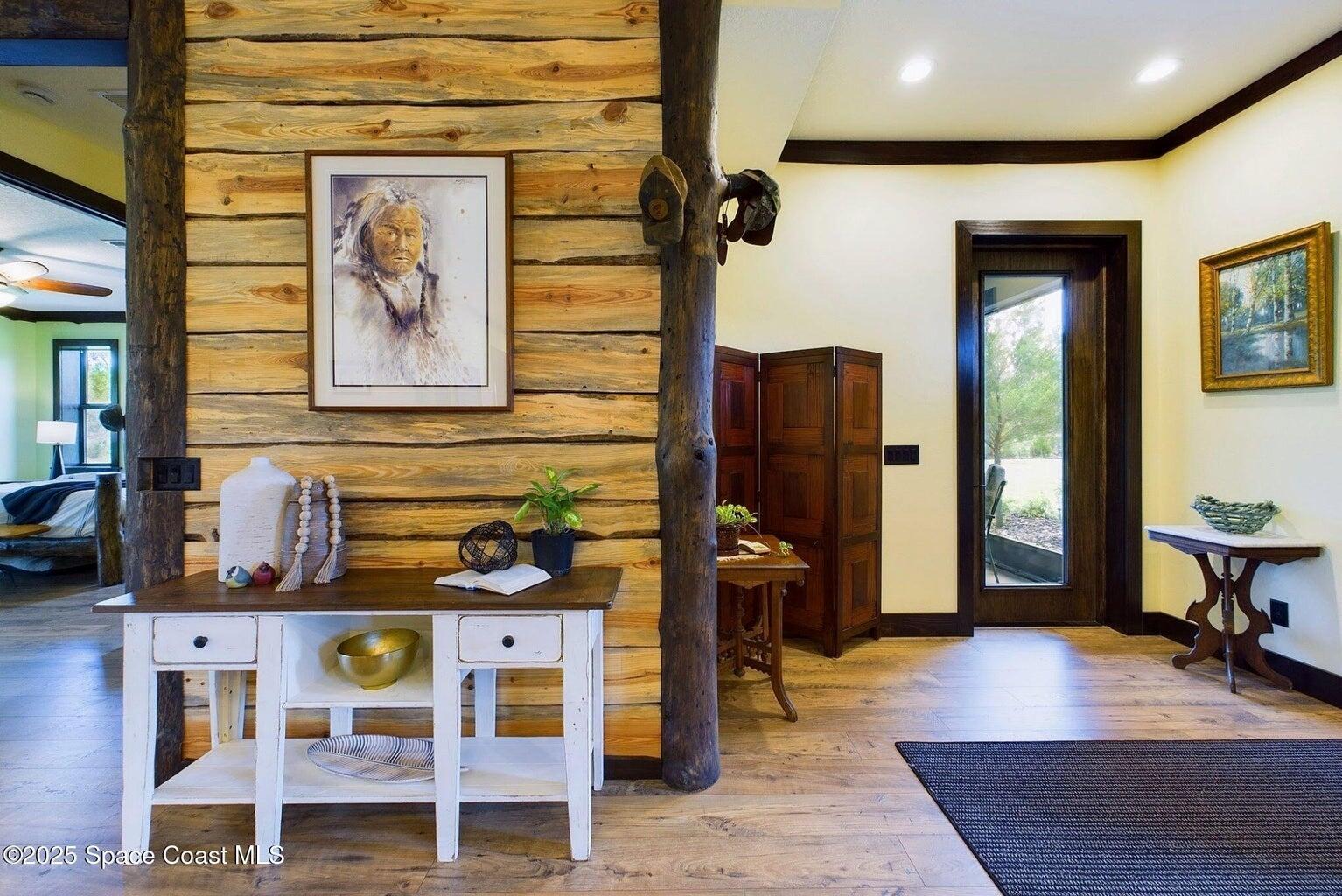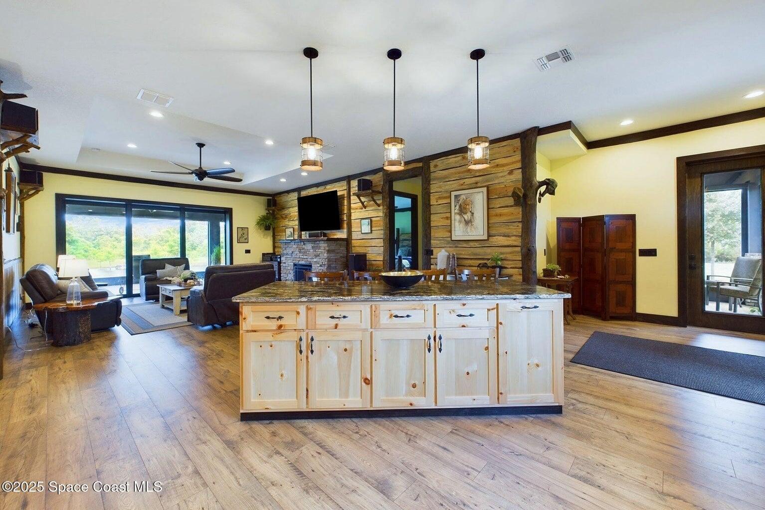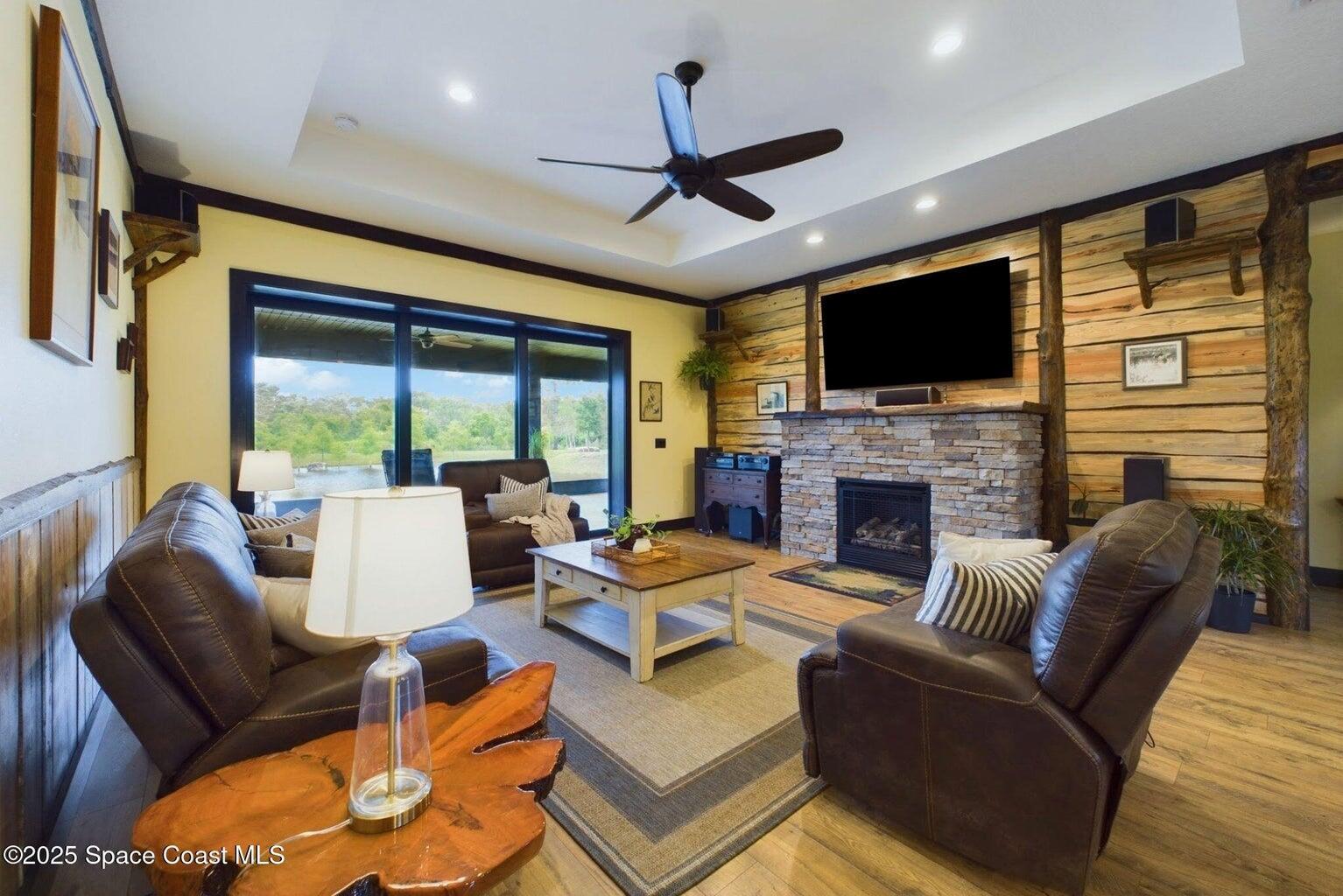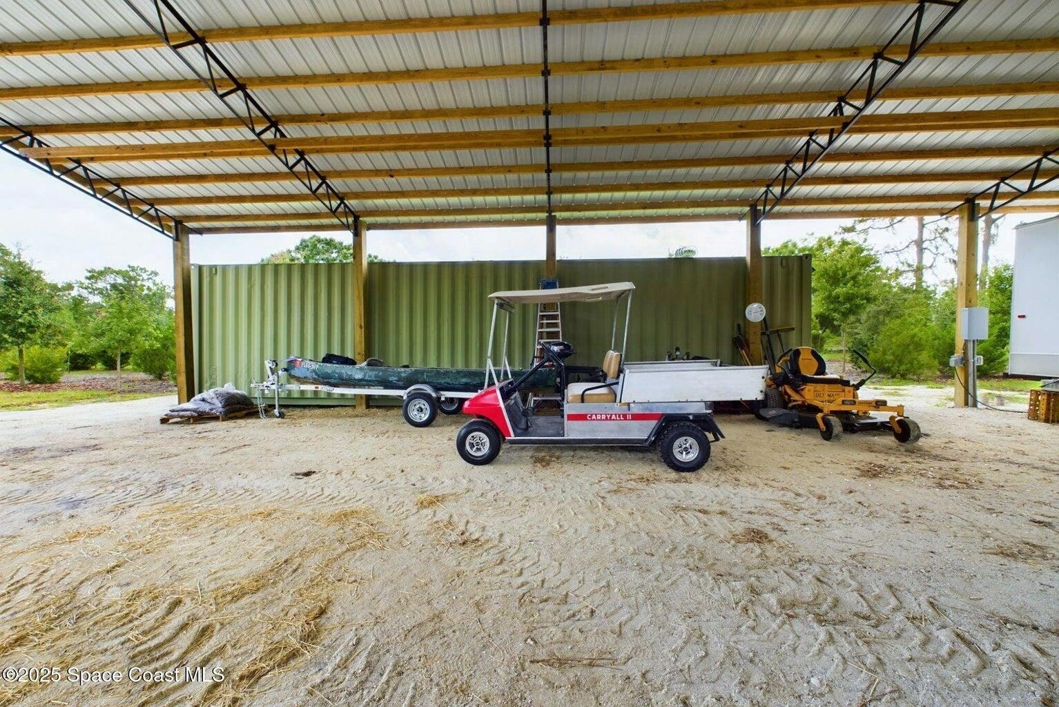 Discover peaceful seclusion in this custom CBS two bedroom two bathroom split floor plan home on five private acres. A pond with an island, waterfall, and land bridges creates a serene retreat. Beetle kill pine adds natural warmth throughout the interior and triple sliding doors open to relaxing views. The kitchen and baths feature granite counters and knotty pine accents. The primary bath offers a walk in shower and the guest bath includes a deep soaking tub. An oversized flex space holds laundry and includes a built in dog wash station. A forty by sixty pole barn, two RV hookups, room to expand, more than three hundred trees, and frequent wildlife sightings complete this private setting near the Space Coast and Orlando attractions.