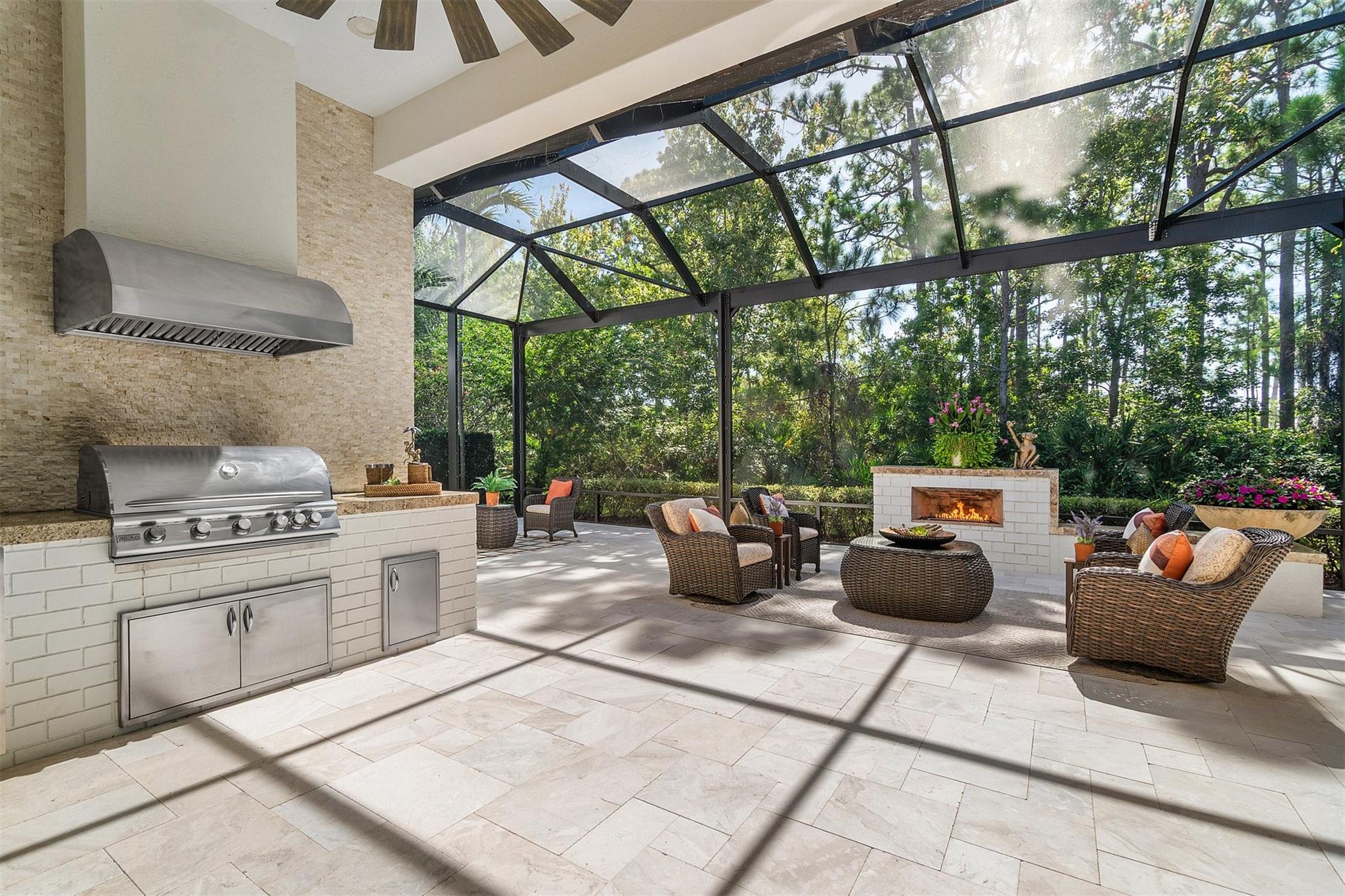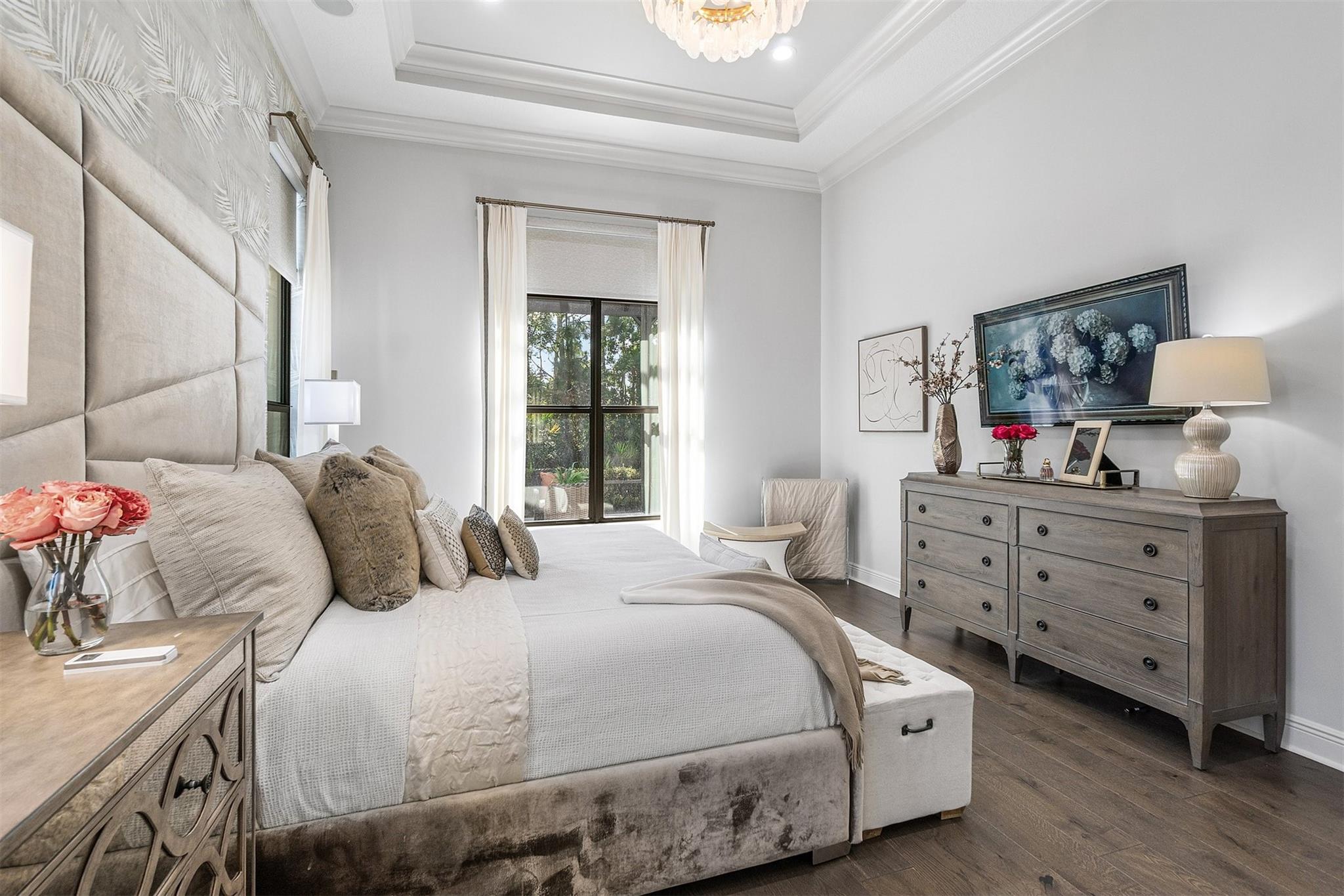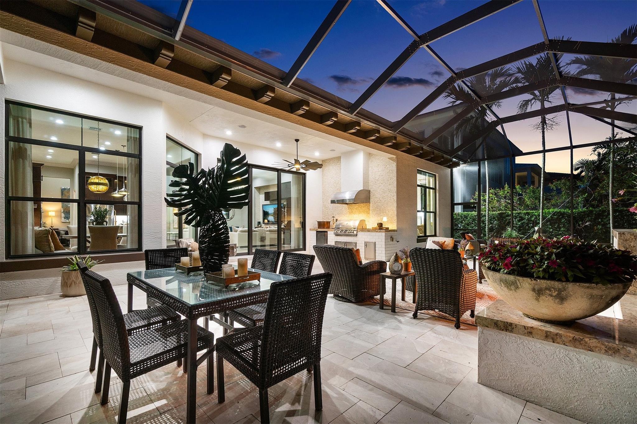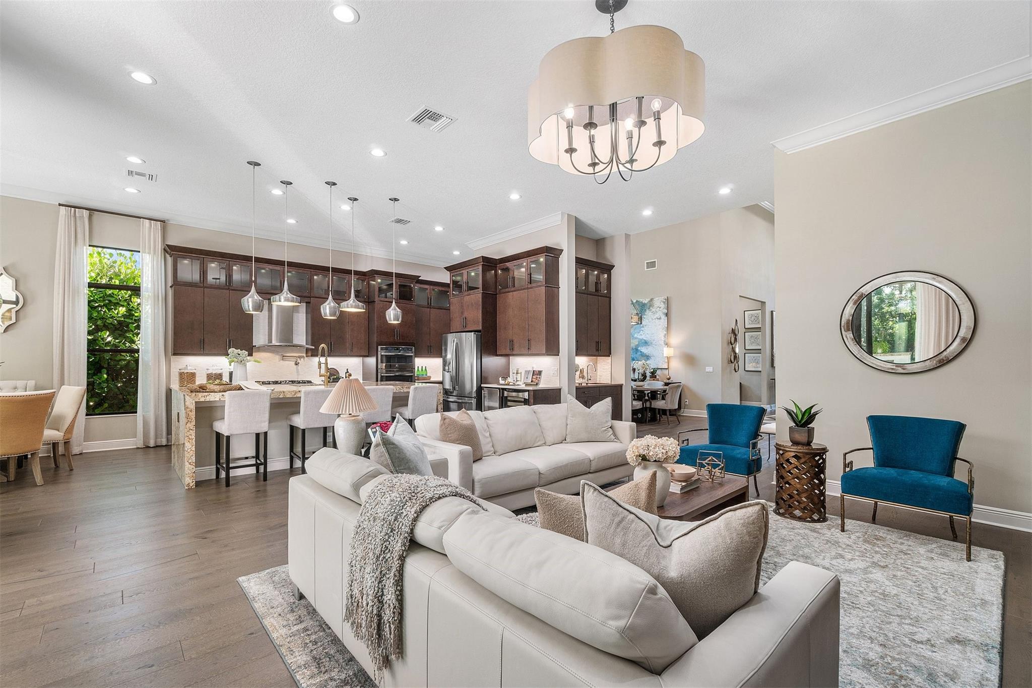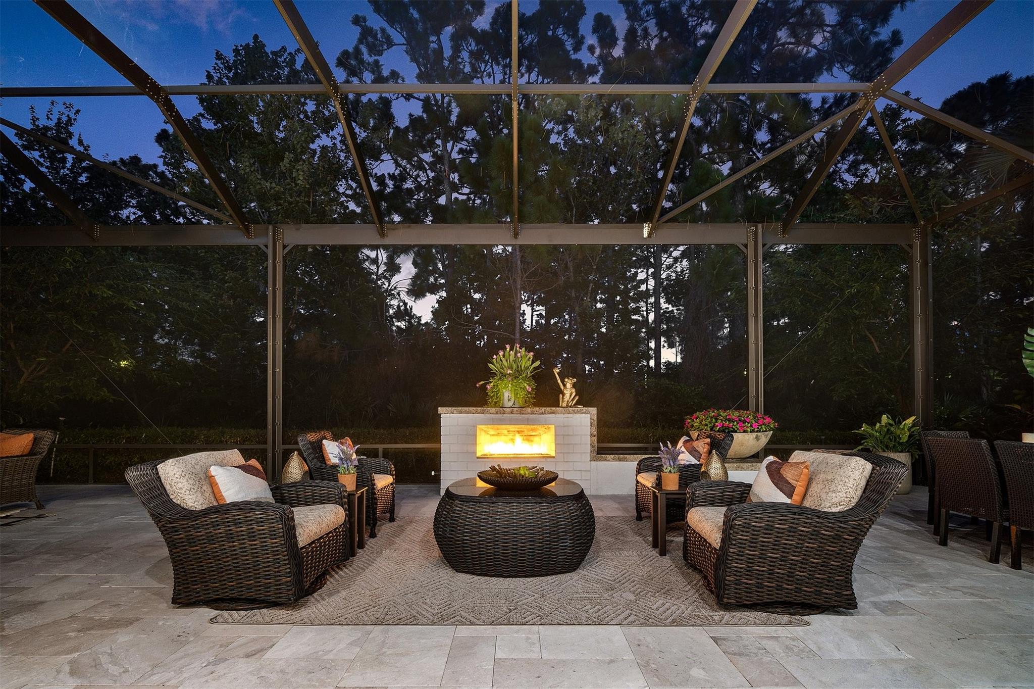 Offered Fully furnished and accessorized. Welcome to 1046 Faulkner Terrace - where designer upgrades, high end furnishings create a unique and elevated Florida lifestyle This former builder’s model stuns at every turn with over 2,800 sq ft of expertly curated interiors on a private preserve and corner lot. From the travertine-inlaid foyer with a beamed 19.5-foot ceiling, no detail was overlooked. The gourmet kitchen features a dramatic waterfall island, double-stacked KitchenCraft cabinetry with glass uppers and puck lighting, GE Profile appliances, and a pot filler over the 30" gas cooktop.