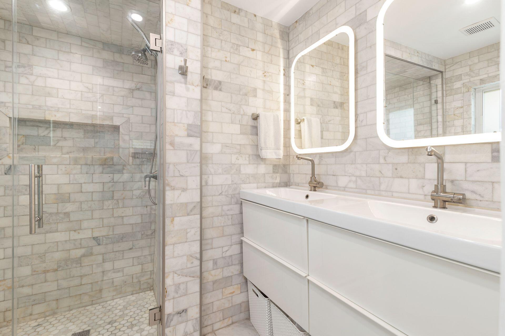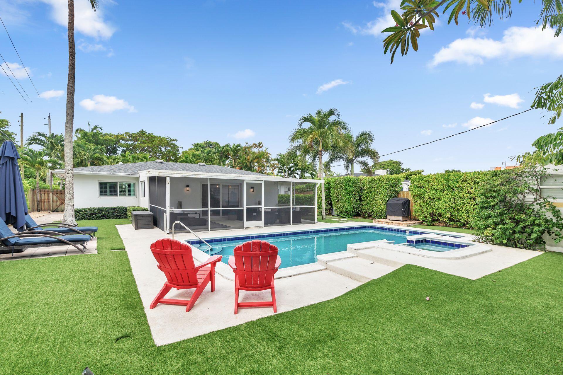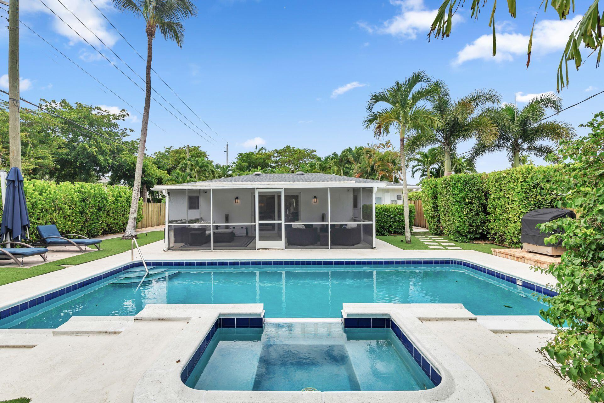 Welcome home! This turnkey and recently renovated 3 bedroom, 2 bathroom home with a heated swimming pool and spa is move-in-ready. Focused on space planning while renovating, the home now features a newly expanded kitchen and layout, new kitchen cabinets, appliances and laundry room. This charming home feels much larger than its 1,971 square footage and boasts full impact rated windows and doors as well as a 2019 roof, checking off all the insurance boxes. Walking in the front door, you will notice the cohesive tile floors throughout that lead you to the covered and screened in porch overlooking the large private backyard with mature Clusia hedges. Located in the Palm Beach Public elementary school district and close to area beaches, Flagler Drive bike path, City Place, fabulous dining