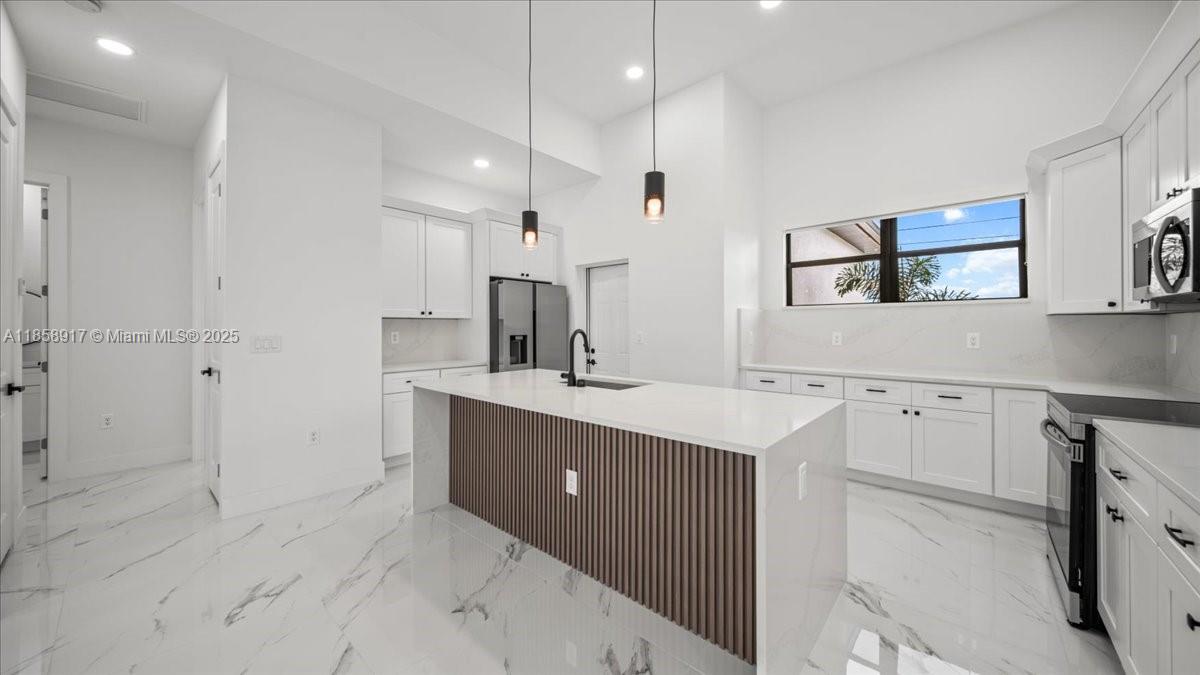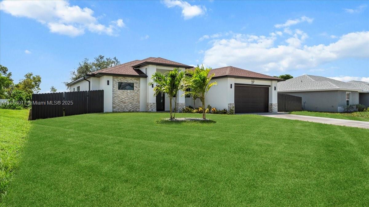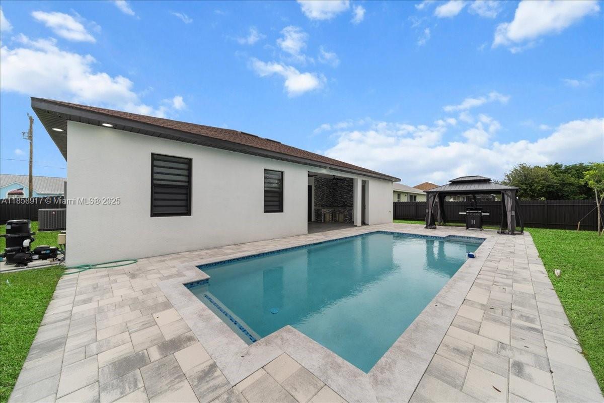 NEW CONSTRUCTION WITH POOL!!. Fenced throughout, this 4-bedroom, 3-bathroom residence offers 1,734 SQFT of living space and 2,568 SQFT of total area!!It features a beautiful saltwater pool with a convenient and spacious outdoor full bathroom, a spacious covered lanai, an outdoor kitchen with a sink and ample countertops with stainless steel cabinetry, a living room with high ceilings and ample space, and beautiful modern tile throughout.It features impact-resistant windows and doors and modern zebra-style window treatments.