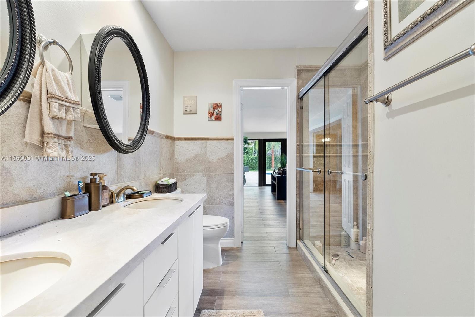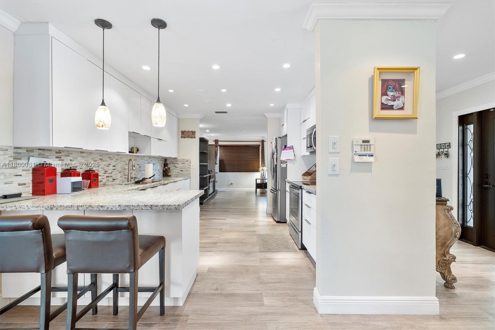 Lakefront living at its finest in Miami Lakes! Updated single-story 5BR/3BA on oversized 25,087 sqft lot. The last home on a private cul-de-sac offers privacy, security & water views. Fully renovated throughout, with all rooms & baths updated. Open layout features wood-look tile, crown molding, recessed lighting & glass doors overlooking the pool & Lake Martha. Remodeled kitchen includes white cabinetry, granite, stainless steel & breakfast bar. Impact windows & dual A/C units ensure comfort & efficiency. Outdoors features pool with lake views, large paver deck, covered patio & private dock — ideal for relaxing or evening sunsets. Oversized paved driveway fits 5+ cars, 2-car garage & lush landscaping. Near Main Street restaurants, shops, top-rated schools & parks.