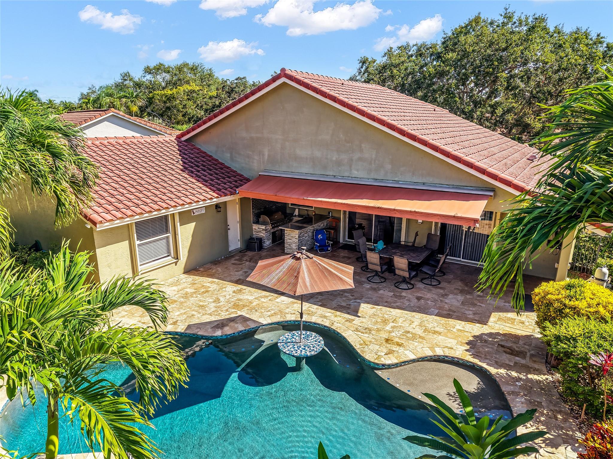 Seller spared no expense creating this home’s outdoor paradise: a redesigned pool w/ pebble finish, sun shelf, lounge benches, umbrella w/ in-pool table seating, travertine patio. Chef’s outdoor kitchen w/ built-in grill, stove, quartzite bar, large covered patio, & electric awning. Professional landscaping & huge plush fenced yard completes the resort-style setting. Inside, this 4BR/2.5BA home features vaulted ceilings, spacious family & dining rooms, new flooring, and fresh paint. The remodeled kitchen offers granite counters, white cabinets, & glass backsplash. Updated baths include a master suite with dual closets and spa-style shower. 2012 roof, newer A/C, accordion shutters, and 2-car garage. Set on a private 1/3-acre fenced lot in a top Coral Springs community with A+ schools.