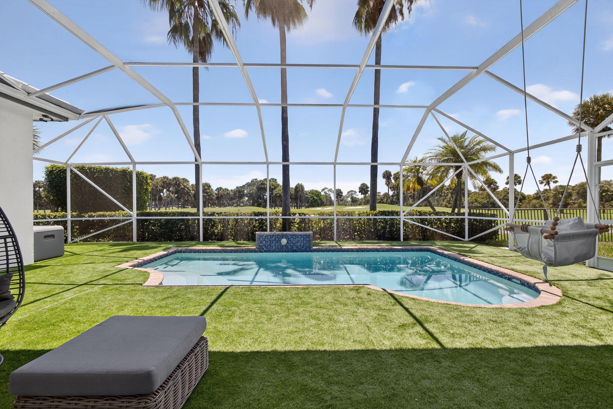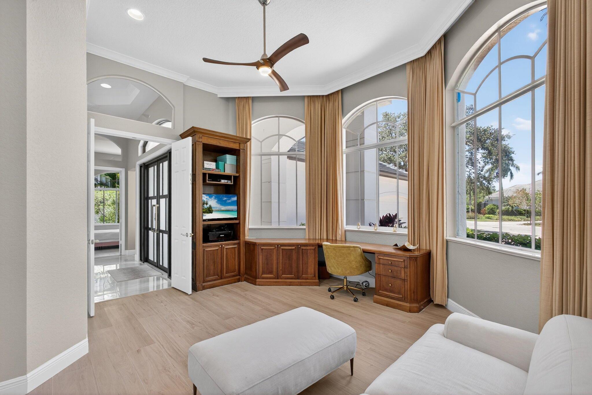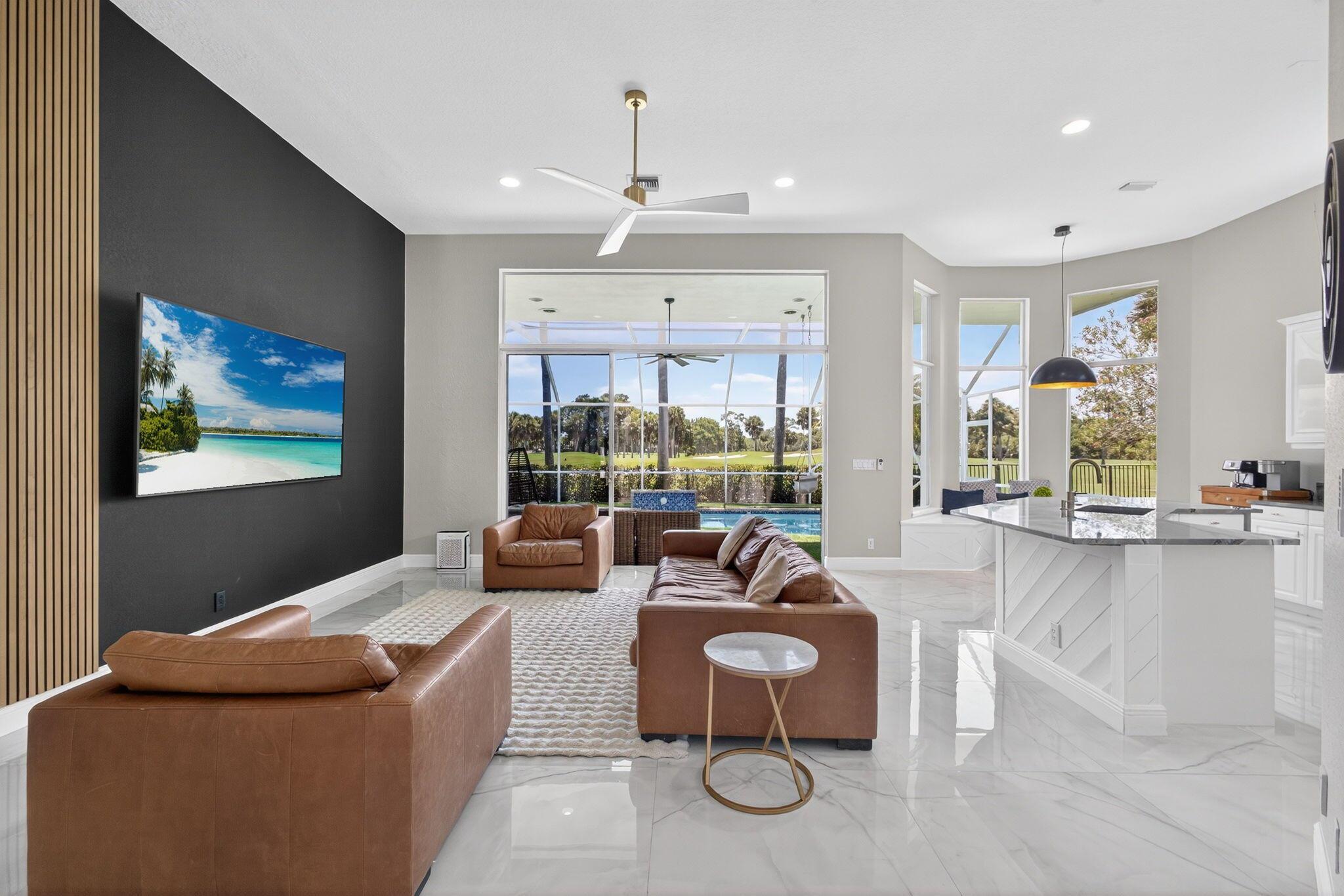 Set on a private cul-de-sac in the boutique Ironhorse community, this updated 4-bedroom, 4-bath ranch styled home offers panoramic views of the preserve, & the renowned Arthur Hills Championship golf course, with no mandatory membership. Be captivated by the 12-ft ceilings with abundant natural light, elegant new porcelain tile floors throughout, a brand-new roof (2024), new A/C, new pool heater, new water heater, new pool pump, new impact double front door, new tesla charger, new rock garden, extended driveway & fresh interior & exterior paint.The open-concept kitchen with quartz countertops, a built-in breakfast nook, & a shiplap-accented island, flowing into spacious living areas framed by custom wood panel media wall & sweeping golf views, while the primary suite boasts custom his &