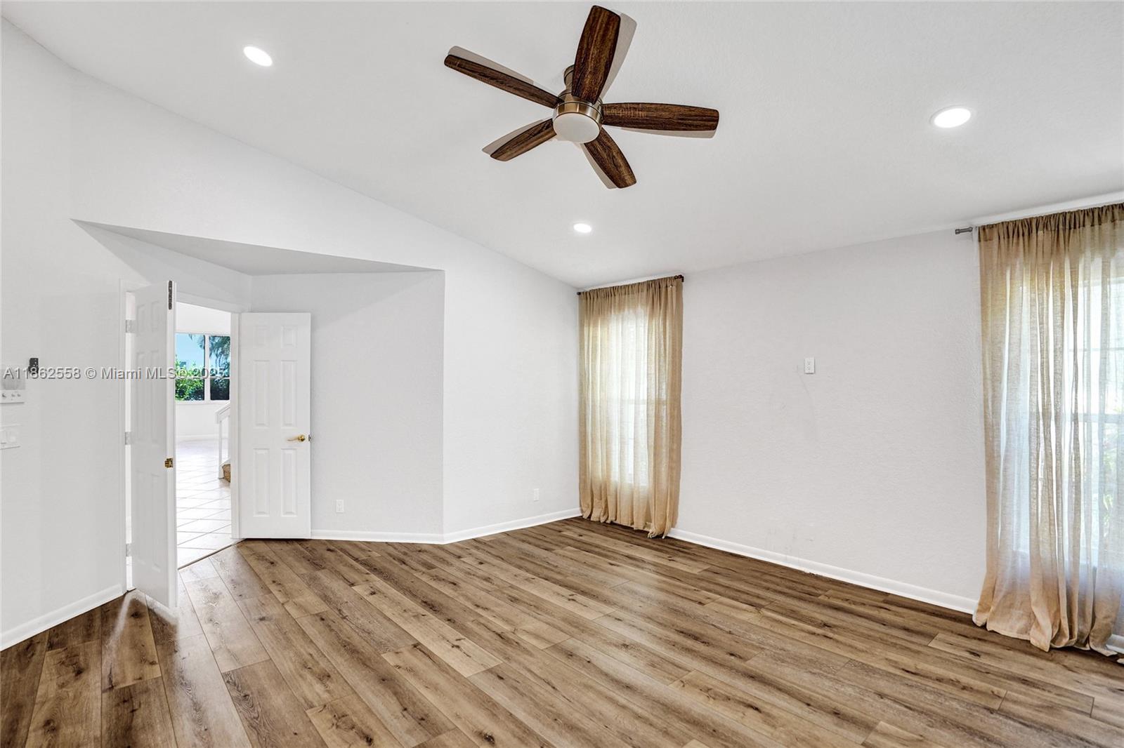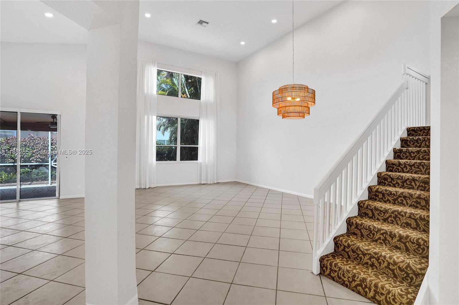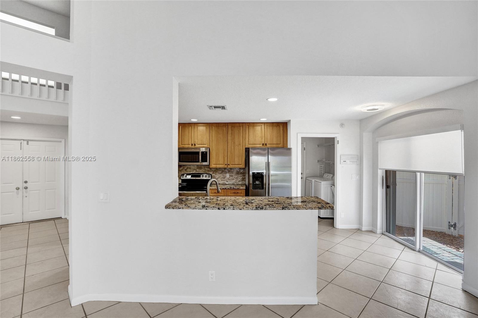 HURRY! NEW ROOF! Discover exceptional value in this updated 2-story home.This light & bright residence offers 3 bedrooms (desirable downstairs primary suite), a flexible built-in office/loft area, impressive volume ceilings with recessed LED lighting, tasteful off-white tile set on the diagonal, luxury vinyl flooring. The open-concept kitchen features 42'' light oak cabinetry, gleaming granite countertops, a marble tile backsplash, and stainless steel appliances, all complemented by a charming breakfast nook. Enjoy the convenience of updated bathrooms and a newer washer & dryer. Accordion hurricane shutters provide storm protection. A additional room adds extra living space, while the private backyard retreat features an inviting screened patio surrounded by lush landscape design .
