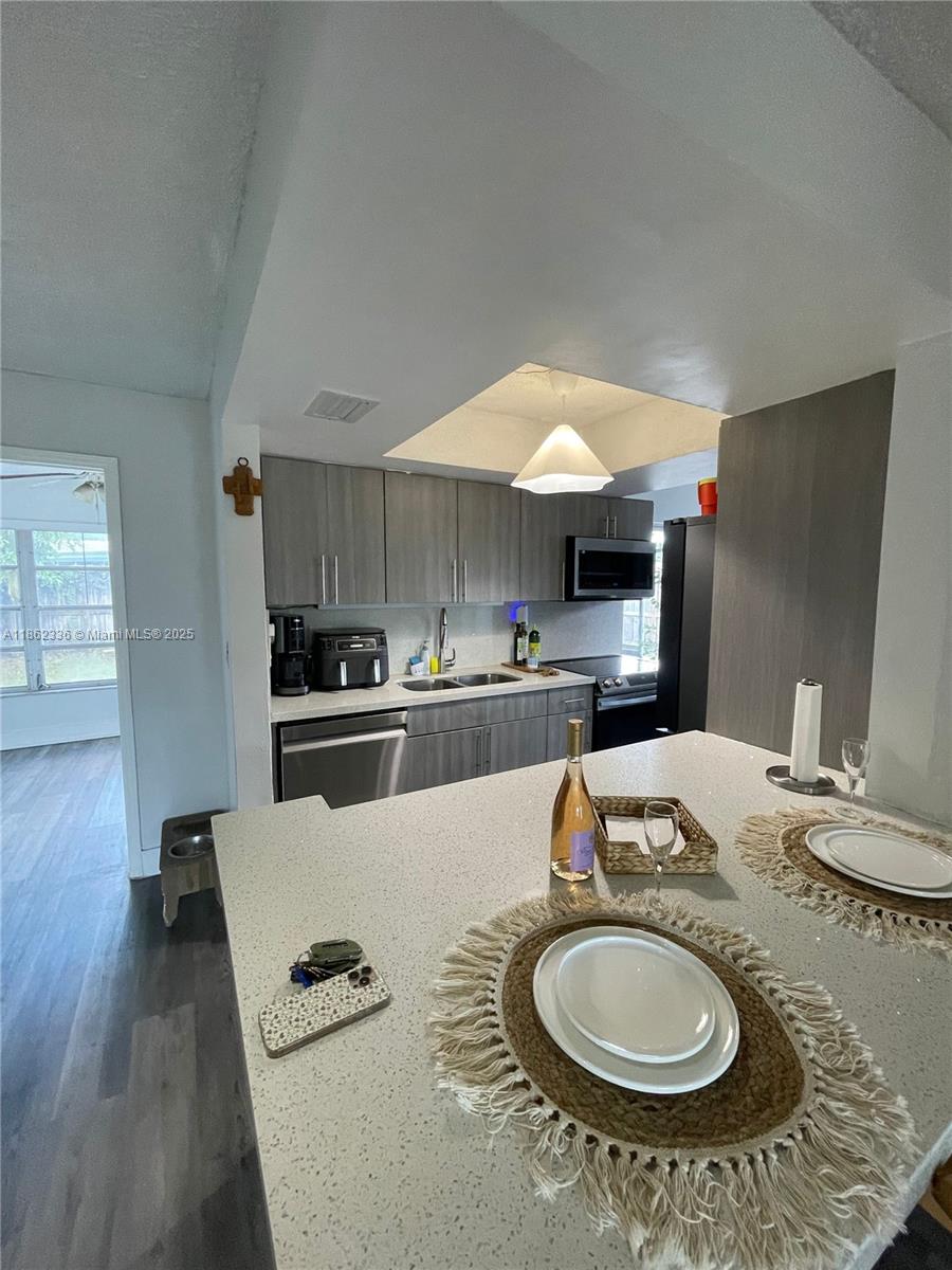 MOVE IN READY*** This elegant single-family is on a tree-lined street in the desirable greater Fort Lauderdale area, minutes to beaches, Airports, Downtown FT and Sawgrass Mills mall. Oversized 4car driveway and a carport. The front yard includes an organic coconut-producing palm tree. Soffits with dimmable led lighting. 2023 Full roof replacement with 10yr wrnty. Dec 2022 new AC with 10yr wrnty. Entrance- you have durable waterproof vinyl wood flooring continuous throughout, fresh paint, and a bright and open floor plan. Kitchen: Quartz countertops & backsplash with cabinets to compliment flooring and brand-name appliances. The backyard- mature fruit tree casts shade over back yard, perfect for sunny S. Florida summer. Paved portion of the yard allows space for a great BBQ grill.