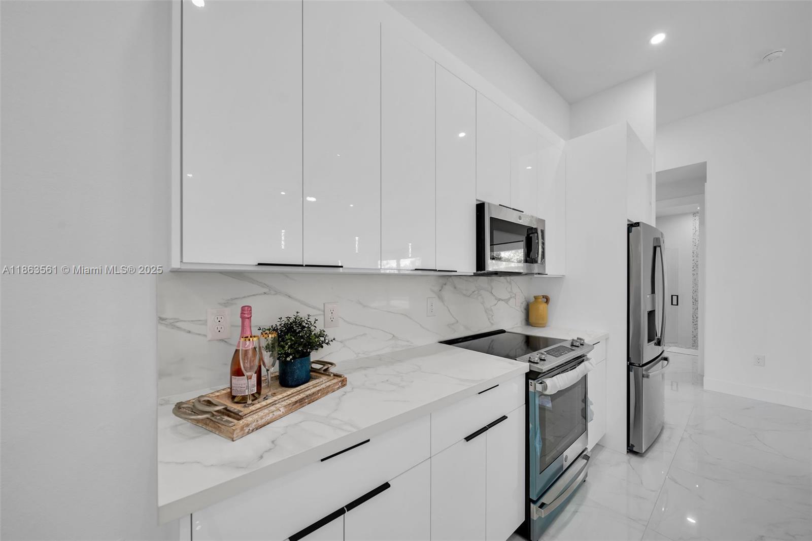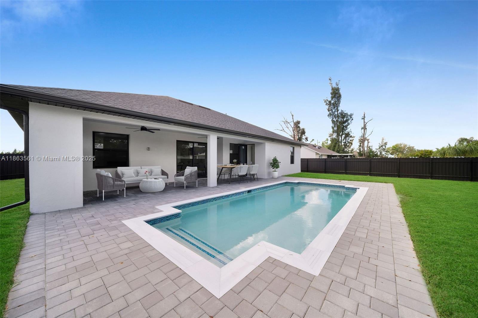 Experience modern Florida living in this 2024 new construction 4-bedroom, 2-bath home. The primary suite features dual walk-in closets and a tiled stand-up shower, while the second bath has backyard access. Enjoy a private saltwater pool with new heater. Porcelain tile flooring flows throughout, complemented by a 2-car garage, 4-car driveway, and storm-impact windows and doors. The chef’s kitchen boasts a Calacatta Quartz waterfall island, high-end appliances, and pop-up wireless charging. LED lighting, ceiling fans, and a dramatic living room fan enhance comfort. Step onto the lanai with a fully equipped outdoor Florida kitchen and lush landscaping with sprinkler system—luxury, style, and function all in one.
