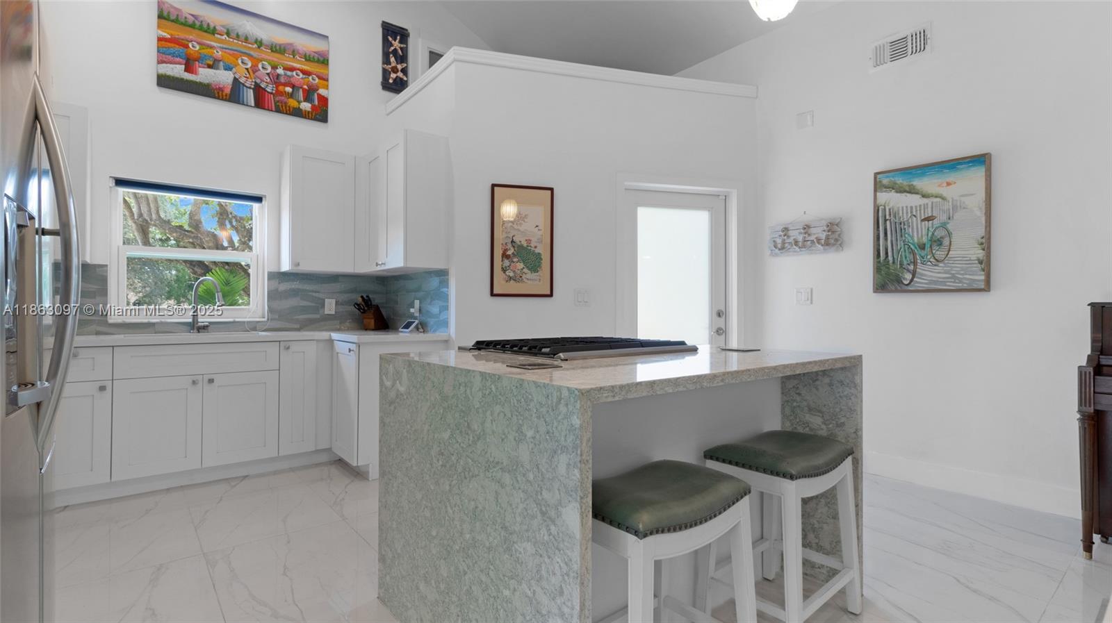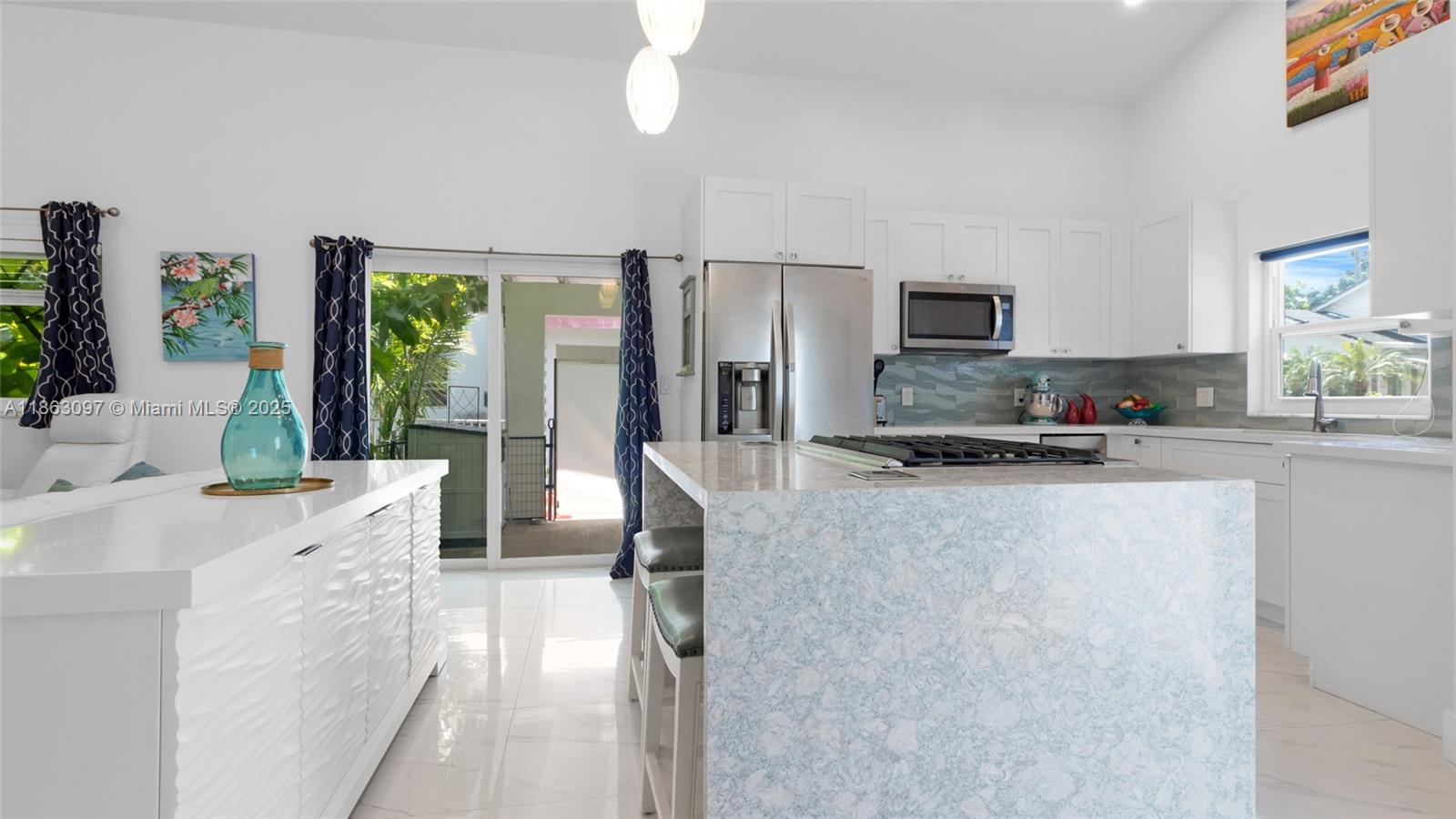 Discover a pleasant and inviting living space that boasts 3 bedrooms and 2 modern bathrooms, a laundry room with 2 closets, and a convenient carport. This home showcases a seamless layout that connects an open living area with a striking vaulted ceiling to a contemporary kitchen, which is highlighted by an island and recessed lighting. The kitchen is outfitted with a dual-fuel range featuring a downdraft vent. As per the seller, all renovations have been completed with permits. Upgrades include: impact windows and doors, a renovated kitchen and bathrooms, plumbing, and electrical work. Property strategically located just one block away from Trader Joe's and within walking distance of the Shops at Merrick Place.
