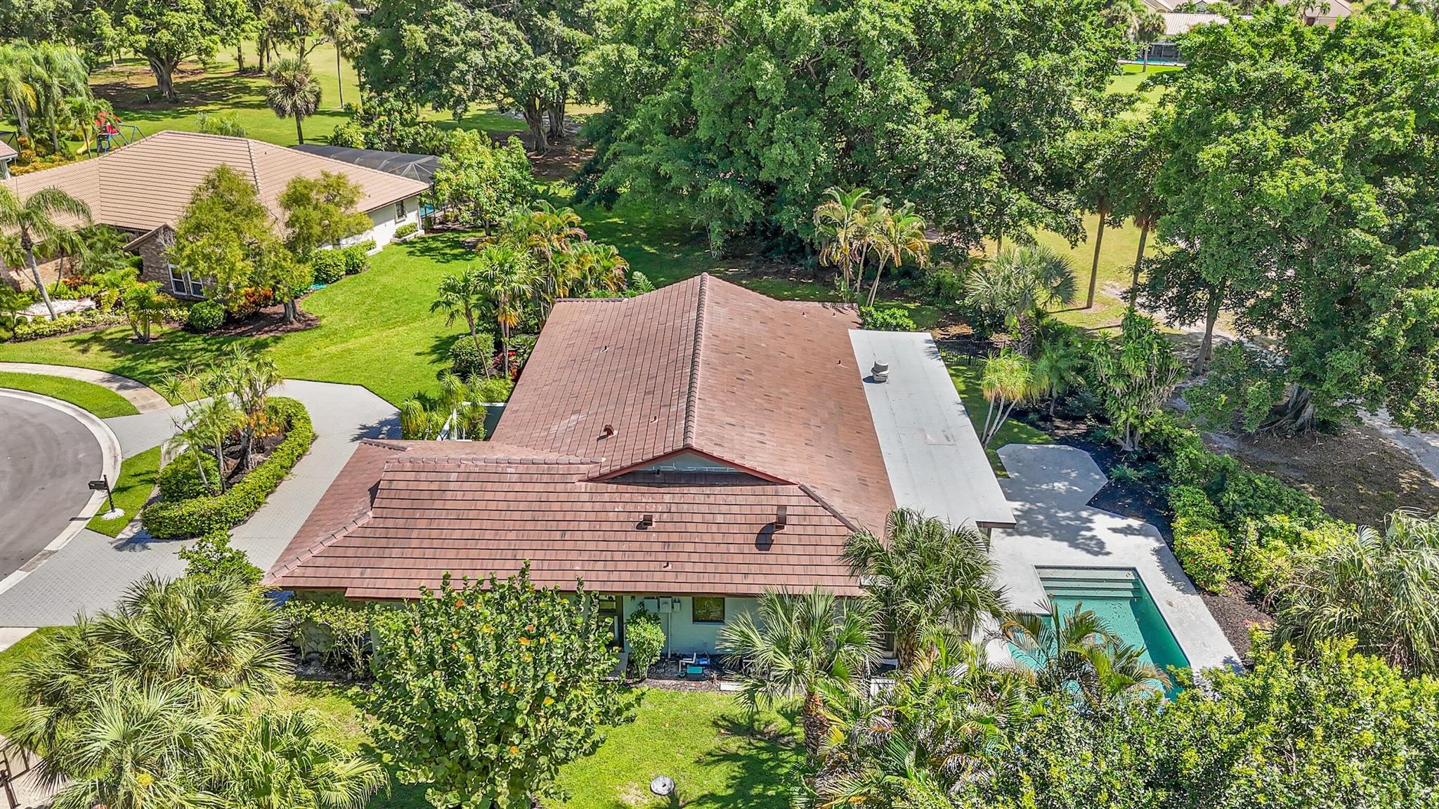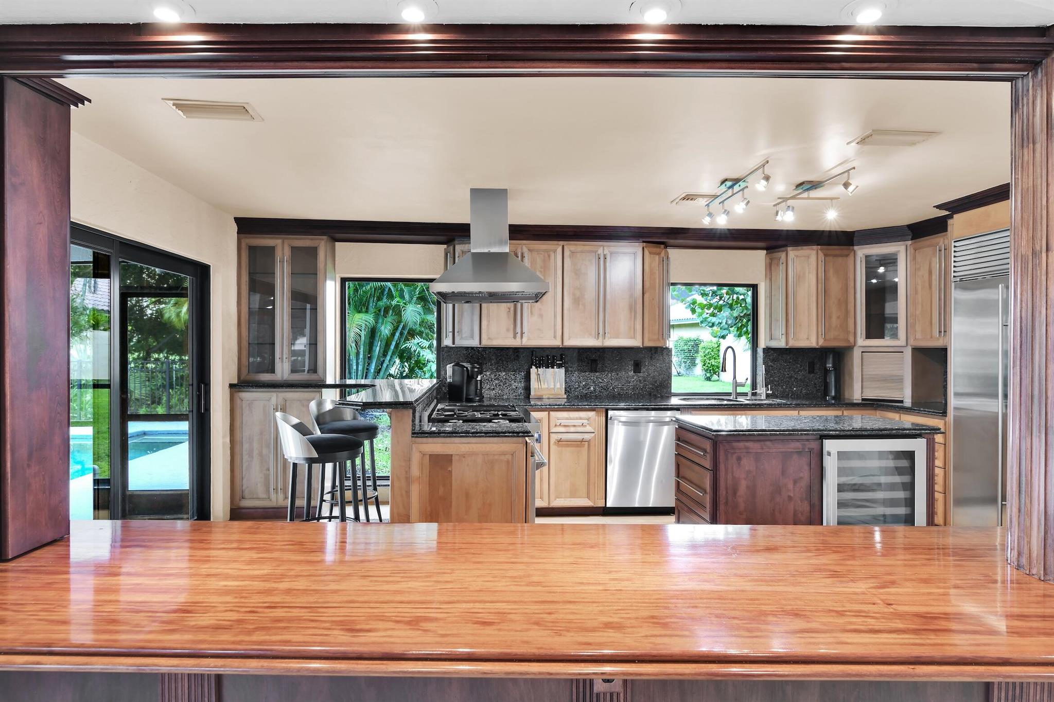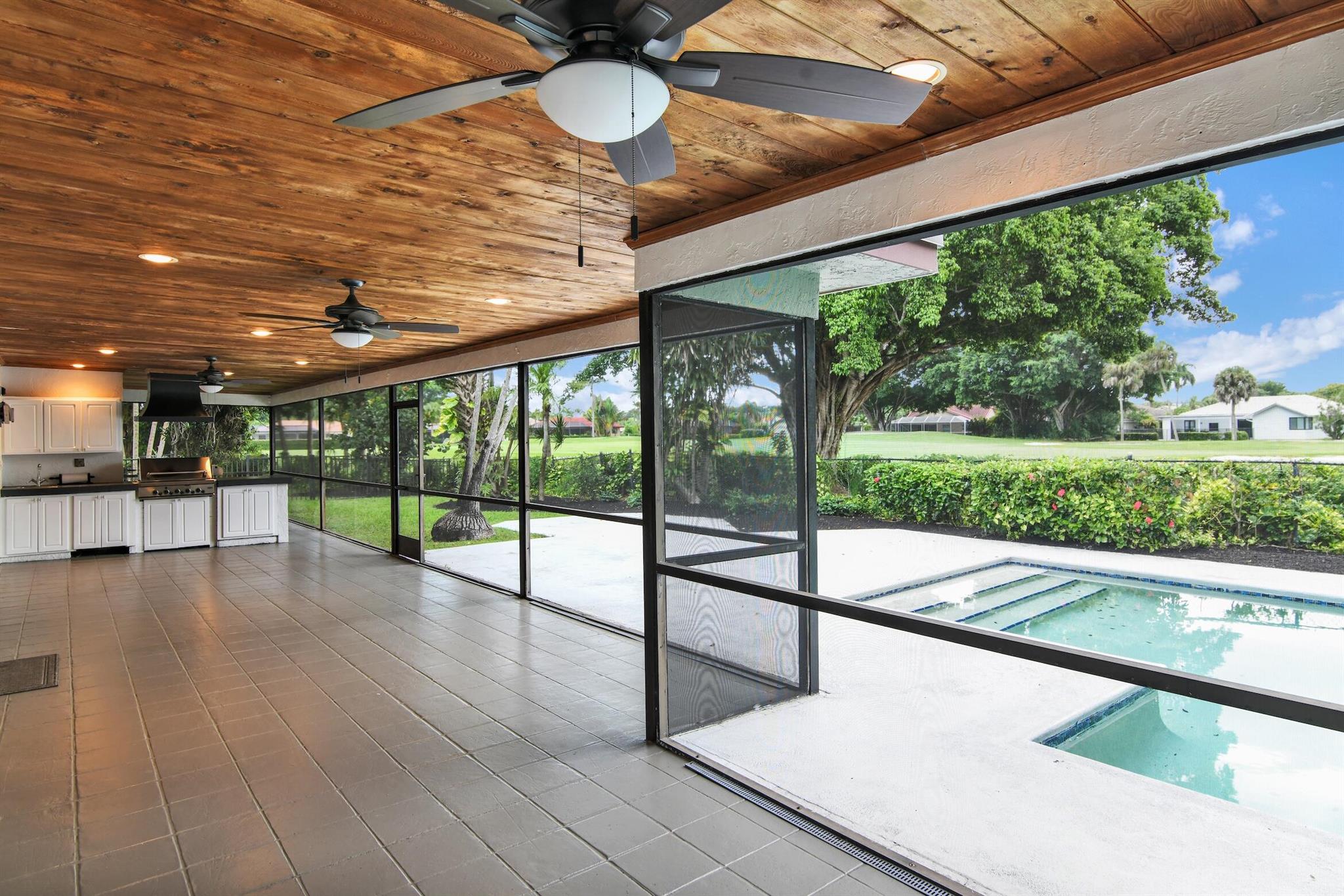 NEW ROOF. COMPLETE HURRICANE IMPACT PROTECTION. Air conditioners (2) replaced in 2023. Pie shaped .36 acre lot with circular driveway.No membership required lot. Near houses of worship.Professional GAS stove, appliance garage, subzero refrigerator, granite counters in the beautifully remodeled kitchen ideal for Gourmet cooks. Built-in Honduran Rosewood 10 seat Island with retractable door. Built-in wine cooler with room for 54 Bottles. Master bedroom overlooks patio, and has 2 walk-in closets, and large bathroom with tub and separate shower. Large screened in Patio with DCS outdoor kitchen with rotisserie and custom exhaust. Large, fenced yard with large deck and 37X18 ft pool with expansive view of the 14th hole fairway.Well for sprinklers saves water