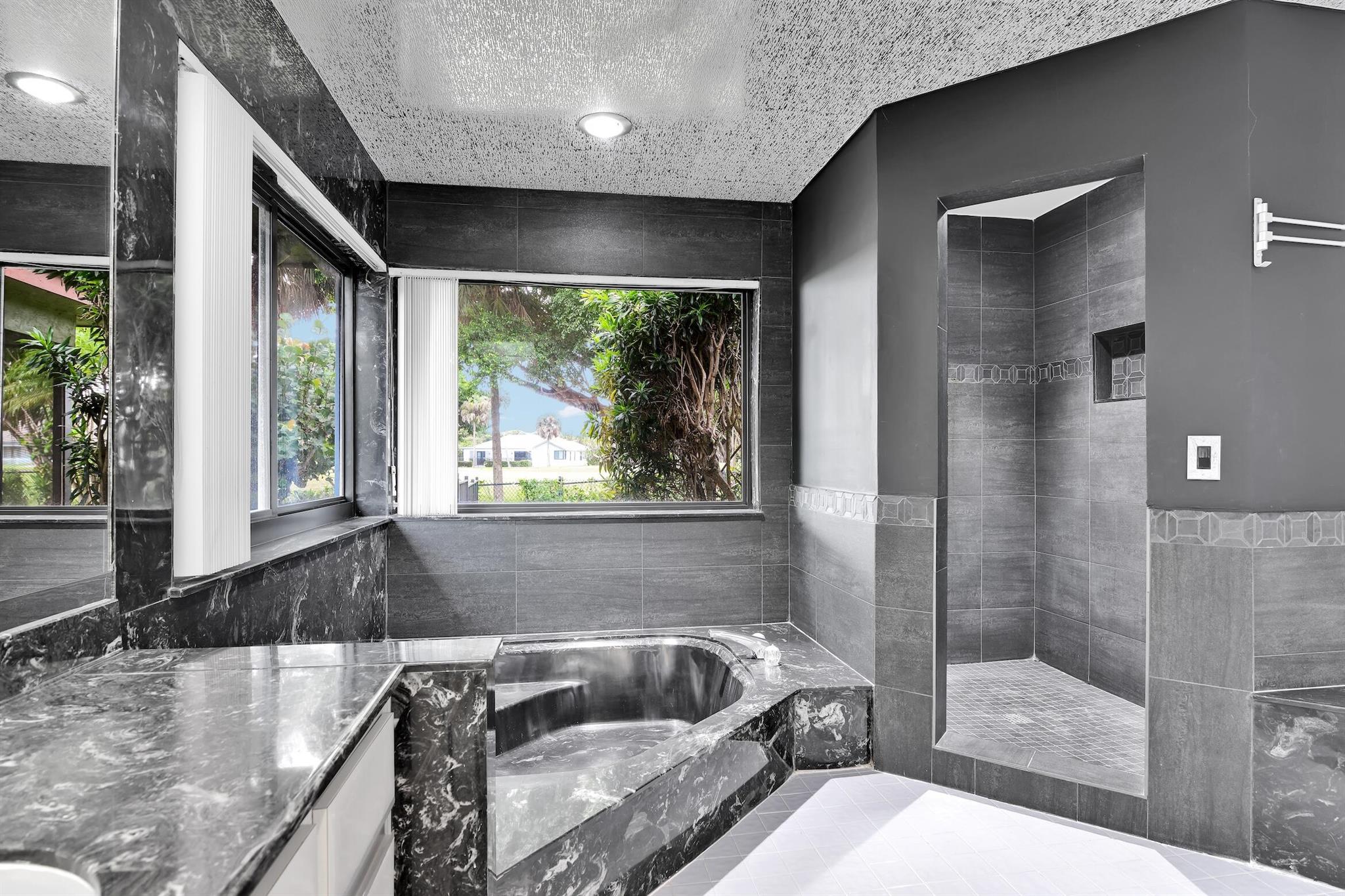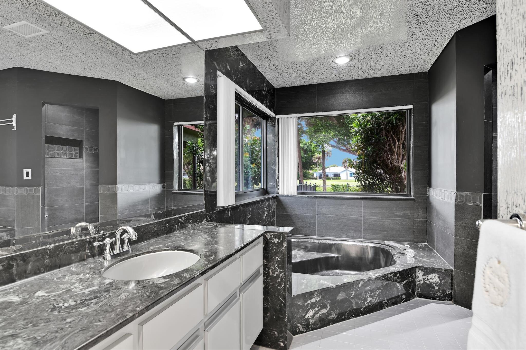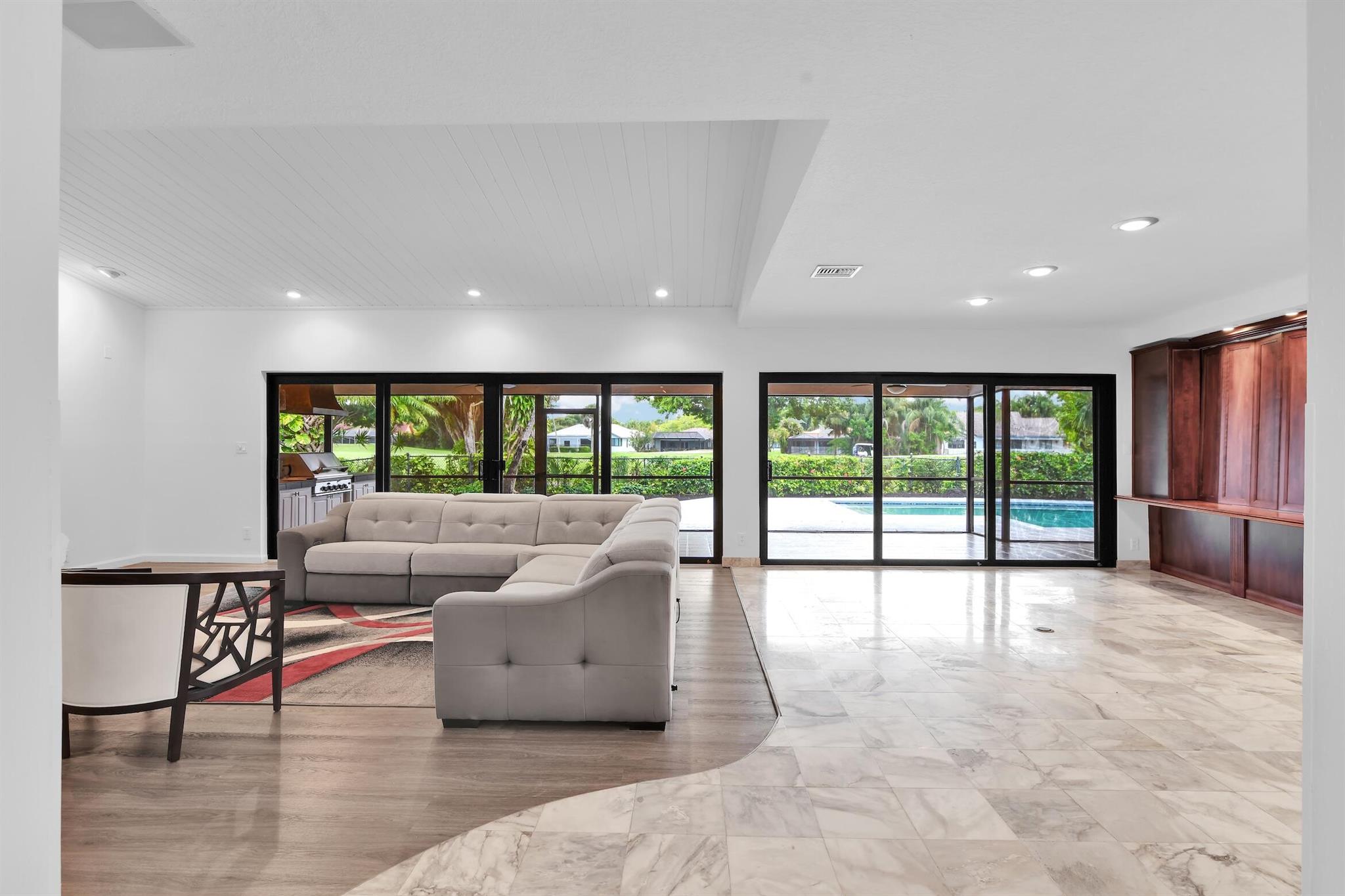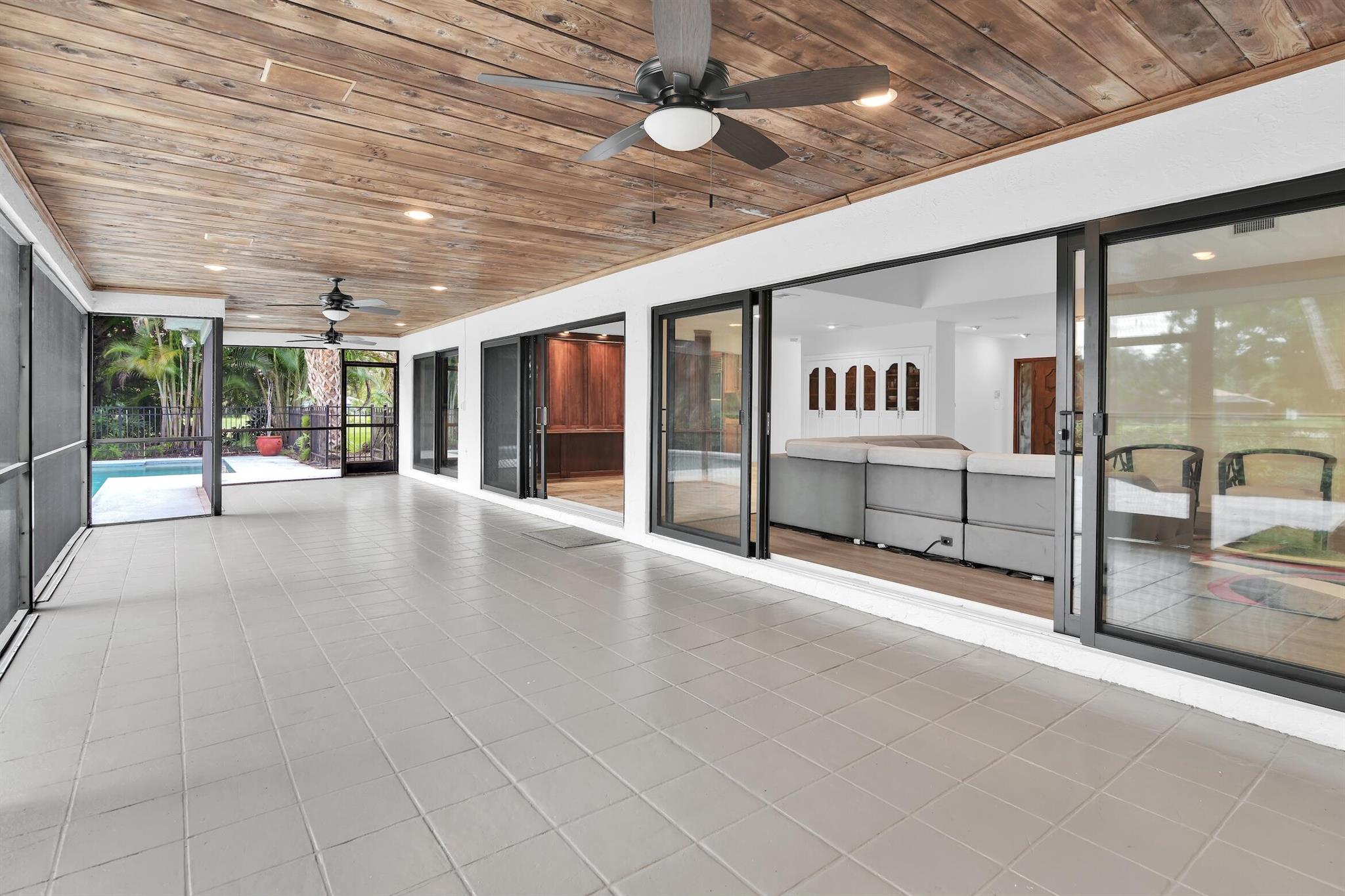 NEW ROOF. COMPLETE HURRICANE IMPACT PROTECTION. Air conditioners (2) replaced in 2023. Pie shaped .36 acre lot with circular driveway.No membership required lot. Near houses of worship.Professional GAS stove, appliance garage, subzero refrigerator, granite counters in the beautifully remodeled kitchen ideal for Gourmet cooks. Built-in Honduran Rosewood 10 seat Island with retractable door. Built-in wine cooler with room for 54 Bottles. Master bedroom overlooks patio, and has 2 walk-in closets, and large bathroom with tub and separate shower. Large screened in Patio with DCS outdoor kitchen with rotisserie and custom exhaust. Large, fenced yard with large deck and 37X18 ft pool with expansive view of the 14th hole fairway.Well for sprinklers saves water