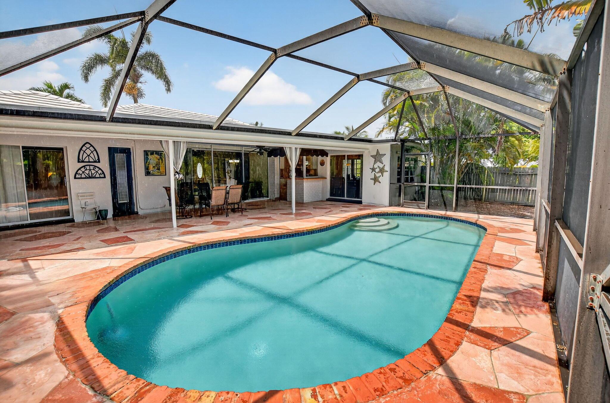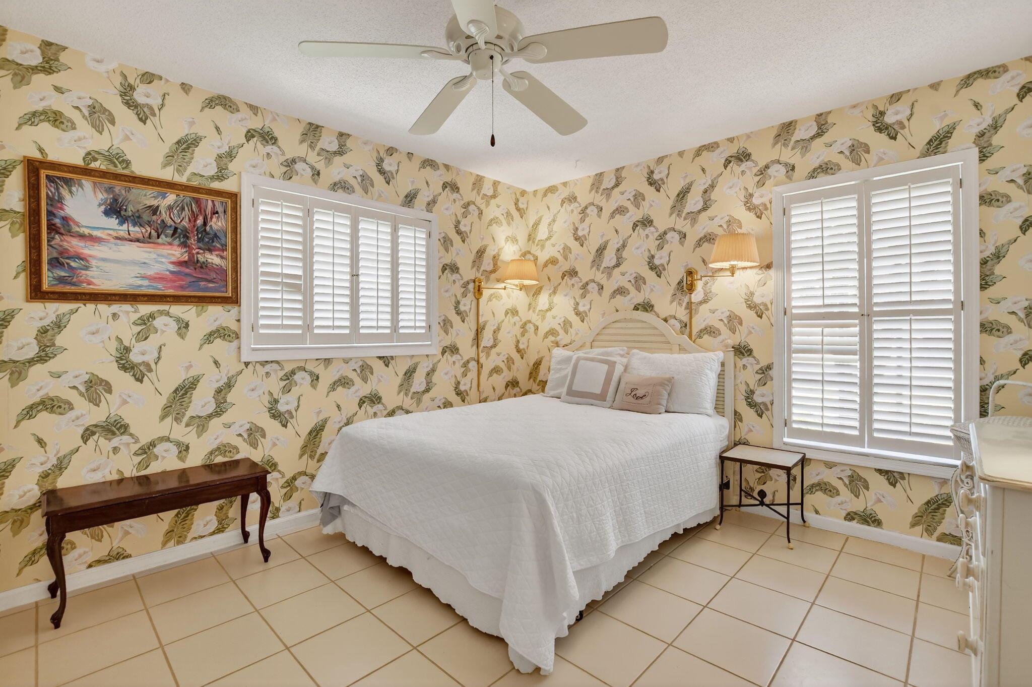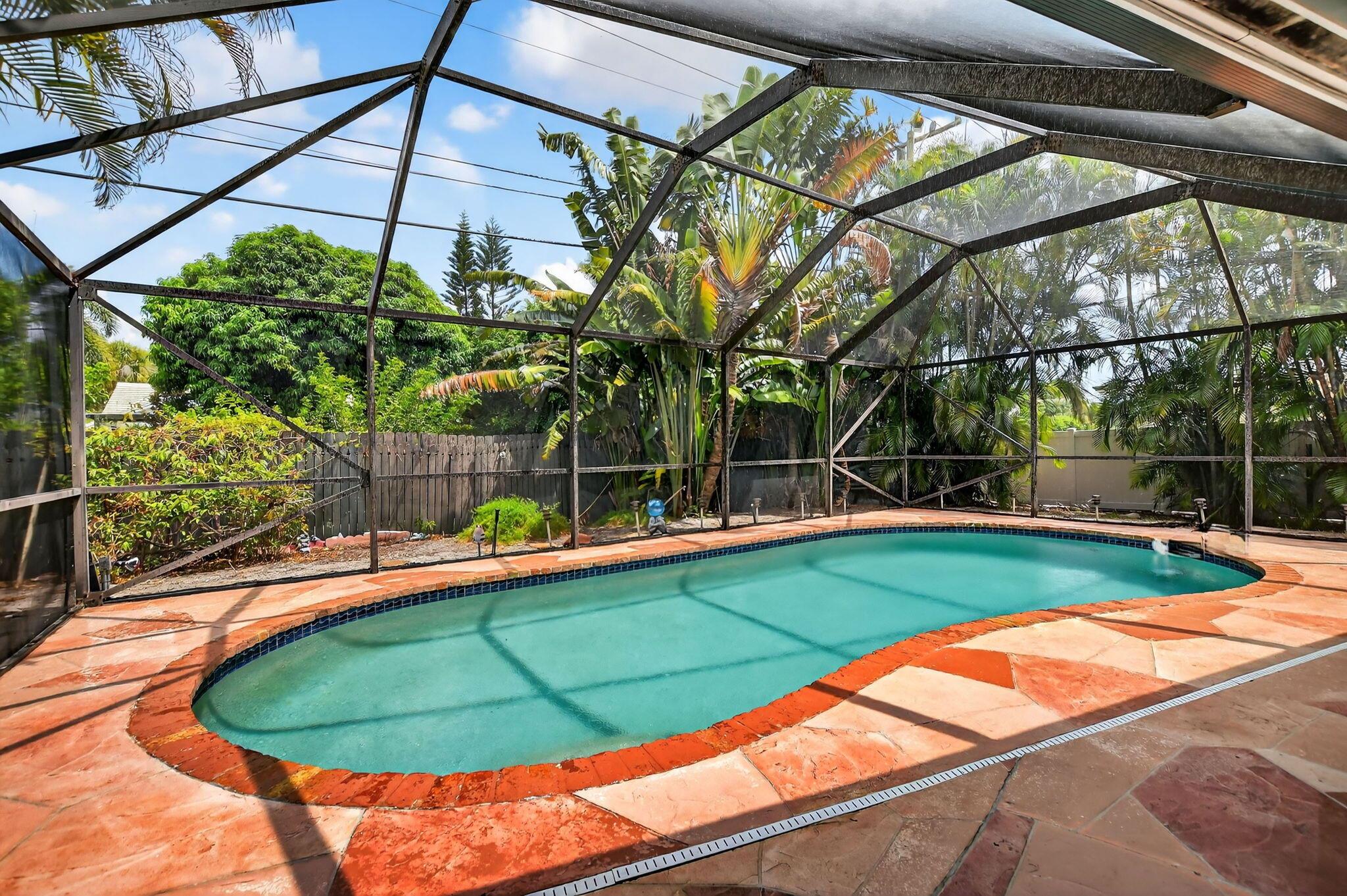 Step into PURE CHARM with this beautifully maintained two-bedroom corner-lot pool home, surrounded by lush tropical landscaping that sets the tone for a serene retreat. Nestled in one of the area's most desired neighborhoods, beautiful Paradise Palms. From the moment you arrive, the curb appeal shines-mature palm trees and vibrant greenery create a warm, welcoming entrance. Inside, the home feels light, bright and airy, with soft neutral tones, pastels and white brick, which compliments the natural sunlight pouring in through the elegant plantation shutters and sliding glass doors.