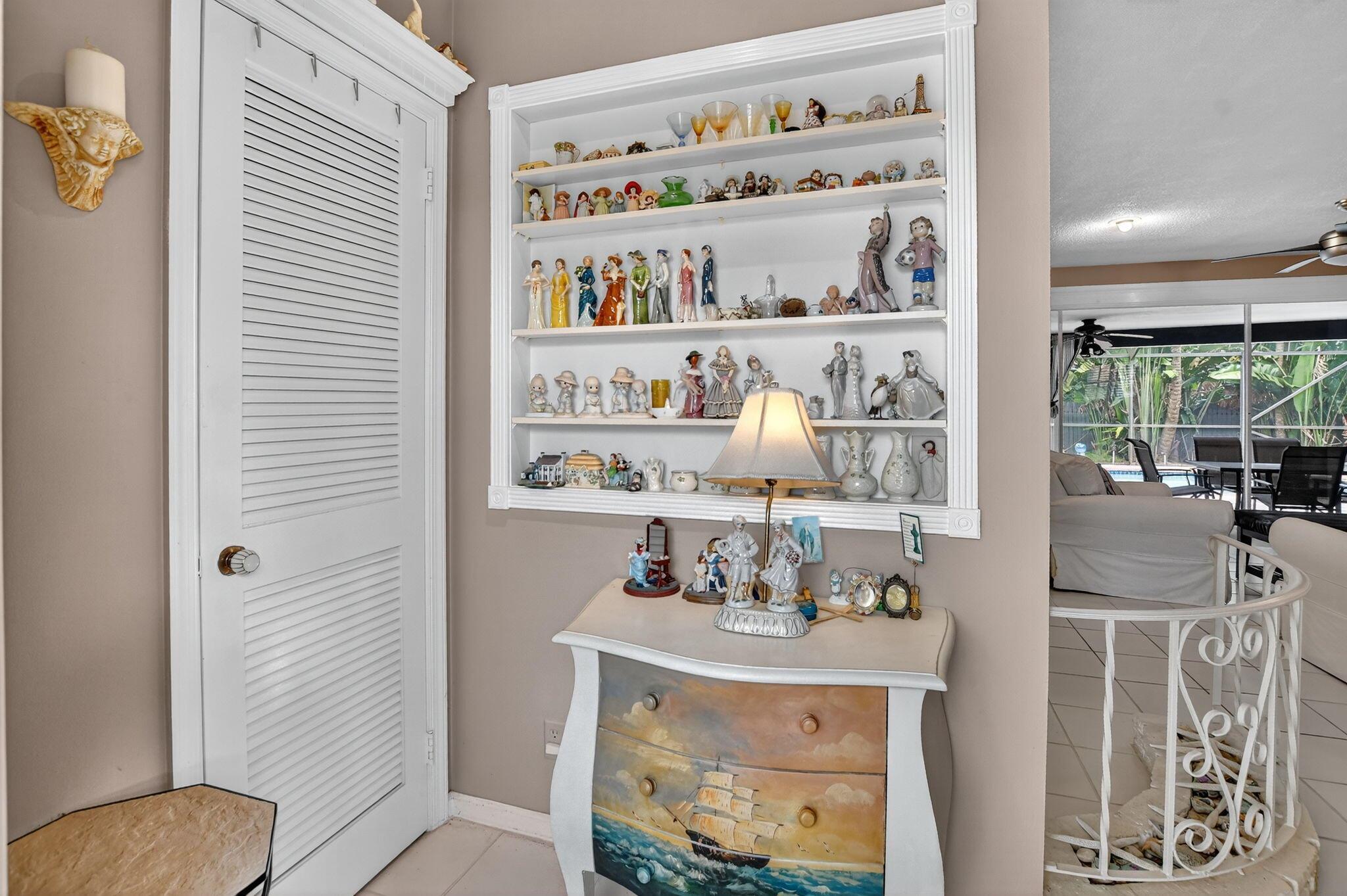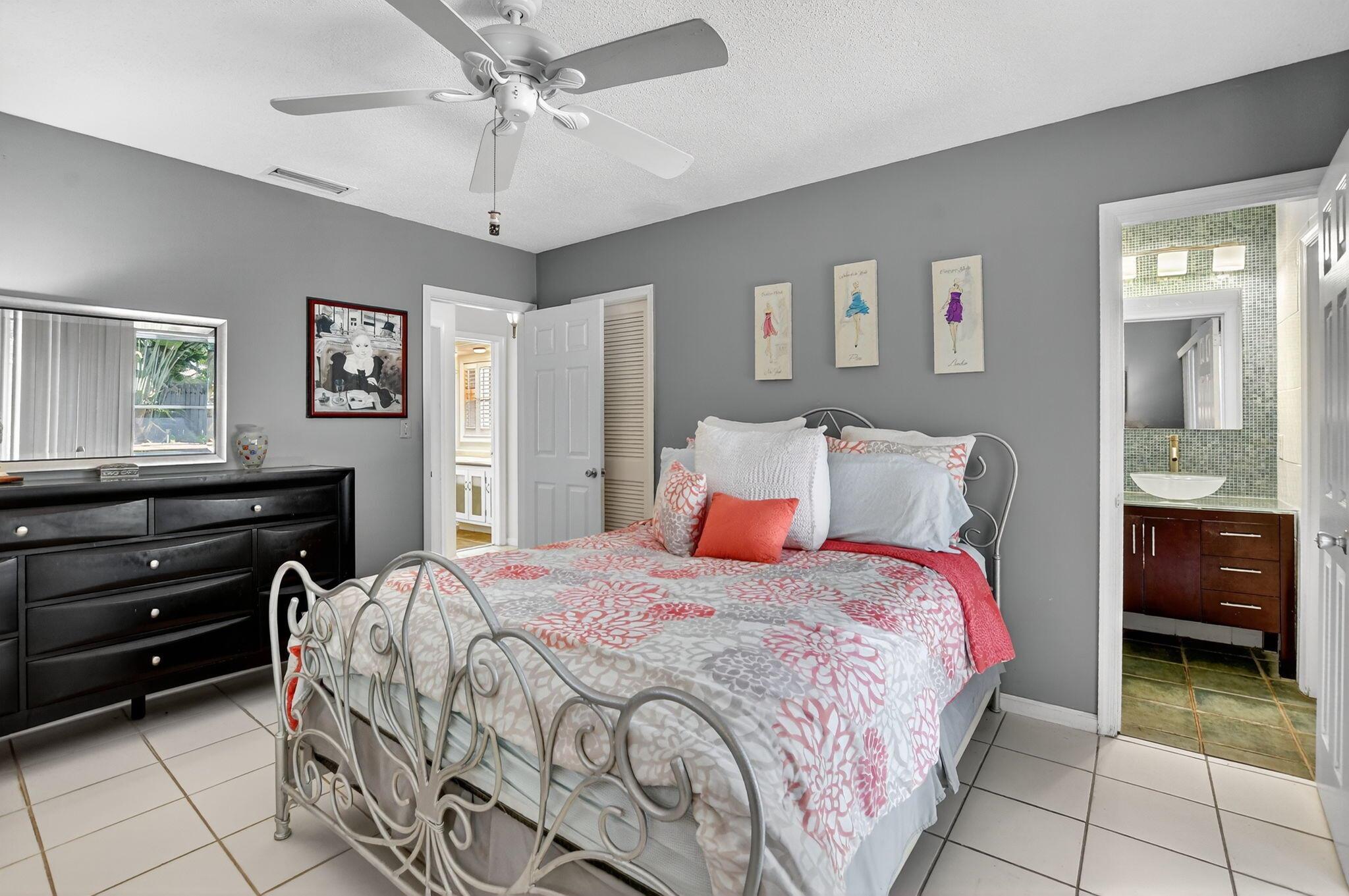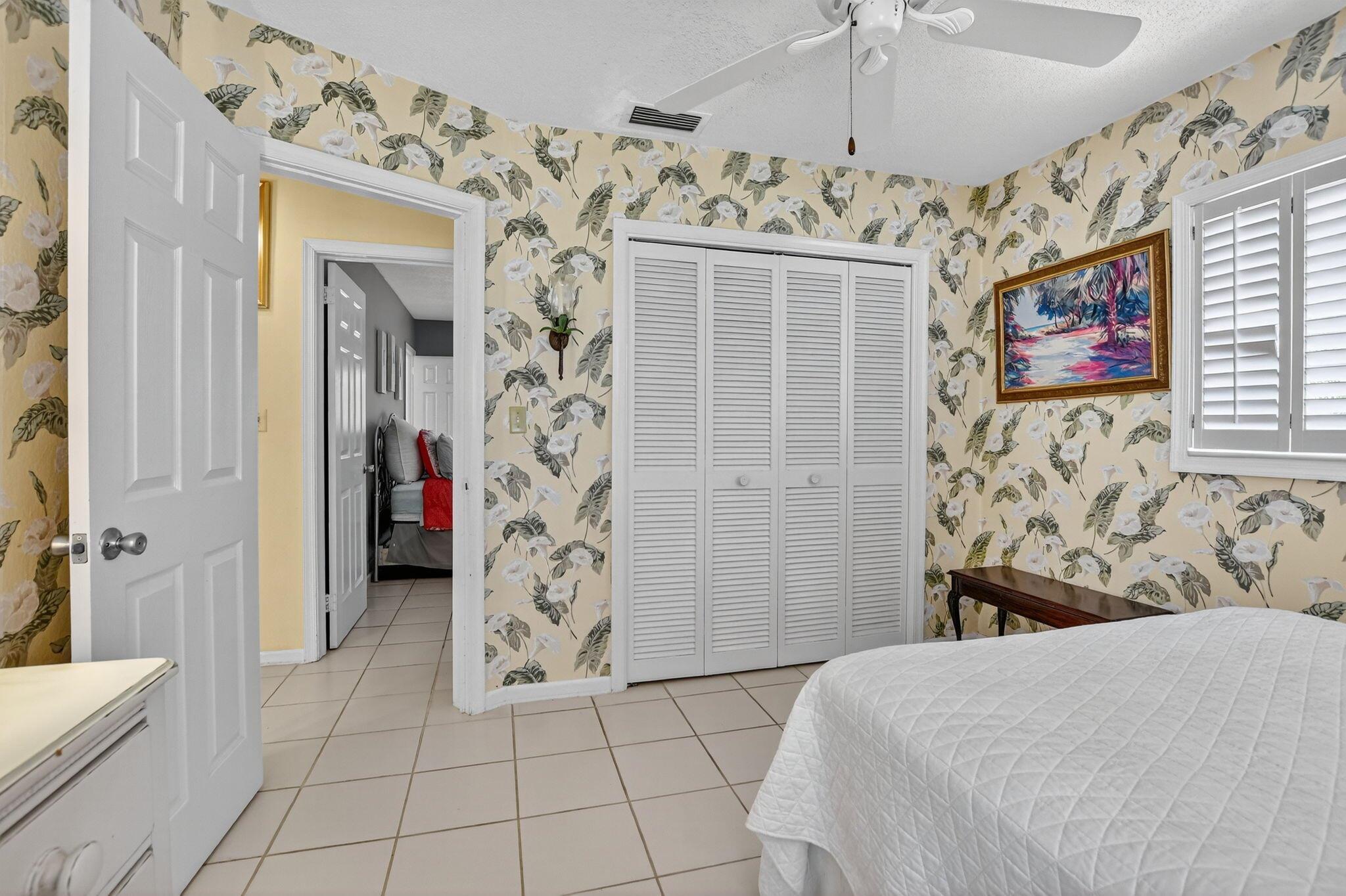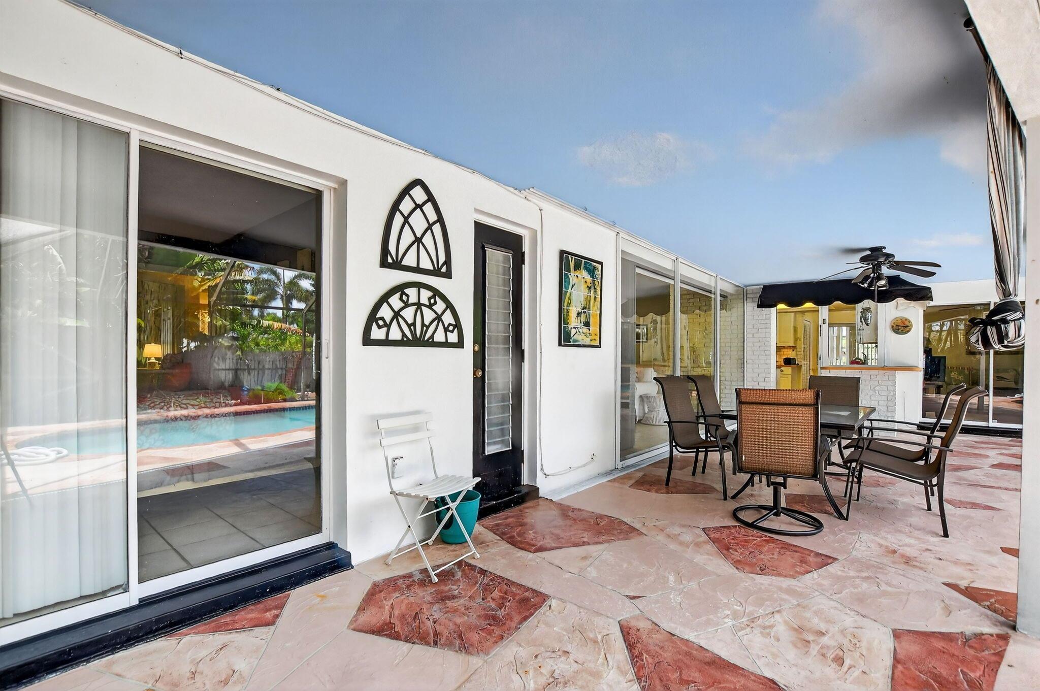 Step into PURE CHARM with this beautifully maintained two-bedroom corner-lot pool home, surrounded by lush tropical landscaping that sets the tone for a serene retreat. Nestled in one of the area's most desired neighborhoods, beautiful Paradise Palms. From the moment you arrive, the curb appeal shines-mature palm trees and vibrant greenery create a warm, welcoming entrance. Inside, the home feels light, bright and airy, with soft neutral tones, pastels and white brick, which compliments the natural sunlight pouring in through the elegant plantation shutters and sliding glass doors.
