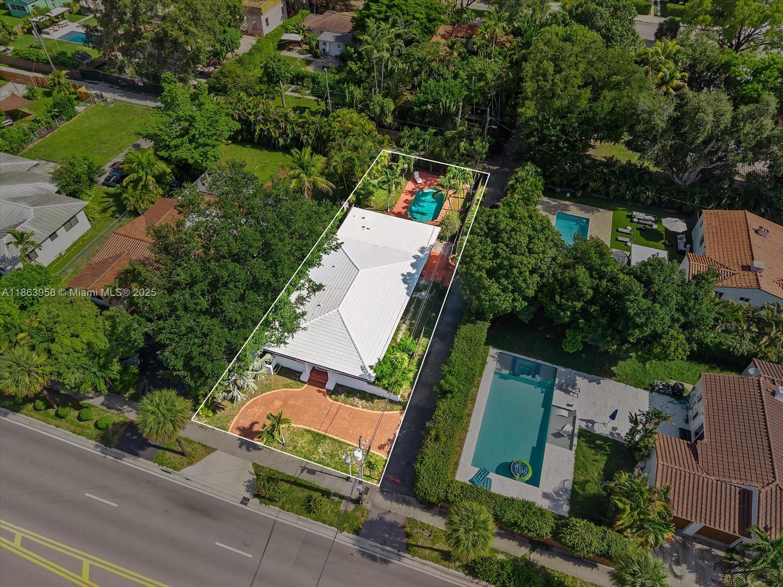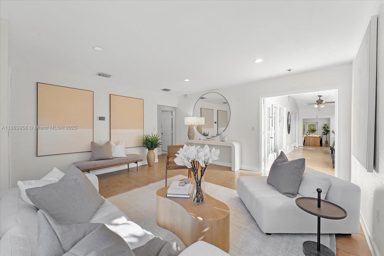 Welcome to Casa Palmera, a tropical hideaway in prime Miami Shores. This bright and airy 4-bed, 3-bath home offers laid-back luxury with a lush backyard escape, framed by swaying palms and vibrant landscaping. A sun-drenched corridor guides you through the home, connecting light-filled interiors with the outdoors. The oversized kitchen is the heart of the home, featuring a generous snack counter and a large dining area that opens directly to the patio, perfect for effortless indoor-outdoor entertaining. Spend sunny afternoons by the pool in complete privacy and tranquility. Additional highlights: cabana bathroom, impact doors, laundry room, and alley access with a circular driveway. Centrally located and minutes from top-rated school making it perfect for families.