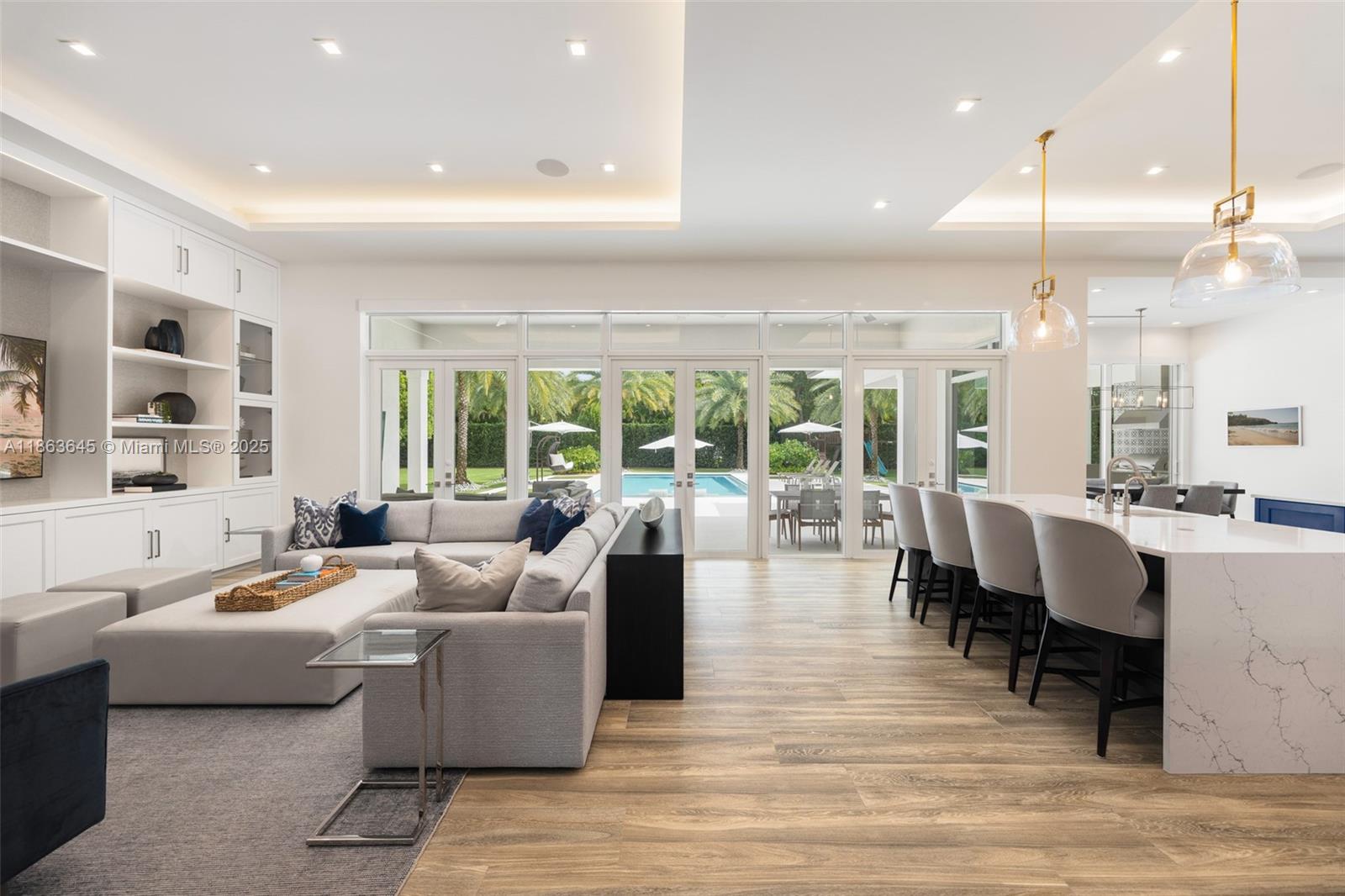 This residence radiates style and quiet luxury. Custom design in collaboration with Hollub Homes, it reflects exceptional craftsmanship, timeless design, and thoughtful livability. On an ultra-quiet street, this home features glass walls with captivating views to a perfectly curated and manicured pool lawn area, sprawling palms, and a Podocarpus hedge that perfectly lines the perimeter. An open kitchen with dual islands anchors everyday life and entertaining. The bedroom wing keeps the family connected, with a dedicated lounge area for time with friends. The smartly designed professional and wellness wing includes a private office, gym with separate entrance, flex workspace, and laundry room. Every detail was intentional—elevated yet welcoming, from first impression to everyday living.