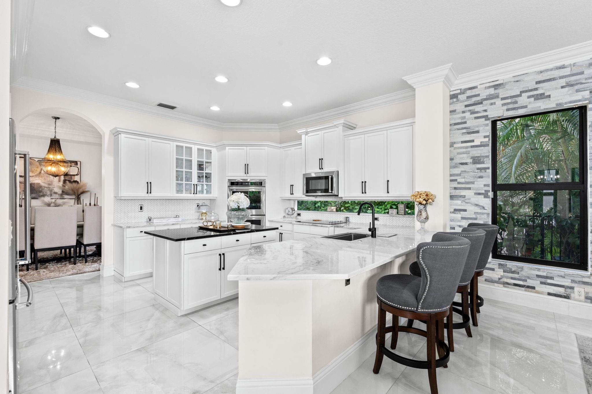 Beyond double entry doors, a remodeled iron staircase frames wide water & preserve views and an 18-ft picture window. 5BR + loft/den, 5BA, 3-car; main-level suite & cabana bath. Impact windows & French doors; remodeled island kitchen; Rain Bird irrigation; A/Cs ~4 yrs (transferable). 27kW whole-house generator w/ 500-gal tank; newer Pentair pool equipment. Large-format porcelain floors, designer lighting & fresh paint. Covered & open patios frame long-lake sunsets and a heated pool/spa. Community offers manned gate w/ app-based guest access, renovated clubhouse & fitness, and new pickleball, tennis & basketball. Close to equestrian venues, shopping/dining, Turnpike/441 & PBI. HOA includes cable & security; Butterfly gate access. Landscaping. Near A+ rated schools, equestrian hubs, beaches.