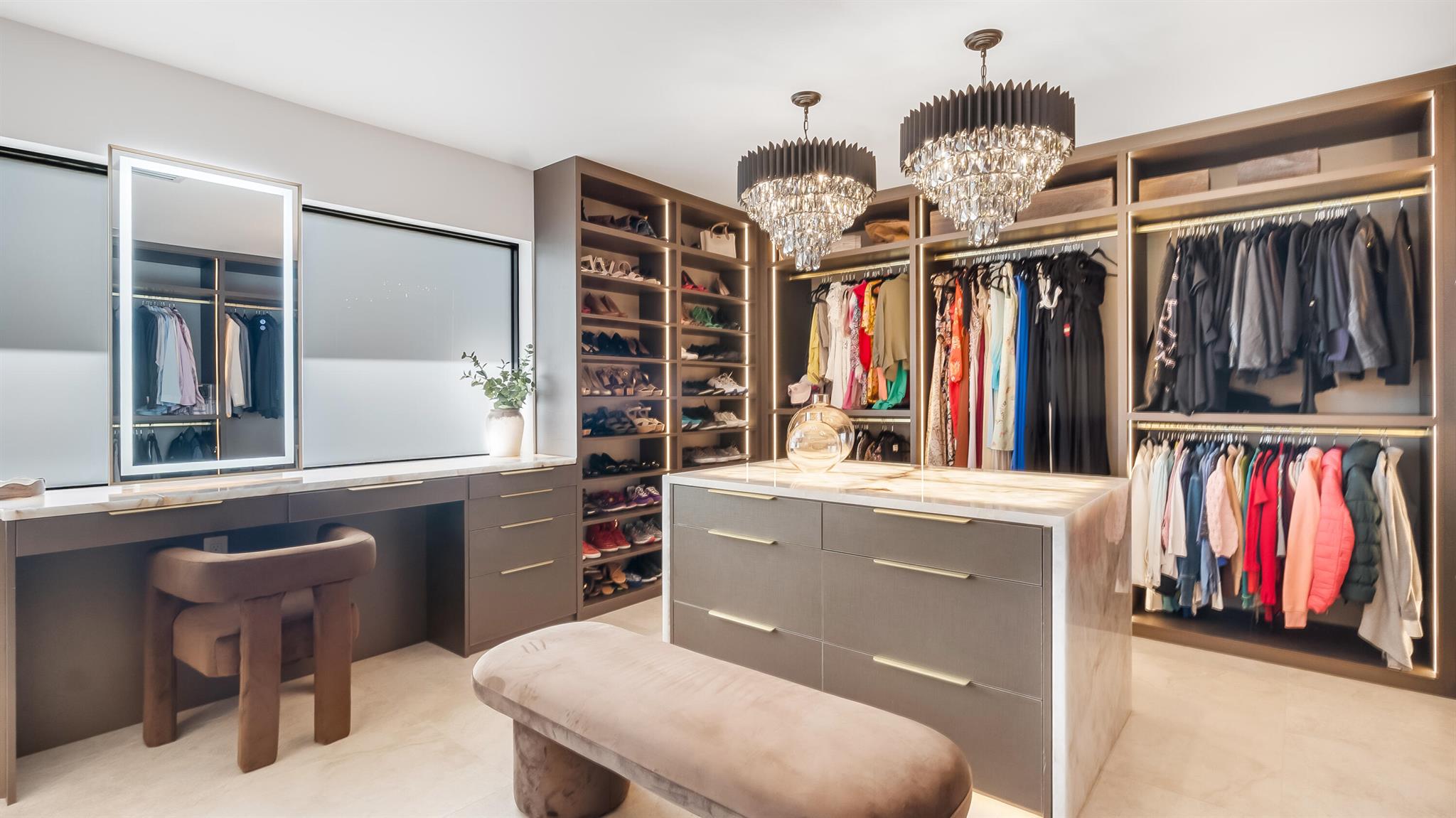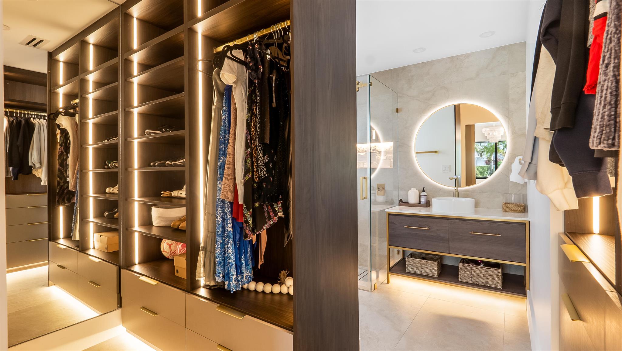From the moment you arrive, this fully renovated home captivates with a floating water walkway and front glass pivot door. Inside, soaring 19-foot ceilings, open-concept living, and impeccable high-end finishes set the stage for sophisticated living. The residence features 4 en-suite bedrooms with custom closets, a spacious primary bedroom with wet-room and dream closet, a chef's kitchen with Wolf appliances, bespoke cabinetry, and quartzite island, a modern Taj Mahal stone fireplace, as well as a 300-bottle wine cellar and man cave garage that elevate lifestyle and entertainment. Step outside to your private resort oasis with a saltwater pool, sunken lounge, in-pool fire pit, swim jets,10-person spa, and cabana steam bath, all framed by lush tropical landscaping and golf course views.