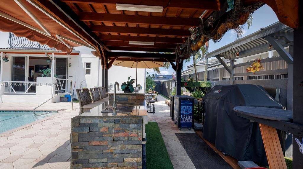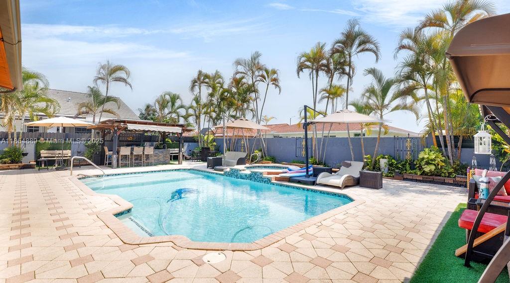 Fall in love with this spacious 5BR/3.5BA pool home in Marivi Gardens! From the grand entry with soaring ceilings to the bright living room with floor-to-ceiling windows, this home is made for both comfort and style. Cook and entertain in the chef’s kitchen with granite counters and island seating, then relax in the family room or enjoy the upstairs loft. Retreat to the large primary suite with balcony views, walk-in closets, and sitting area. Step outside to your own paradise with pool, spa, summer kitchen, tiki bar, and covered patios—perfect for family gatherings and weekends with friends.