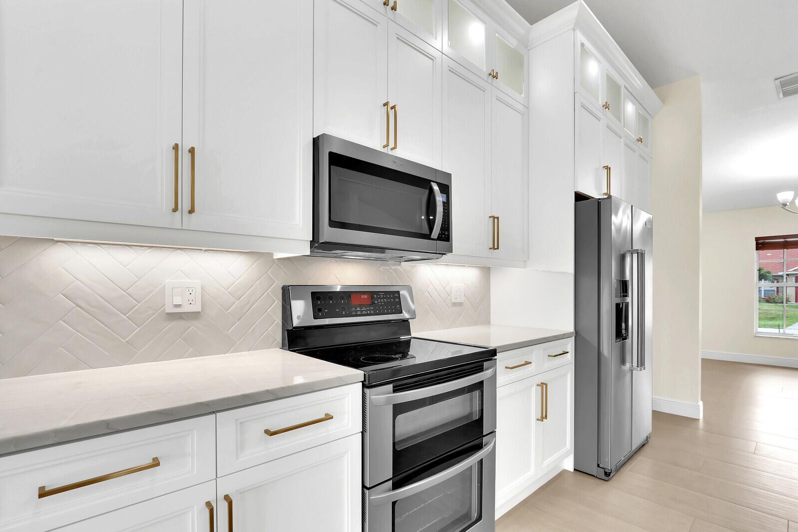 COMPLETELY RENOVATED!! Open/Spacious floor plan. 3 bedrooms plus Guest room / Office / playroom. Gorgeous, HUGE kitchen with an enormous island with tons of storage, quartzite countertops and tile backsplash. White shaker cabinet with over and under cabinet lighting. Modern bathrooms, Wood tile, High hats, and 5-inch baseboards throughout home. Burgler alarm with hardwired security cameras. Expanded driveway and patio deck. Fully fenced in yard for privacy and the ability for generator hookup. AC was replaced in 2023. All sizes are approx.