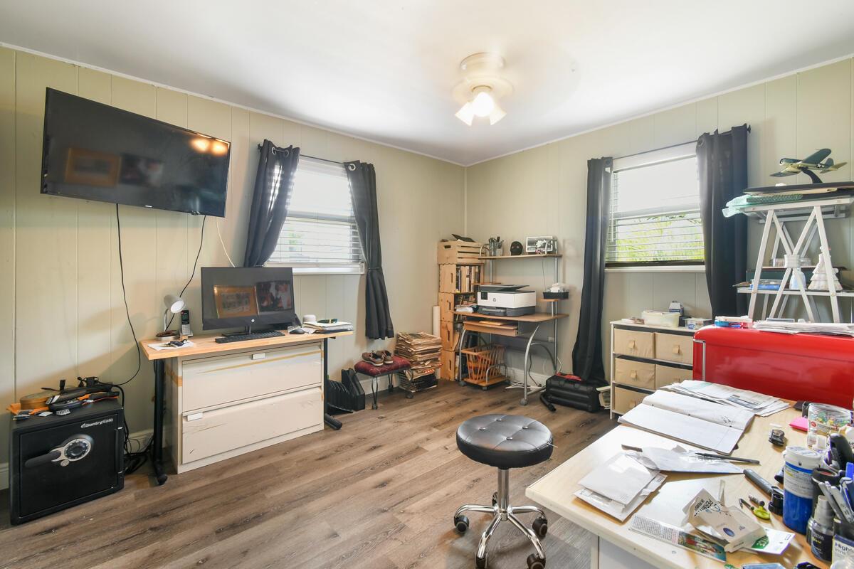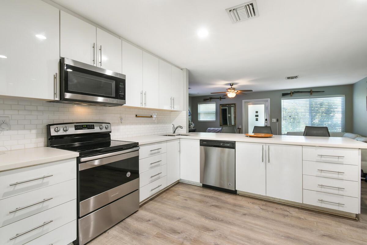 Enjoy comfortable living in this cozy home featuring a stylish kitchen with quartz counter tops & ample cabinetry, modern updated bathrooms, a large family/dining room, laminate flooring throughout, metal roof, impact windows and a newer a/c. Plus a separate laundry room, a covered, screened patio and the property is completely fenced. Third bedroom has no closet. No HOA. Ideally located in Palm Beach Gardens close to shopping, restaurants and freeways.