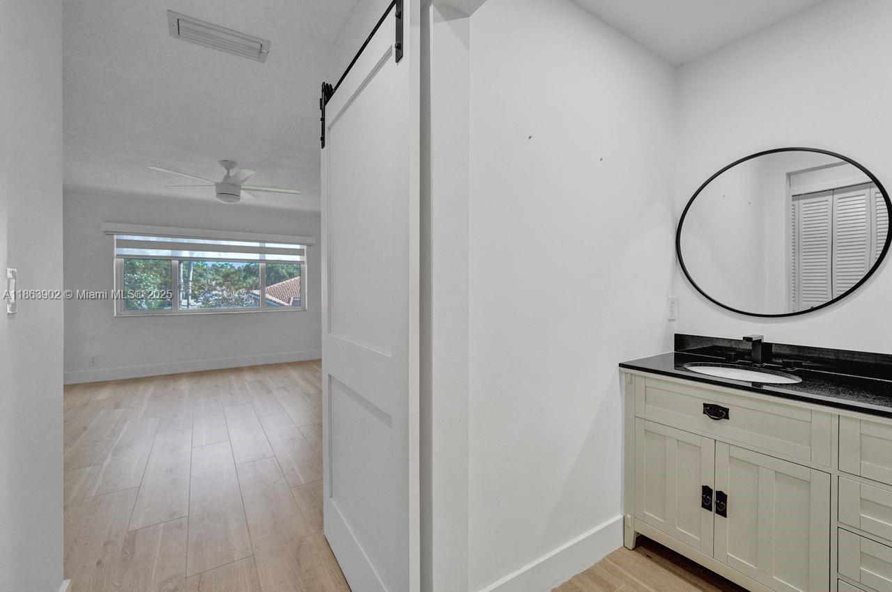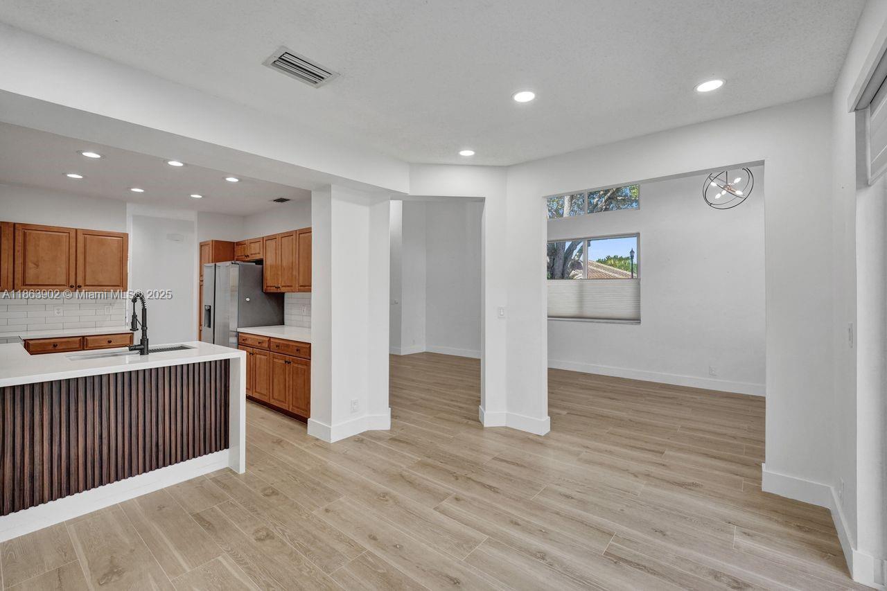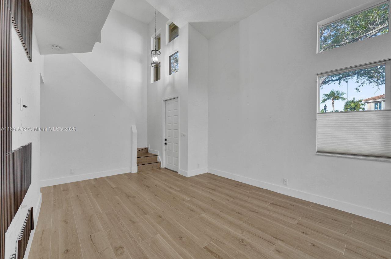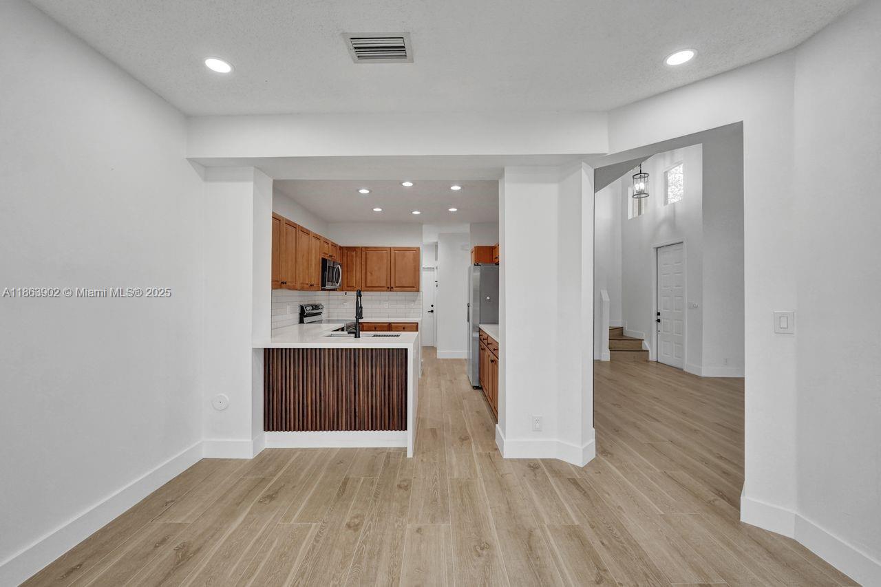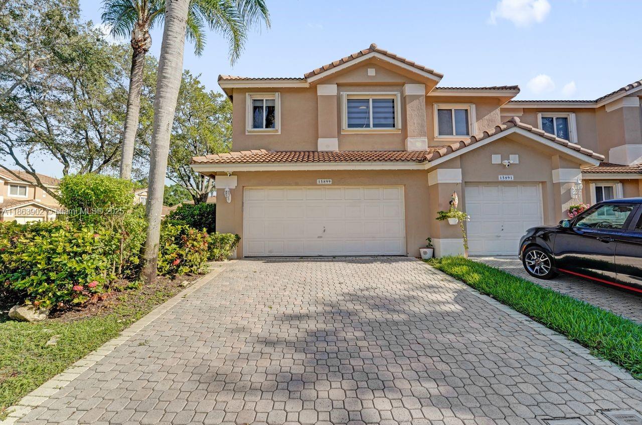 Stunning updated corner townhouse in secure Grand Palms Golf and Country Club. This 3 bedroom/2.5 bath, 2-car garage home has been tastefully remodeled. Enjoy an open kitchen with quartz countertops and Stainless-Steel appliances. The home is tiled with new ceramic wood plank tiles on both floors. The Courtyards section of Grand Palms has included in their HOA dues, Basic Cable, WIFI, Alarm, 24 hour Security Gated Entrance, Community pool, Children's playground and Landscaping maintenance. A new roof was done in 2022 as well as the garage update with Epoxy floors and shelving. In addition, this community has very good schools and is surrounded by excellent shops, restaurants and entertainment venues. This is a wonderful place to call home.