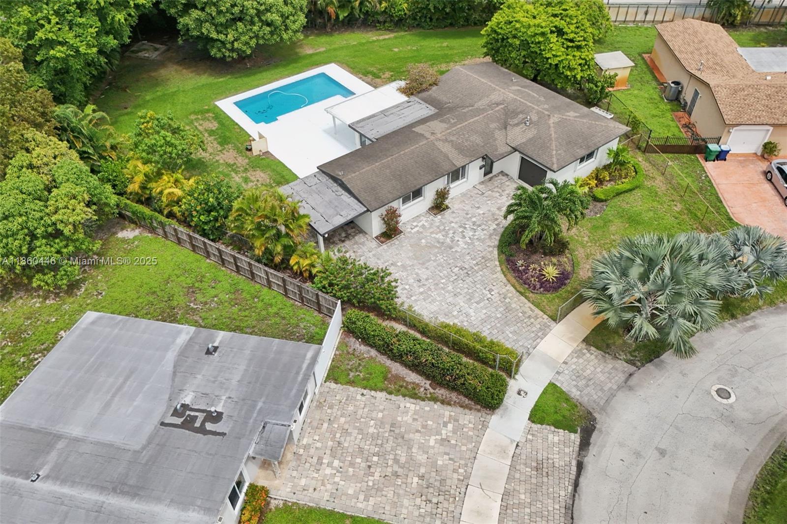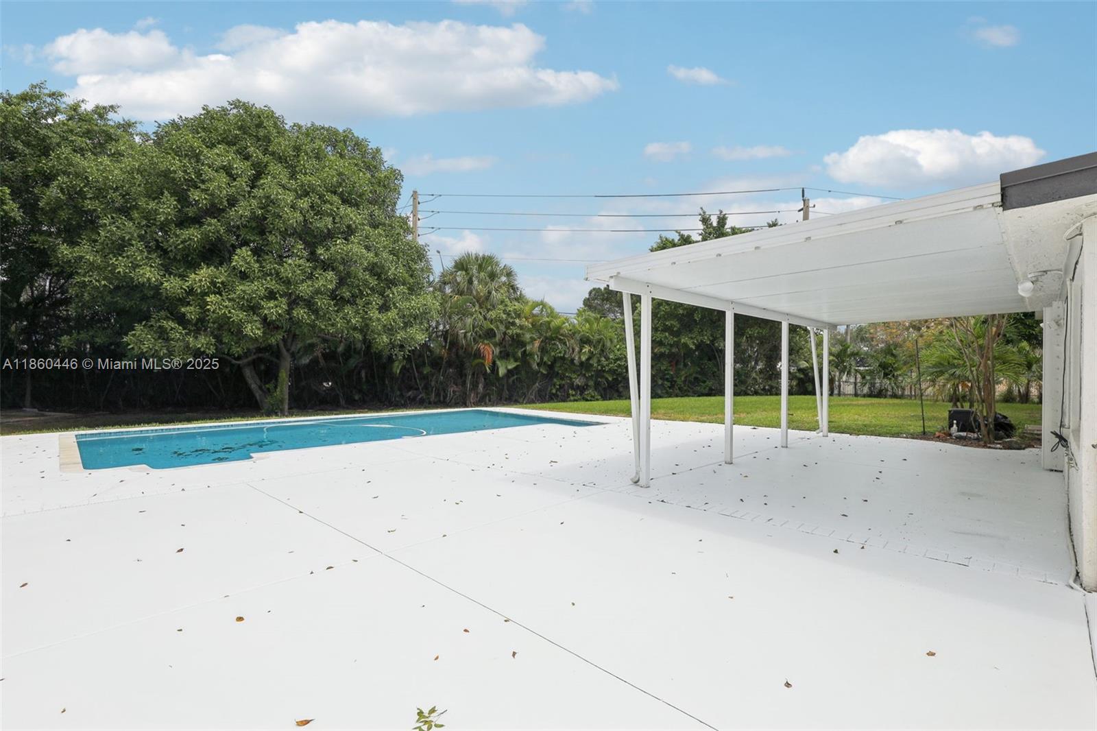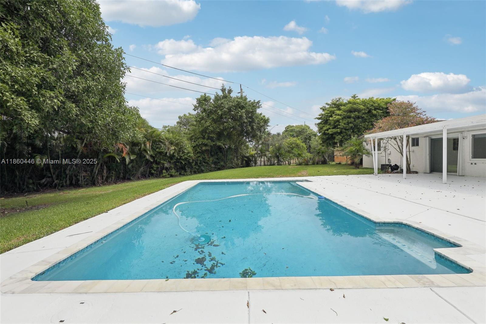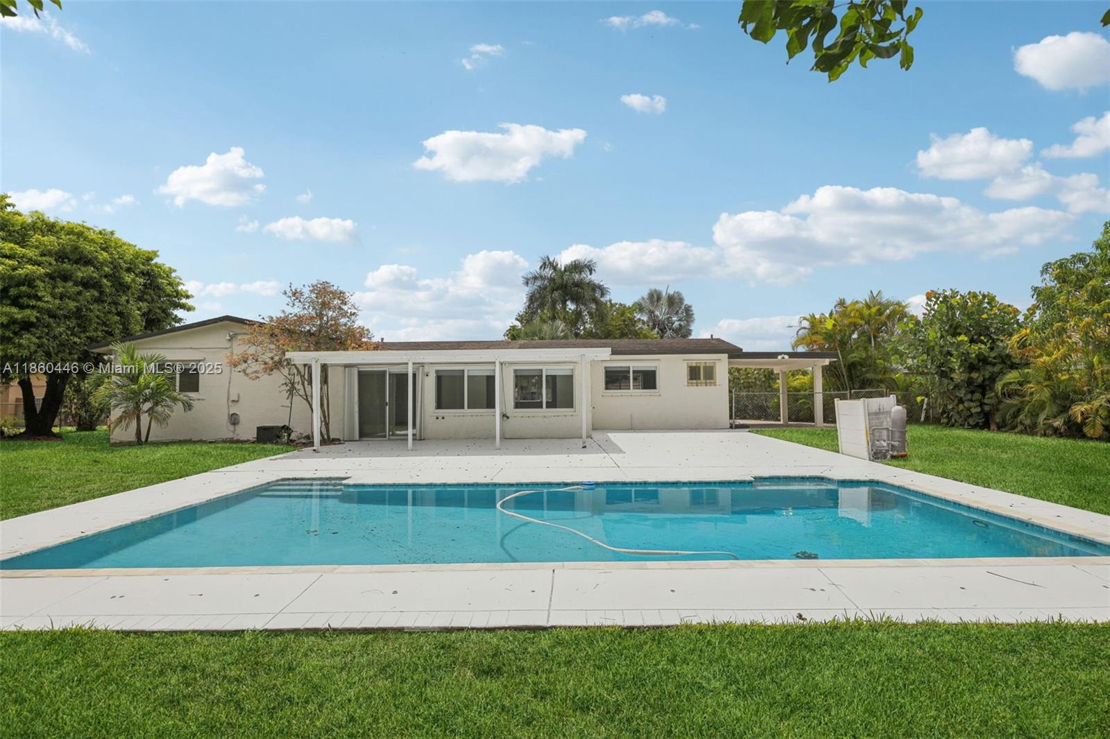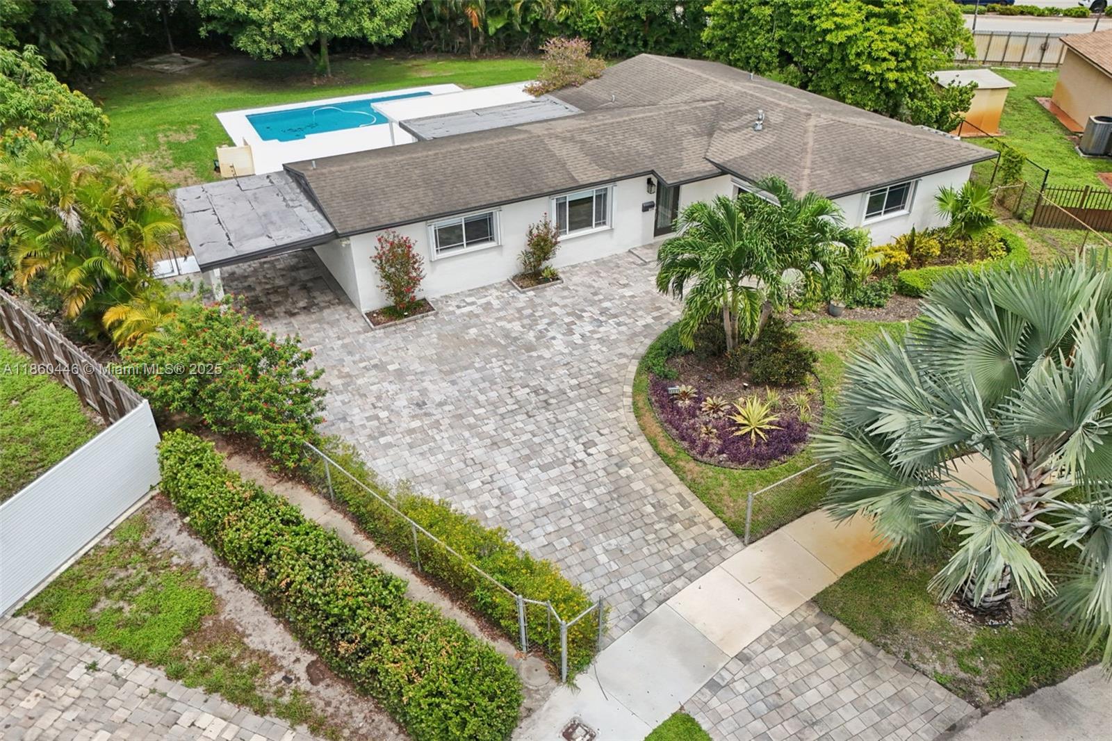 Beautifully maintained 3-bedroom, 2-bathroom, 1 car garage home offering 1,558 sq ft (as per appraisal) of comfortable living space on an incredible 18,491 sq ft lot. Enjoy a recently resurfaced oversized pool—perfect for relaxing or entertaining. Step inside to find an open layout boasting an updated kitchen with gas stove and beautiful porcelain and terrazzo floors. The bathrooms have been recently renovated with modern finishes. The home is secured with impact windows and doors throughout, with just three openings protected by accordion shutters, qualifying you for the full insurance discount. Additional highlights include a large driveway with stylish pavers redone in 2024, built in closets, gas water heater as well as a freshly painted exterior. This home in move in ready!