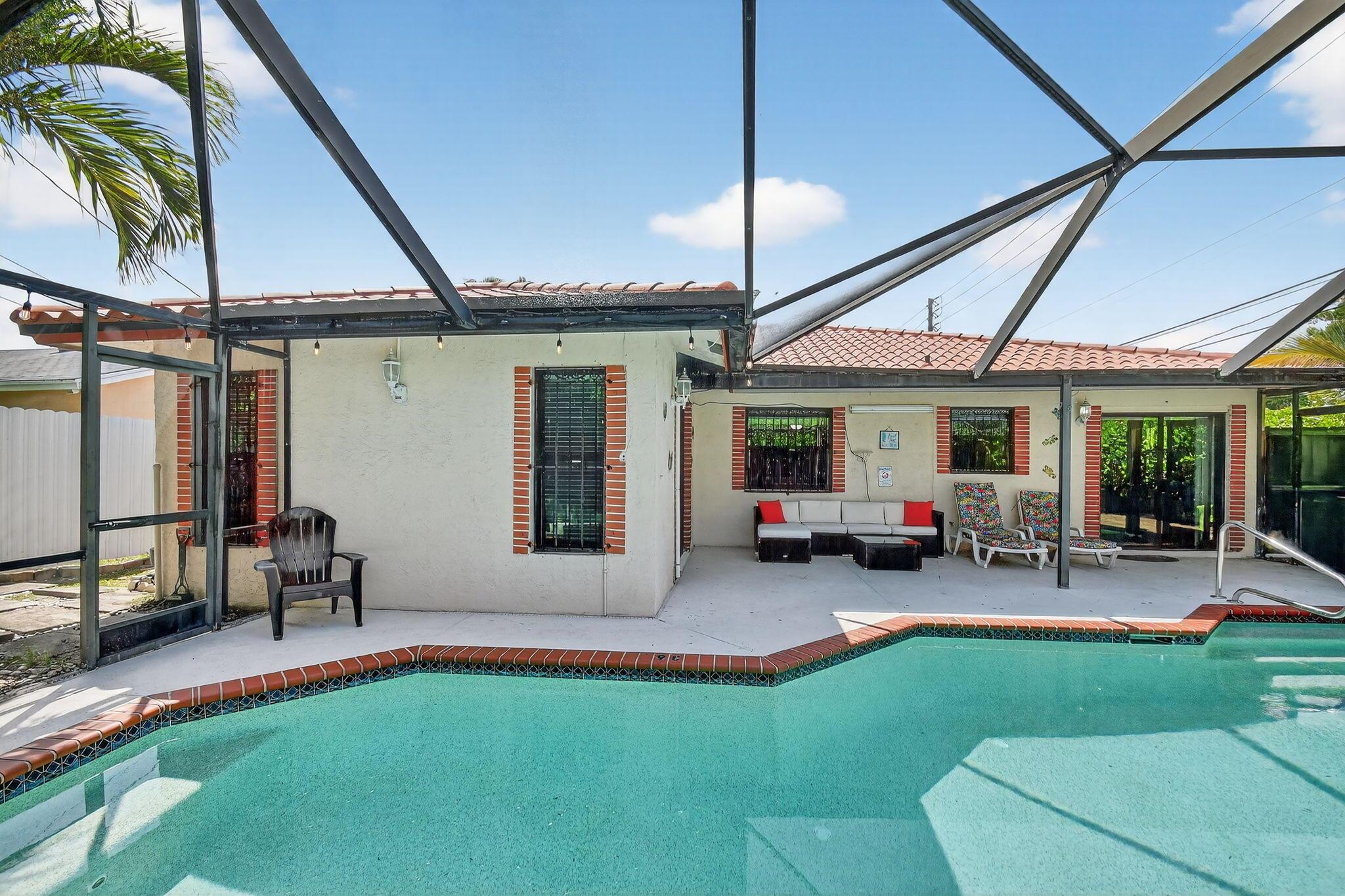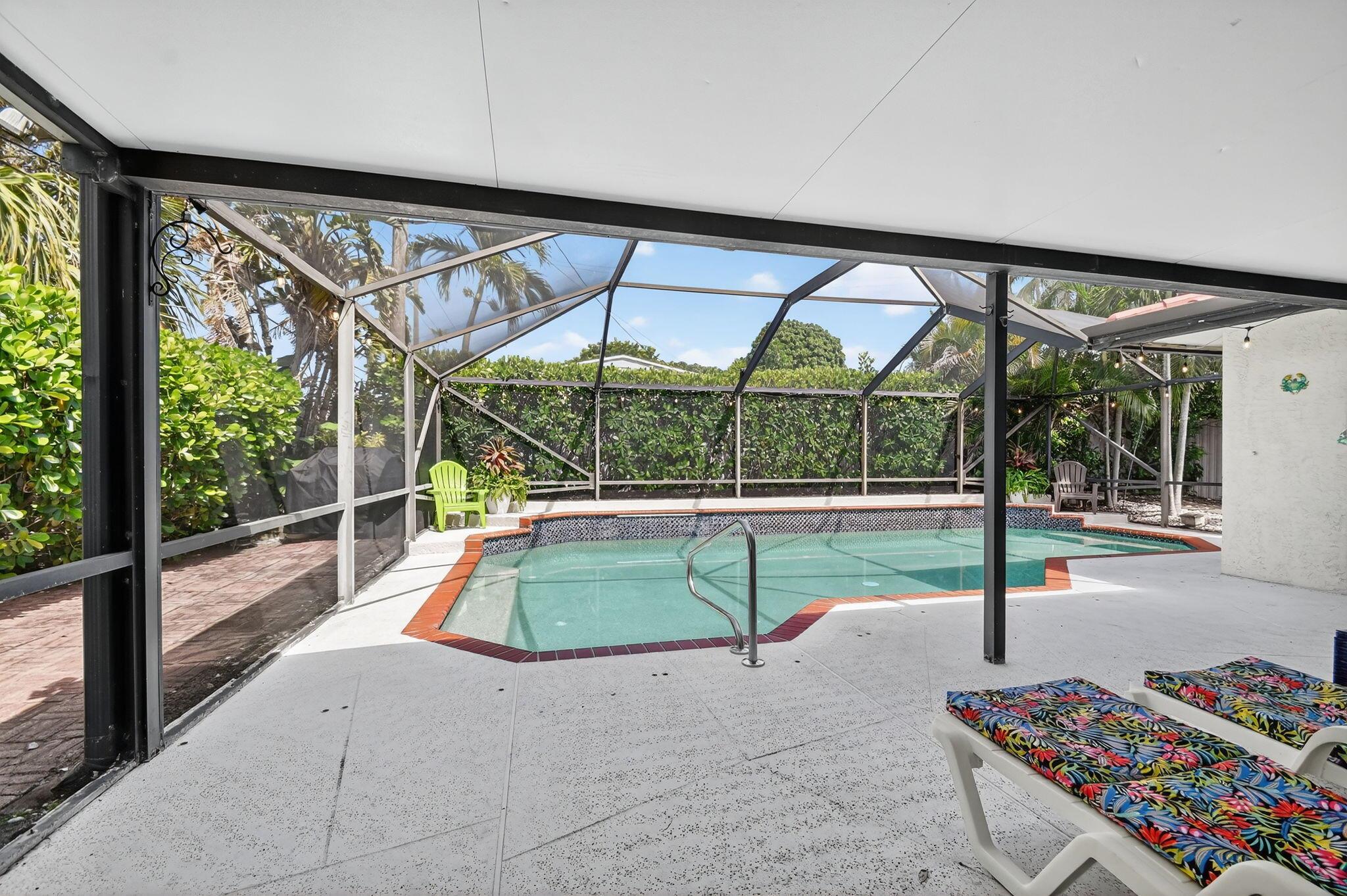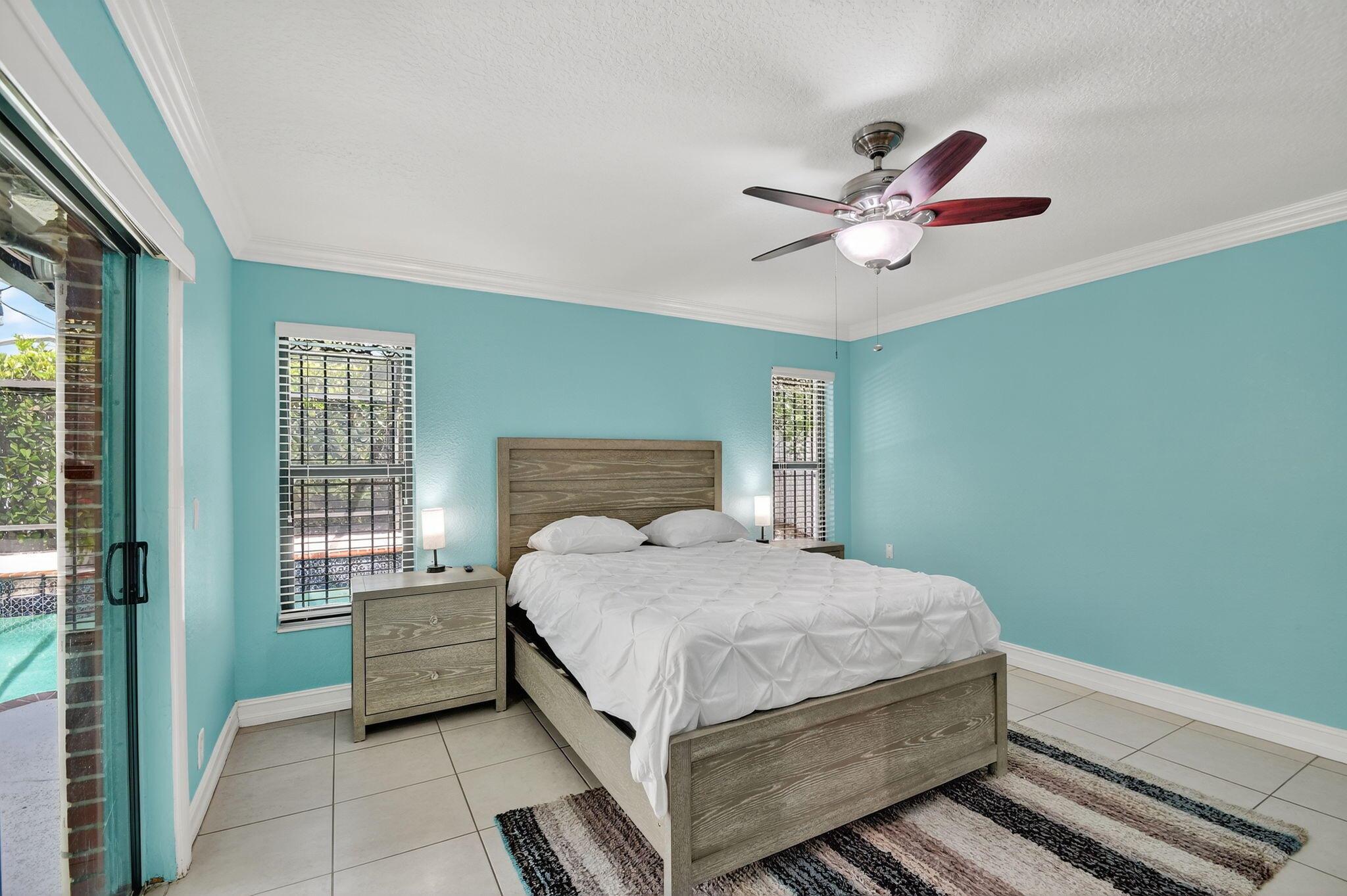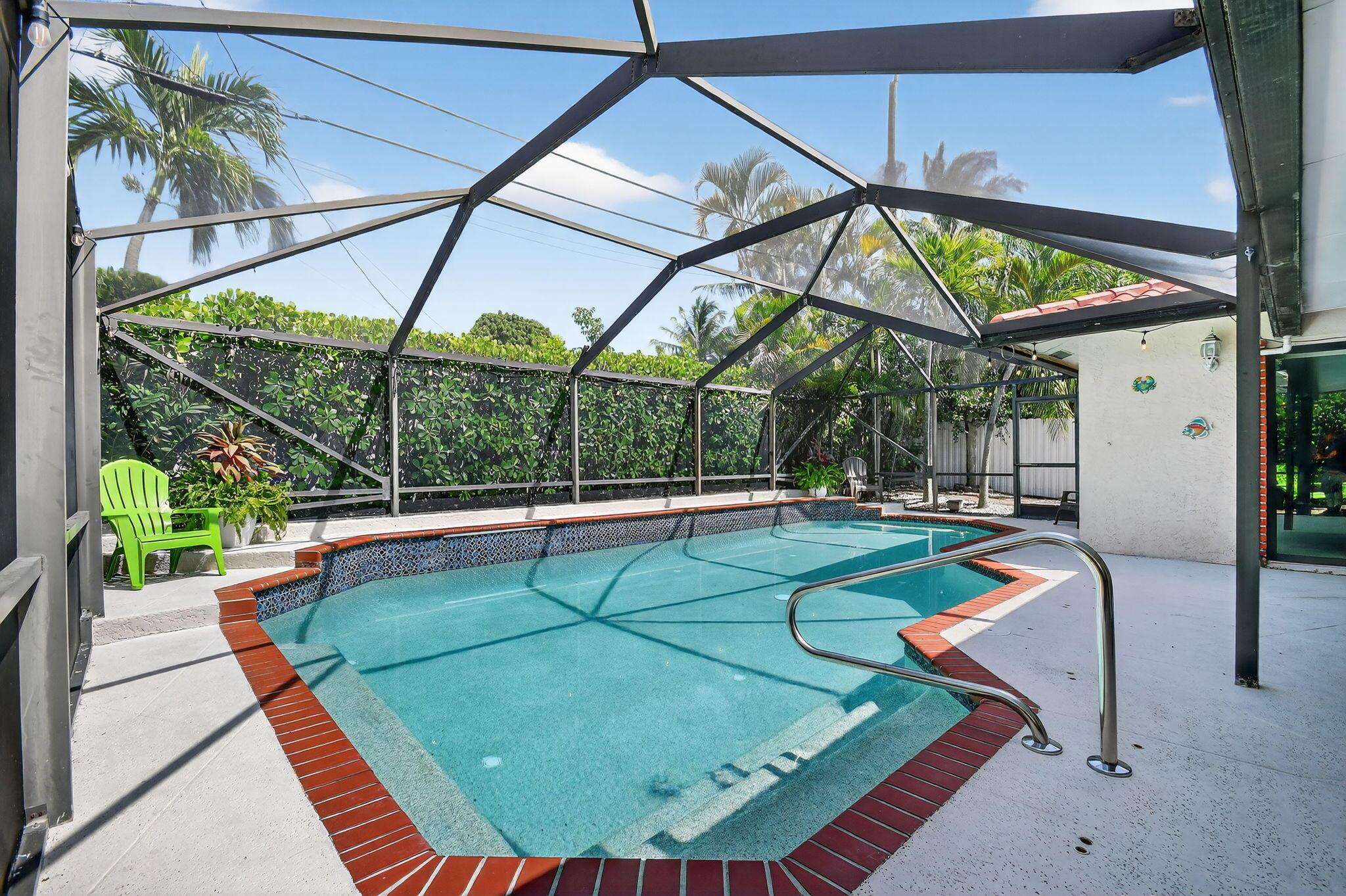 Turnkey vacation rental or family home at the end of the street, no through traffic, next to Dreher Park. A new roof (2022), new water heater, and impact windows, all tile floors home is move-in ready and built for peace of mind. The open-concept layout offers a bright and airy feel, with a large eat-in island kitchen showcasing granite countertops and stainless steel appliances. The split-bedroom floor plan ensures privacy, while the master suite includes a generous walk-in closet and a large bathroom. Sliding impact-glass doors provide direct access to the screened, heated pool w/seating, a waterfall, fenced yard clusia hedges!