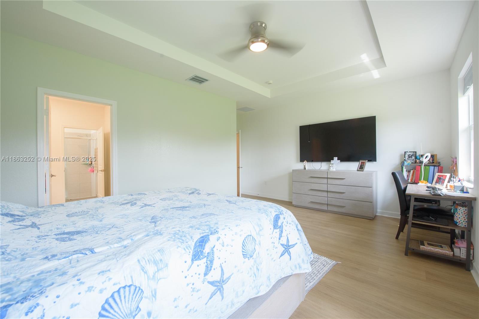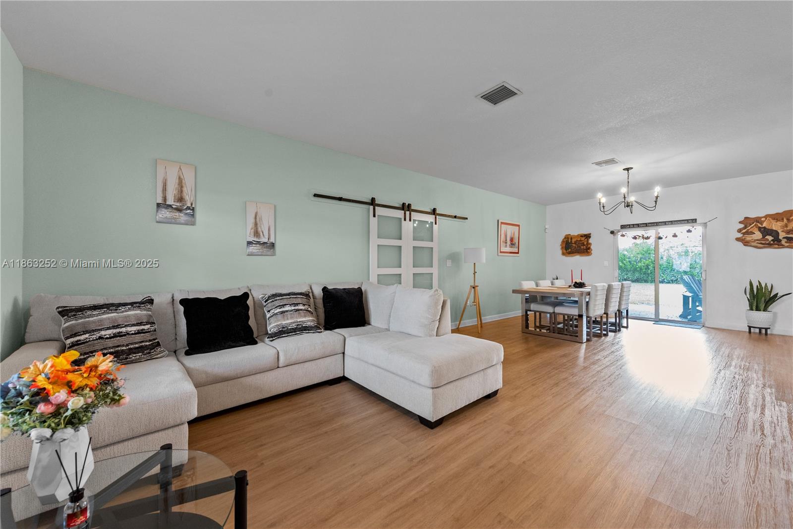 Elegant 5BR/4.5BA Estate featuring sleek tile & laminate floors, impact windows, designer shades, and custom barn doors. Gourmet kitchen boasts white cabinetry, stainless steel appliances, Corian countertops, island with sink & pantry. Formal dining with chandelier, spacious family room, and covered patio with pavers—perfect for entertaining. In-law suite with private entry, kitchen, split A/C, and 2 full baths. Lavish master with tray ceiling, spa-style bath, dual sinks, glass-enclosed shower, and walk-in closet. 2-car garage, laundry room, fenced yard, LED lighting & more. NO HOA!! PROOF OF FUNDS AND/OR PRE-APPROVAL LETTER REQUIRED PRIOR TO SCHEDULING A SHOWING OF THE PROPERTY!