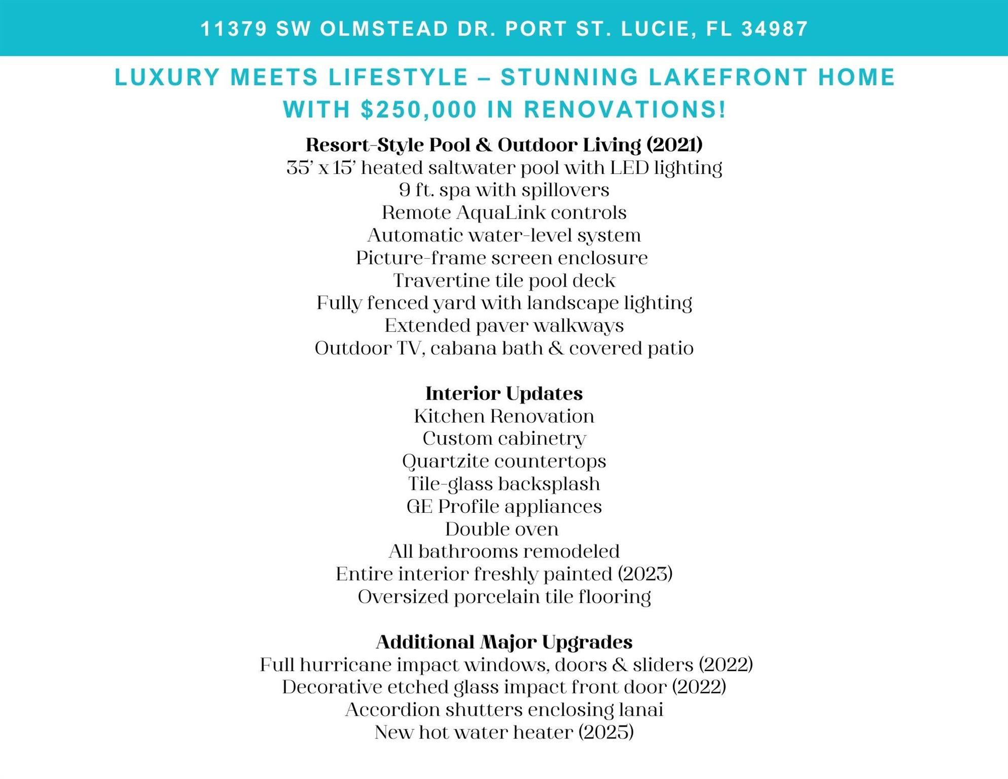 The owners have transformed this peaceful lakefront retreat into their own private paradise. With exceptional pride of ownership, they have thoughtfully remodeled the entire home & invested over $250,000 in upgrades. Truly unmatched in its size and price range, this contemporary residence is move-in ready and designed to impress. Included upgrade list describes the tremendous investment the sellers have lovingly added. Highlights: FULL HOUSE IMPACT GLASS WINDOWS & DOORS, RESORT STYLE HEATED POOL & SPA WITH TRAVERTINE TILE & PICTURE FRAME SCREEN, REMODELED KITCHEN, BATHS & LAUNDRY ROOM, POLISHED TILE FLOORS W/ NO GROUT LINES, AC 2020, HWH 2025, CUSTOM LANDSCAPING, PAVERS, FENCE & LIGHTING, triple crown molding, chair rails, shadow box trim, plantation shutters & LED recessed lighting.