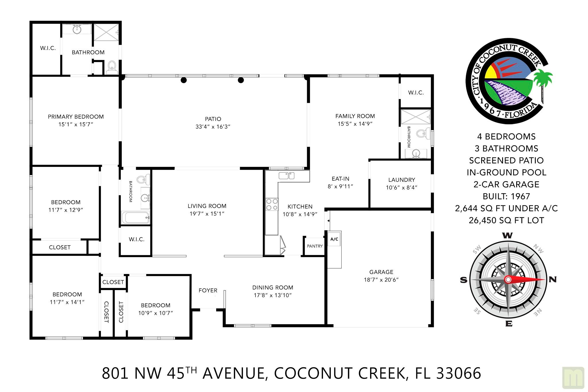 APPRAISED AT 850k. Rarely available Palm Beach Farms section of South Creek with NO HOA. This sprawling 4/3 lake front pool home sits on over an half acre of land. IMPACT windows and shutters for doors. Formal living, dining, family room, generous bedrooms, walk-in closets and HUGE screened / covered patio overlooking the pool and lake. Primary bath and 1 guest bath have access to the patio and pool, 3rd full bath is off the family room. Great neighborhood, close to schools, shopping, walking distance to Windmill Park and the Coconut Creek Community Center, a short drive to The Coconut Creek Promenade, and just 7 miles to the beach. Room measurements in pictures with the floor layout and a 360 virtual tour link. So much house and so much land - come and make this your dream home!!
