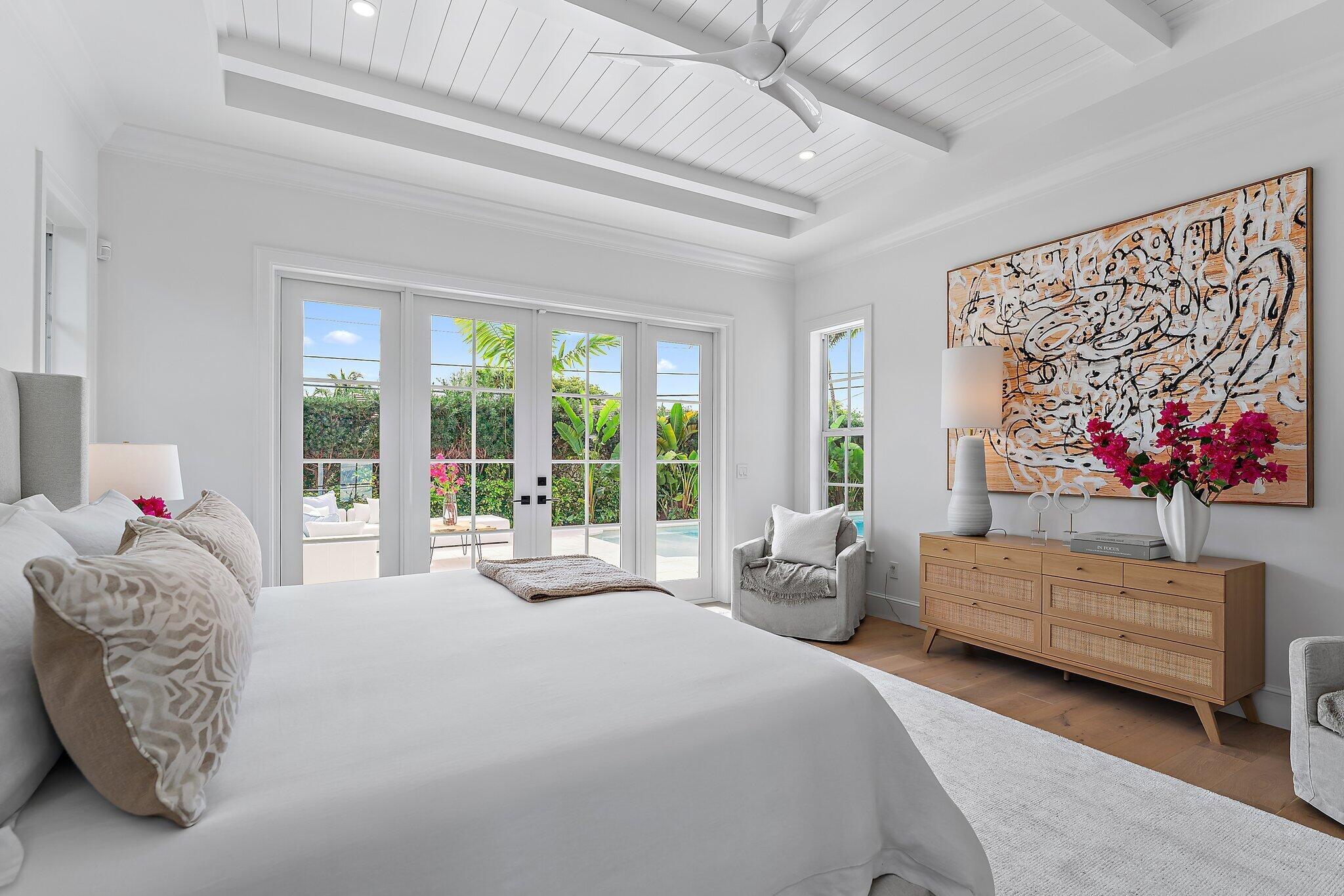 Easterly breezes await off of Lakeside Drive in this brand new construction estate, ''The Palm House'', curated by RJS Builders. Architecturally stunning and nestled amongst beautiful garden views with approximately 5,574 square feet of indoor/outdoor space, 4,046 square feet under air, for a total of 4 full bedrooms, plus den, loft, and 4.5 bathrooms. Beyond the coral stone foyer and private office, an expansive living room with fireplace and dining area seamlessly transition under voluminous ceilings, with wood beams above white oak floors, each with uniquely orchestrated garden and pool views. Stately Chef's kitchen, prep pantry with second refrigerator, dry bar with wine cooler and ice maker, and counter seating for gatherings, is anchored by white cabinetry and select