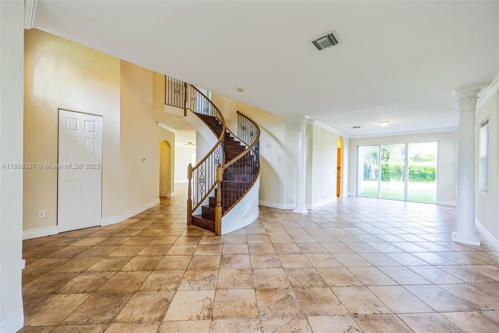 This spacious two story home offers a 6/4 layout with a three car garage and sits on a well-kept corner lot. The interior features cathedral ceilings and an elegant oval staircase that enhances the open design. With its generous floor plan and distinctive details, this property presents a strong option in the market.