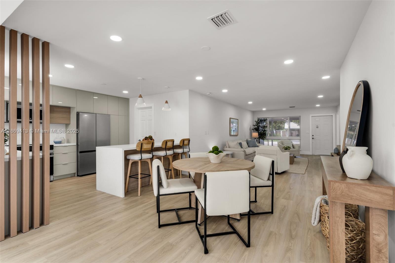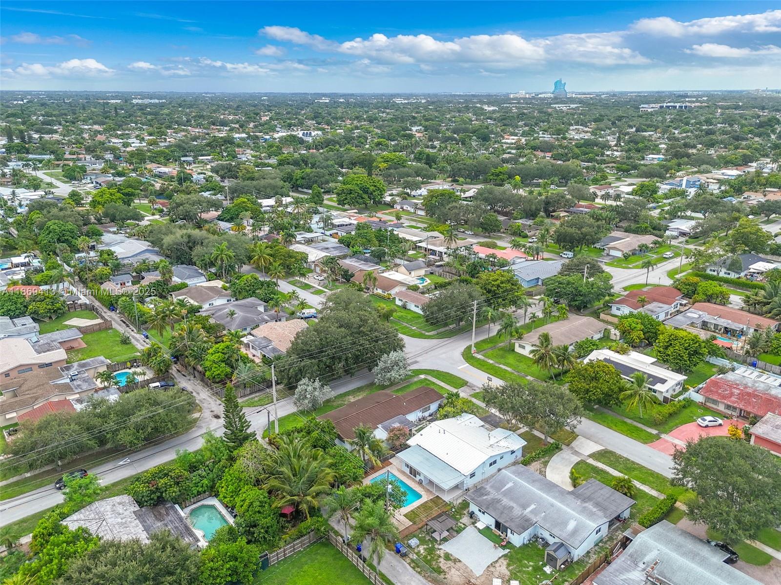 Seller highly motivated — offering closing cost contribution with full-price closing. Beautiful 3BD/2BA home in sought-after Hollywood Hills with 1,558 sq ft of stylish living on a 6,251 sq ft lot. This one-story residence offers an open layout with impact windows/doors, metal roof, and wide-plank flooring. Modern kitchen with quartz countertops, waterfall island, custom cabinetry, and new stainless steel appliances. Bathrooms feature designer finishes and contemporary fixtures. The primary suite includes a walk-in closet and private bath with dual vanities and glass shower. Garage with laundry, plus a backyard oasis with covered patio, new tile flooring, ceiling fans, and sparkling pool. Conveniently near schools, shopping, dining, highways, and minutes from beaches. No HOA.