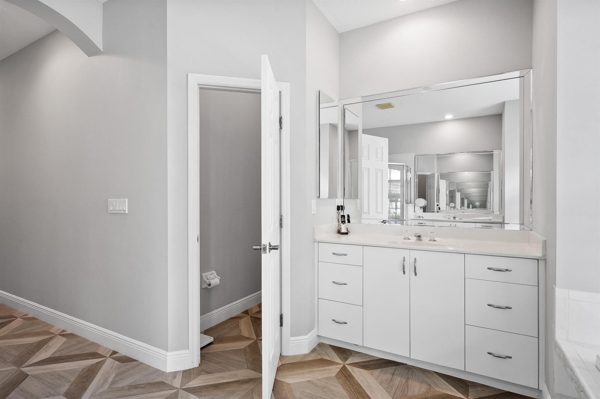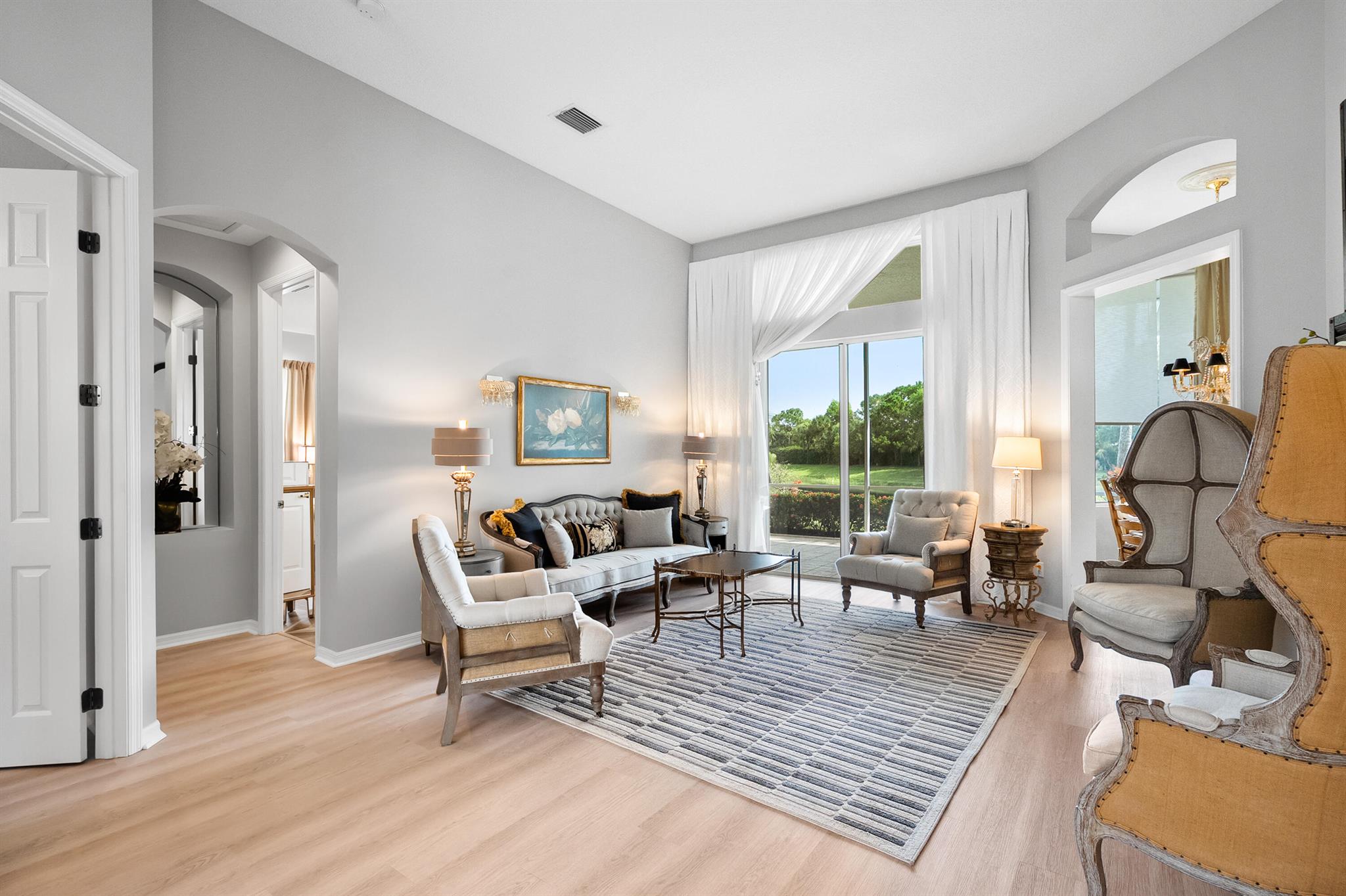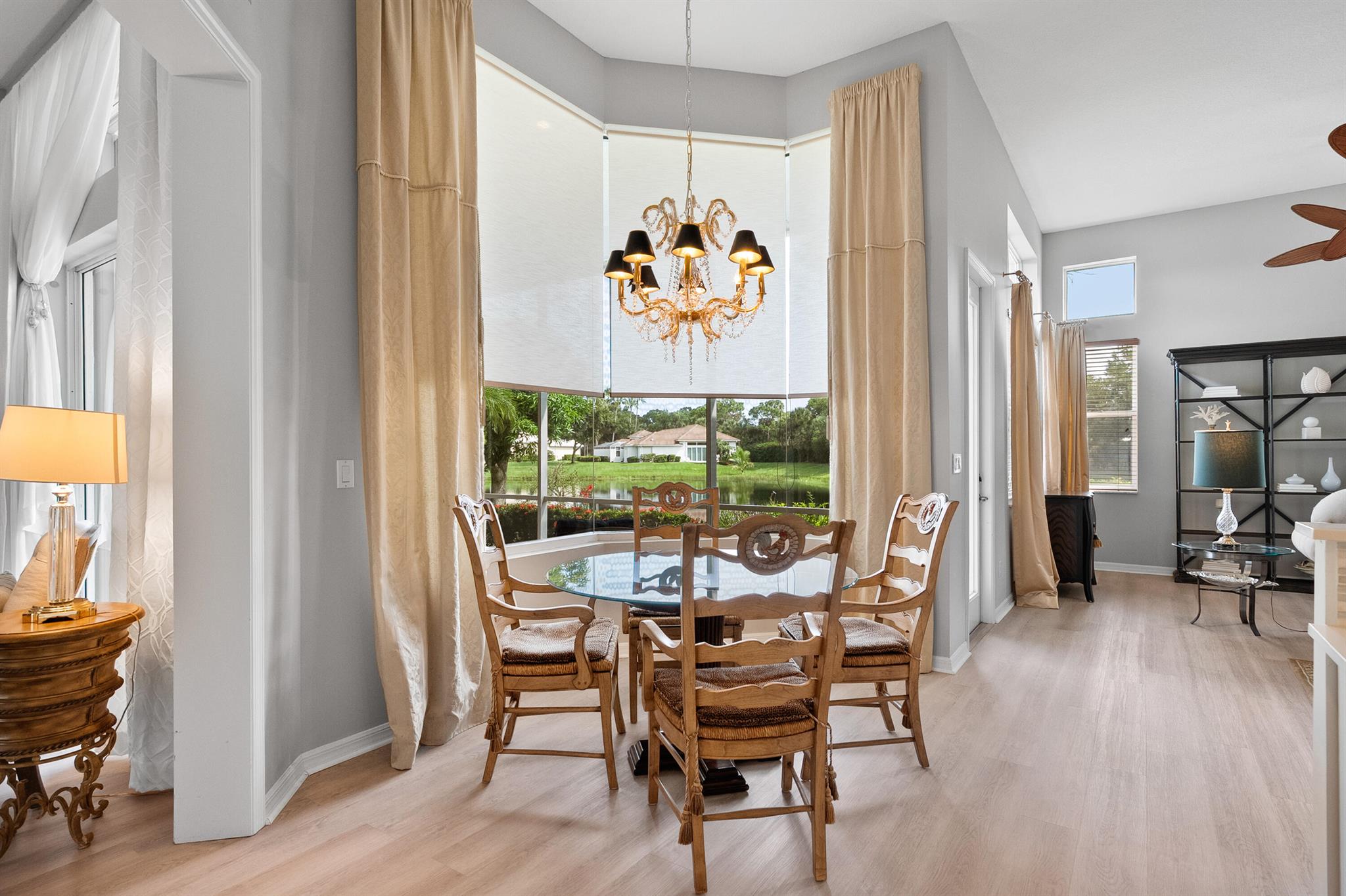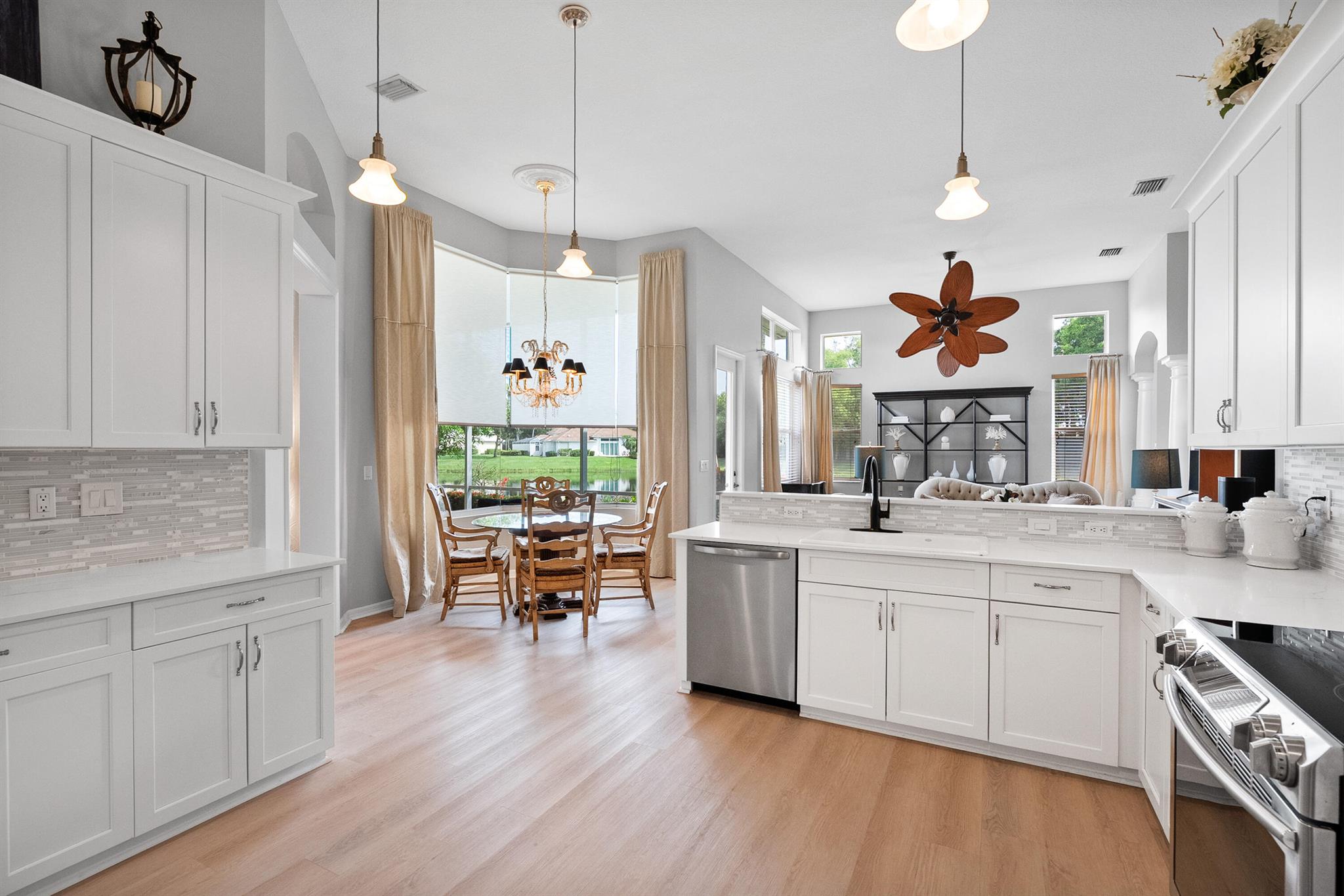 Elegance with modern renovations in this captivating floor Plan. Featuring light, neutral vinyl floors, soaring 12' ceilings in the main living areas, and 10' ceilings throughout the rest of the home, this residence is filled with natural light from abundant windows. Updated kitchen showcases white quartz countertops and stainless steel appliances. Floor plan includes a formal dining room, living room, and family room, plus 4 bedrooms and 3.5 baths. One bedroom is an en suite ideal for a nanny or in-law quarters, while another bath serves as a cabana. Enjoy tranquil lakefront views, beautiful mature landscaping, a 2021 roof, and complete hurricane panels. Community amenities include a clubhouse, pool, tennis, fitness center, and optional golf club with cafe and dining. Membership Optional