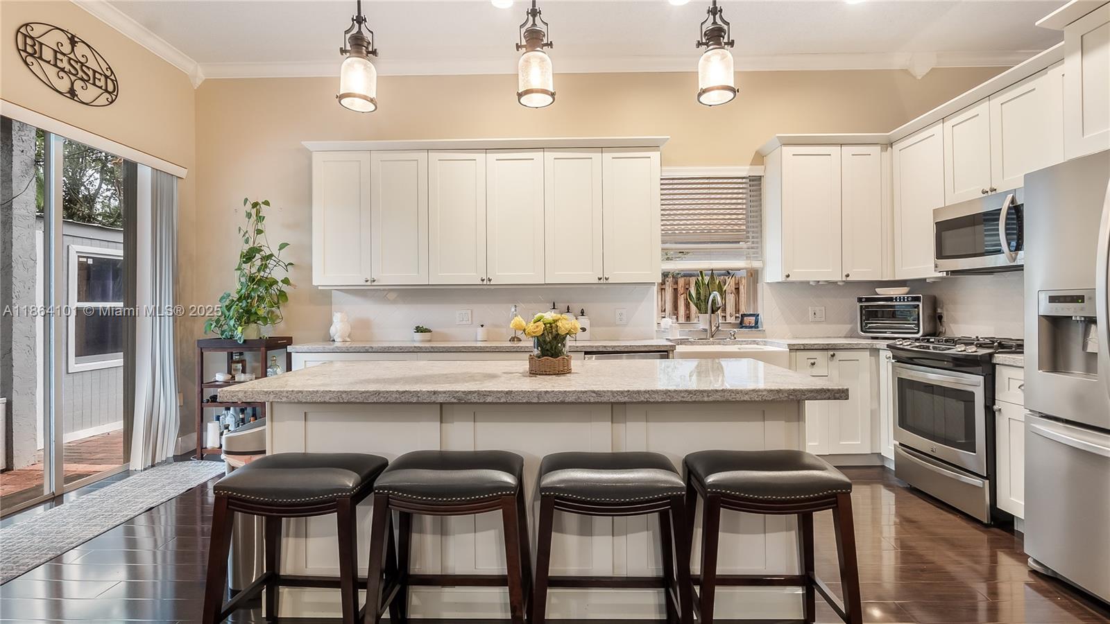 Welcome to this inviting single-story home, featuring three cozy bedrooms and three well-appointed bathrooms. Boasting a beautifully remodeled kitchen completed in 2020, you'll find stylish shaker cabinets with slow-close hinges, a charming farm sink, and brand-new appliances that blend functionality with elegance. The entire house is adorned with stunning dark laminate wood flooring, creating a warm and welcoming atmosphere. Recent upgrades include a new A/C system installed in 2023 and a hot water heater that was added in 2025, ensuring modern comfort and efficiency. Step outside to discover a refreshed pool area, resurfaced with diamond brite, complemented by new tiles, coping, and an upgraded pump from 2024. Safety is prioritized with the inclusion of a child fence for peace of mind