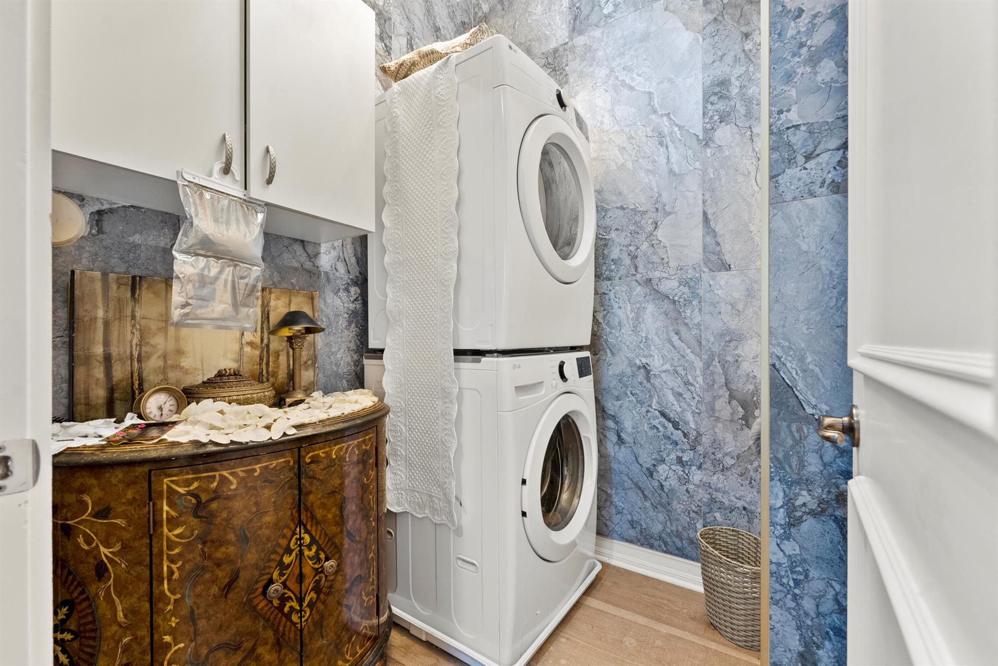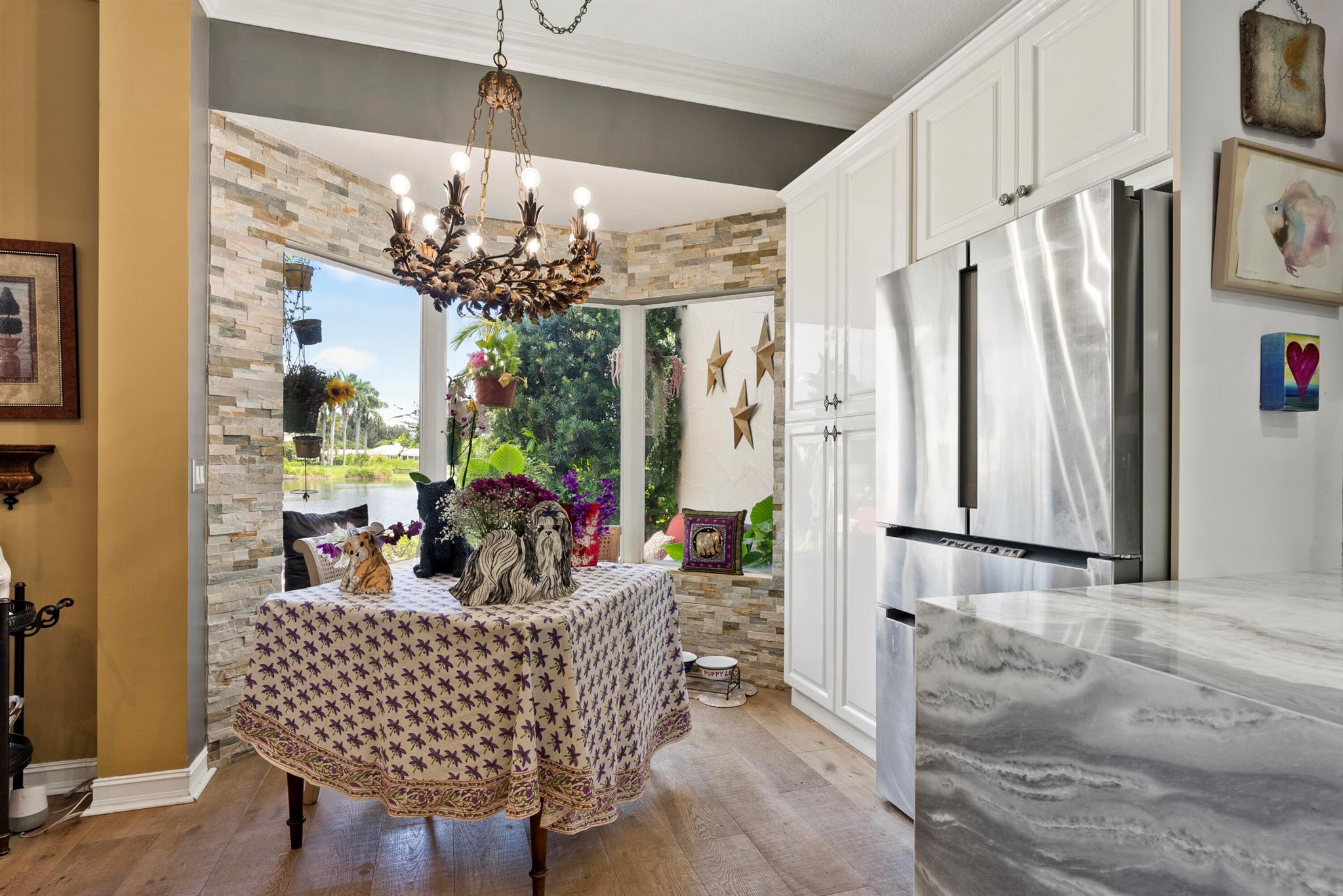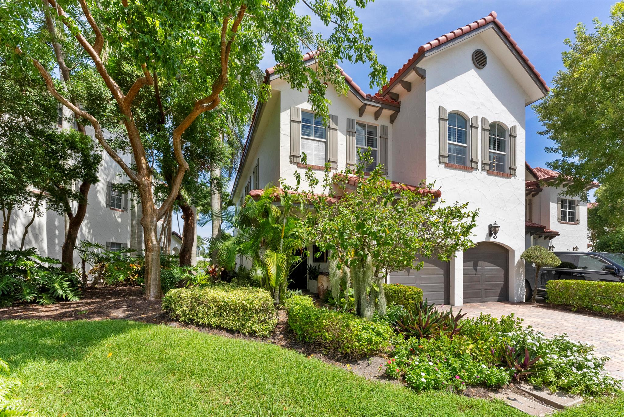 This upgraded Magellan model townhome offers 2,900 sqft with lake and Intracoastal views. It features professionally landscaped exteriors, paved driveways, and a motorized screened-in porch. Inside, find wood flooring, 10-ft ceilings, and an open floor plan centered around a chef's kitchen with quartzite countertops, stone accent wall, induction range, and recent appliances. A custom bar with wine fridge enhances entertaining. The home includes three bedrooms, an upstairs laundry room, and a large closet for elevator installation. The primary suite offers his-and-hers bathrooms, a private balcony, and a secondary patio. Pet-friendly neighborhood. Additional features include two A/C units, a new marble bathroom, impact windows, newer roof, and full home security.