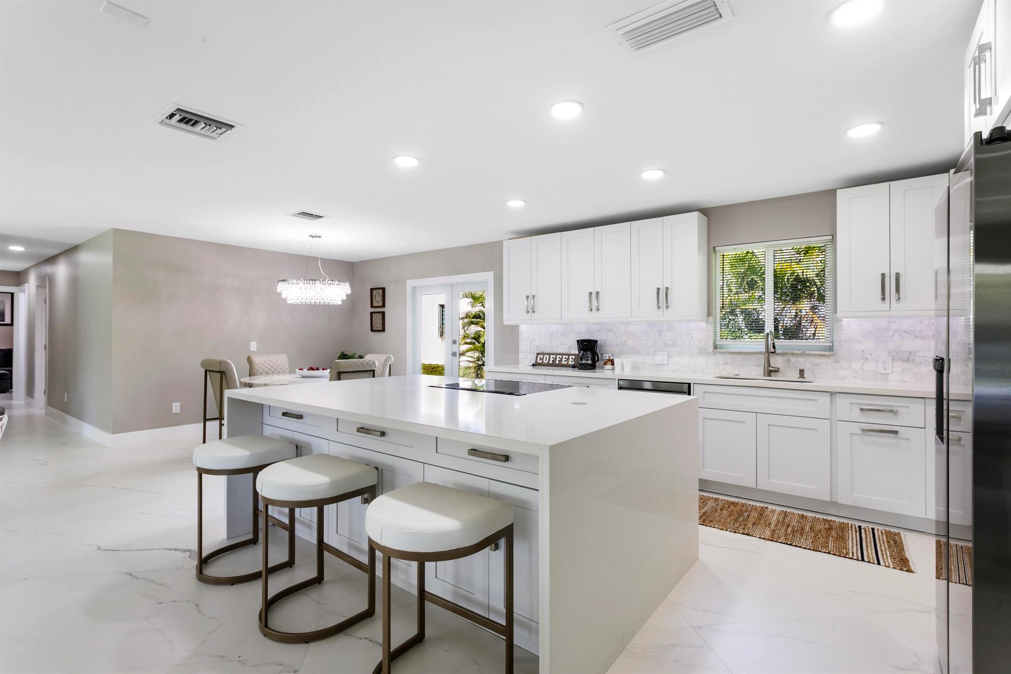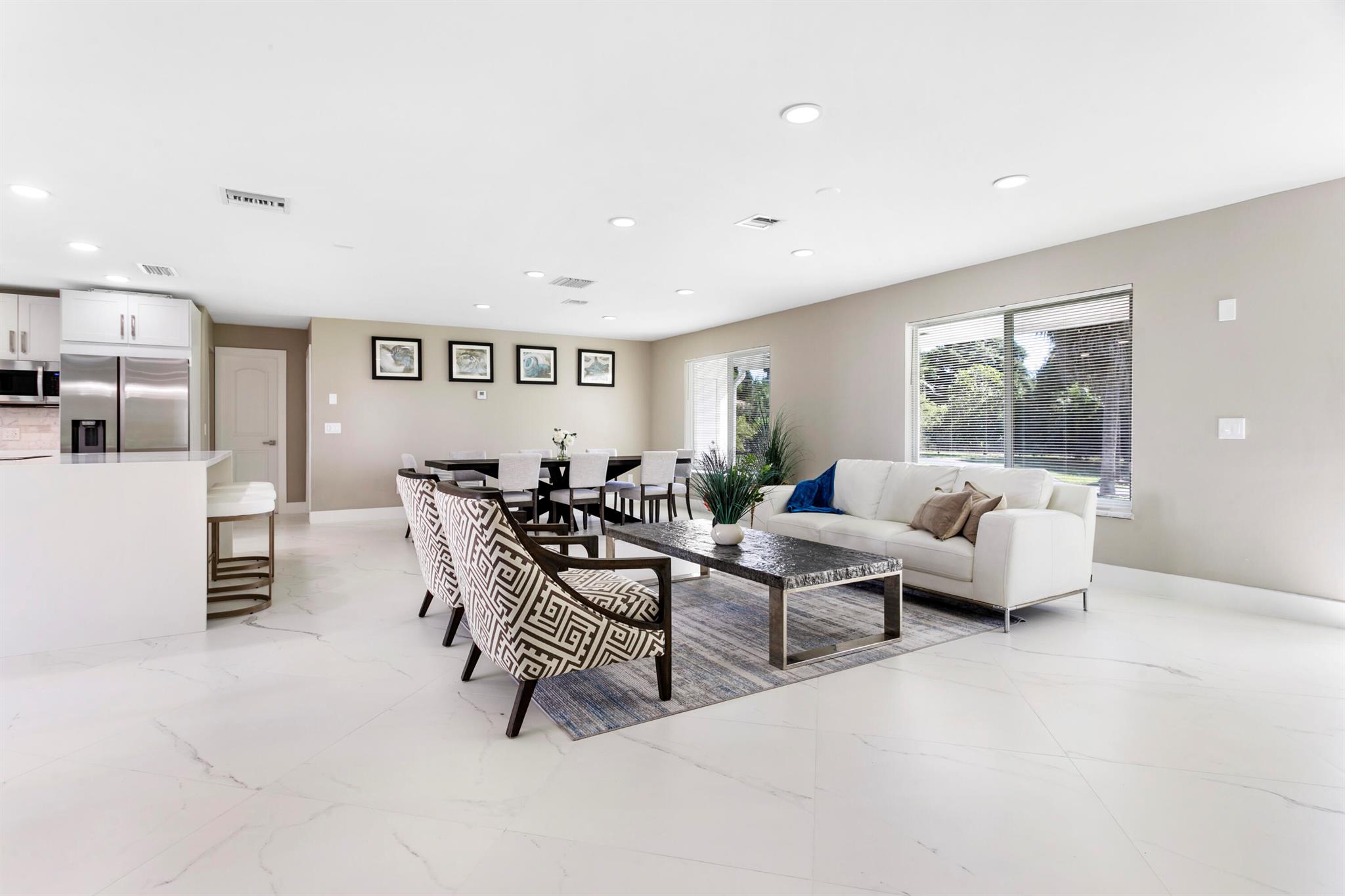 A rare opportunity awaits in Haverhill Riding Estates with this 2.11 acre property offering endless possibilities. The parcel provides potential for a 6-7 new single home development or the enjoyment of a private residence that sits on 1/2 acre and is surrounded by over 91,900 sf of lush grounds filled with mature fruit trees. Whether you envision development potential or a serene private retreat, this property delivers. The existing CBS home 4 BR, 3.5 BA, 2-Car Garage has been fully renovated and designed for modern living. Highlights include 32x32 porcelain tile flooring, 8' ceilings with recessed LED lighting, and smart home features throughout. The open-concept kitchen boasts a quartz island, Carrera marble backsplash, solid wood shaker cabinetry, and Samsung SS appliances.