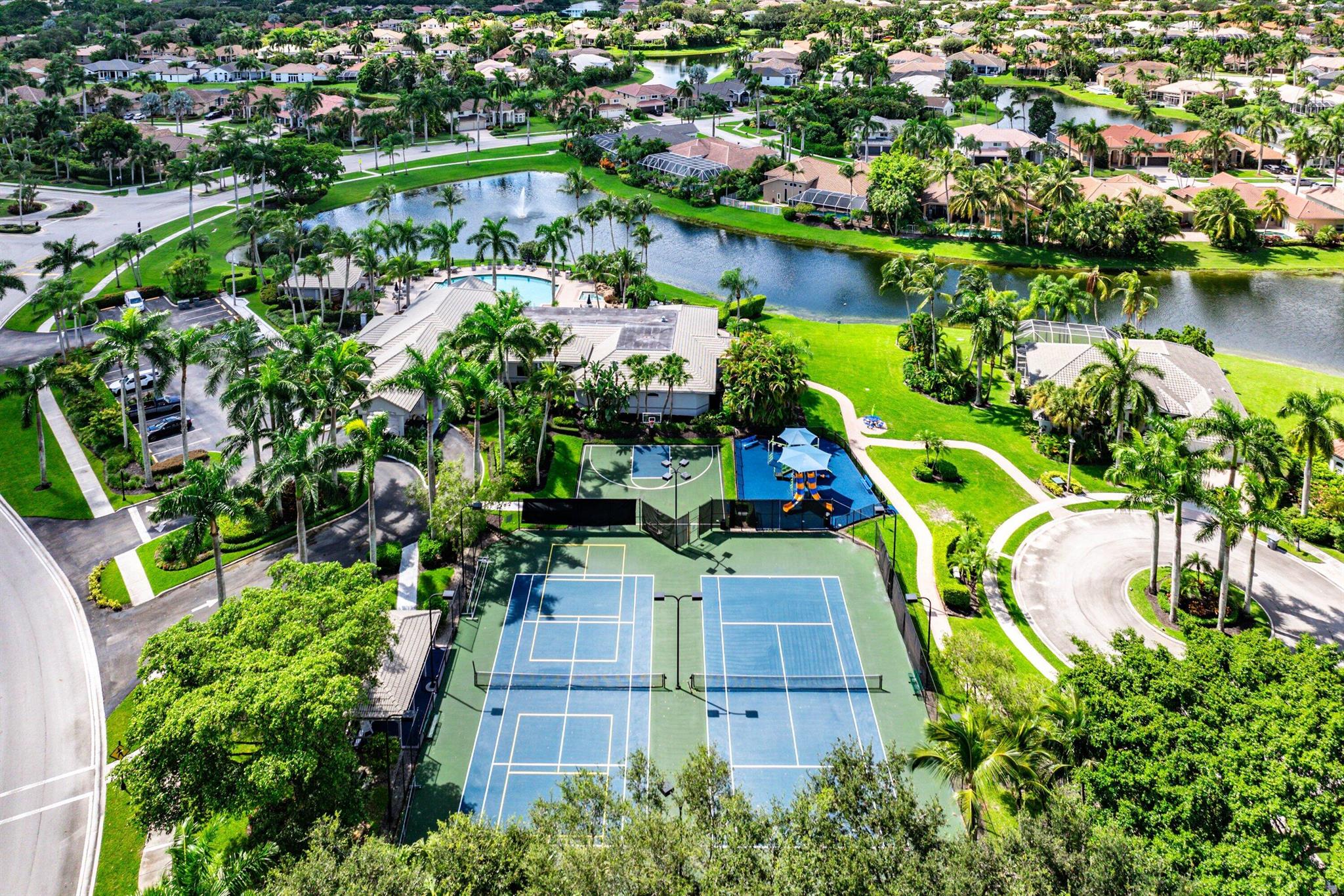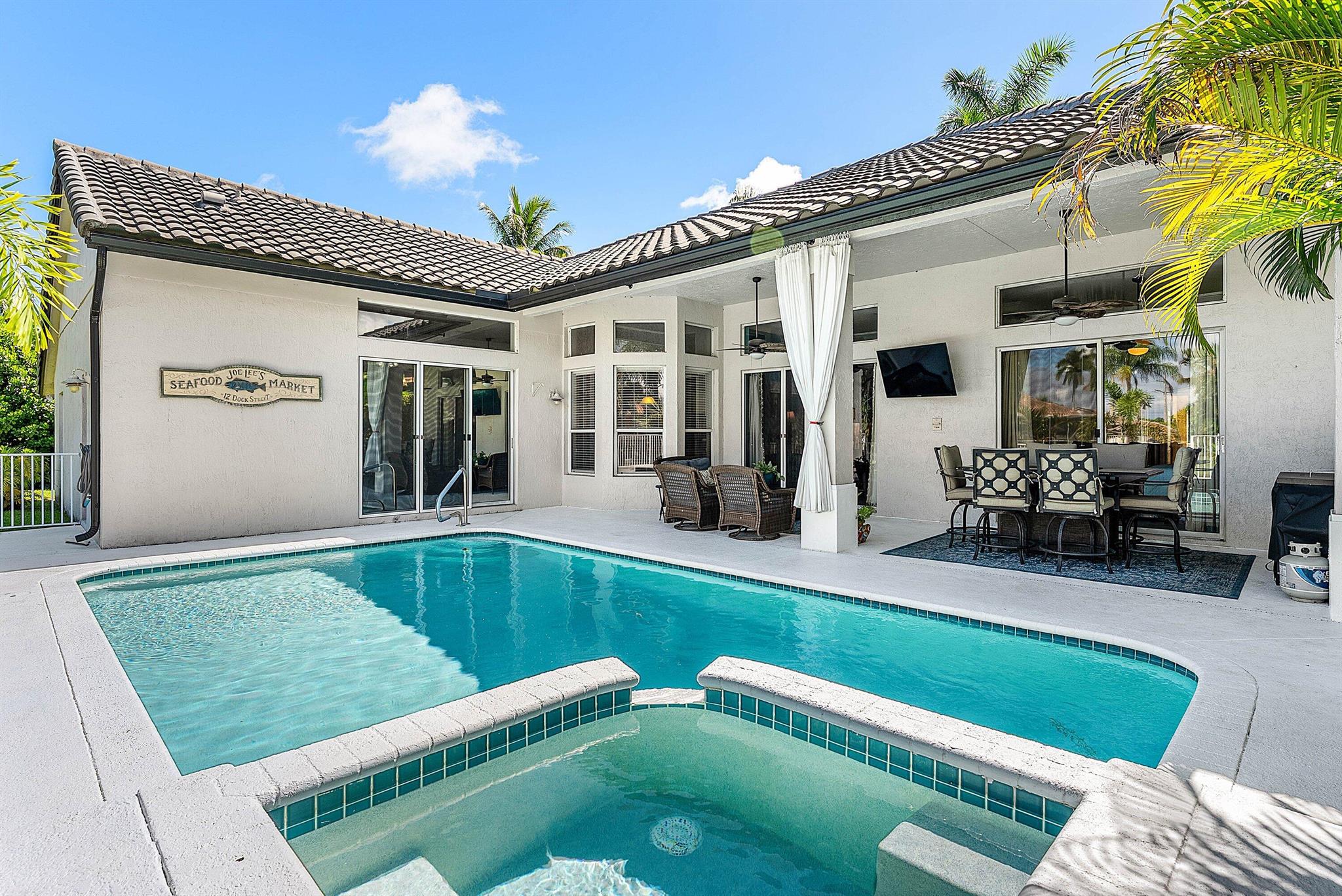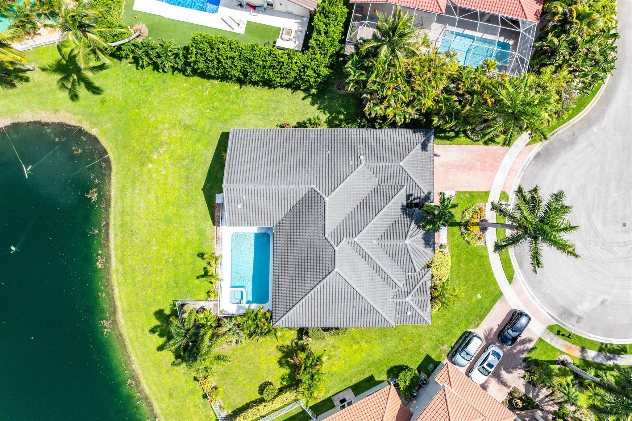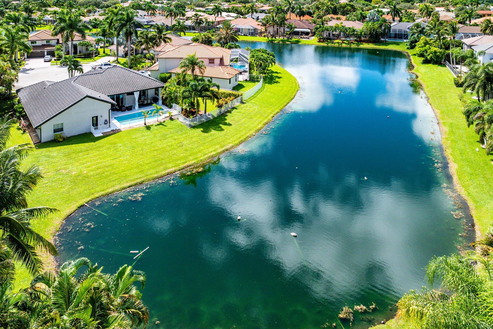 Opportunity to own this popular Cayman V model on highly sought-after oversized, pie-shaped cul-de-sac lakefront lot in gated community. Welcoming double door entry. Volume ceilings, and many updated features throughout the home, roof 2022 - come see! Spacious primary suite opening to upgraded pool and spa, adjacent bedroom can serve as study w/three more bedrooms on the other side. Generously-sized kitchen overlooks spacious family room with breakfast nook - great view of the pool! Expansive covered patio, perfect for relaxing while enjoying the stunning views of the lakefront. Convenient cabana bath. This gated community offers many amenities, including clubhouse with many activities: fitness center, resort-style pool and spa, playground, tennis and basketball courts.