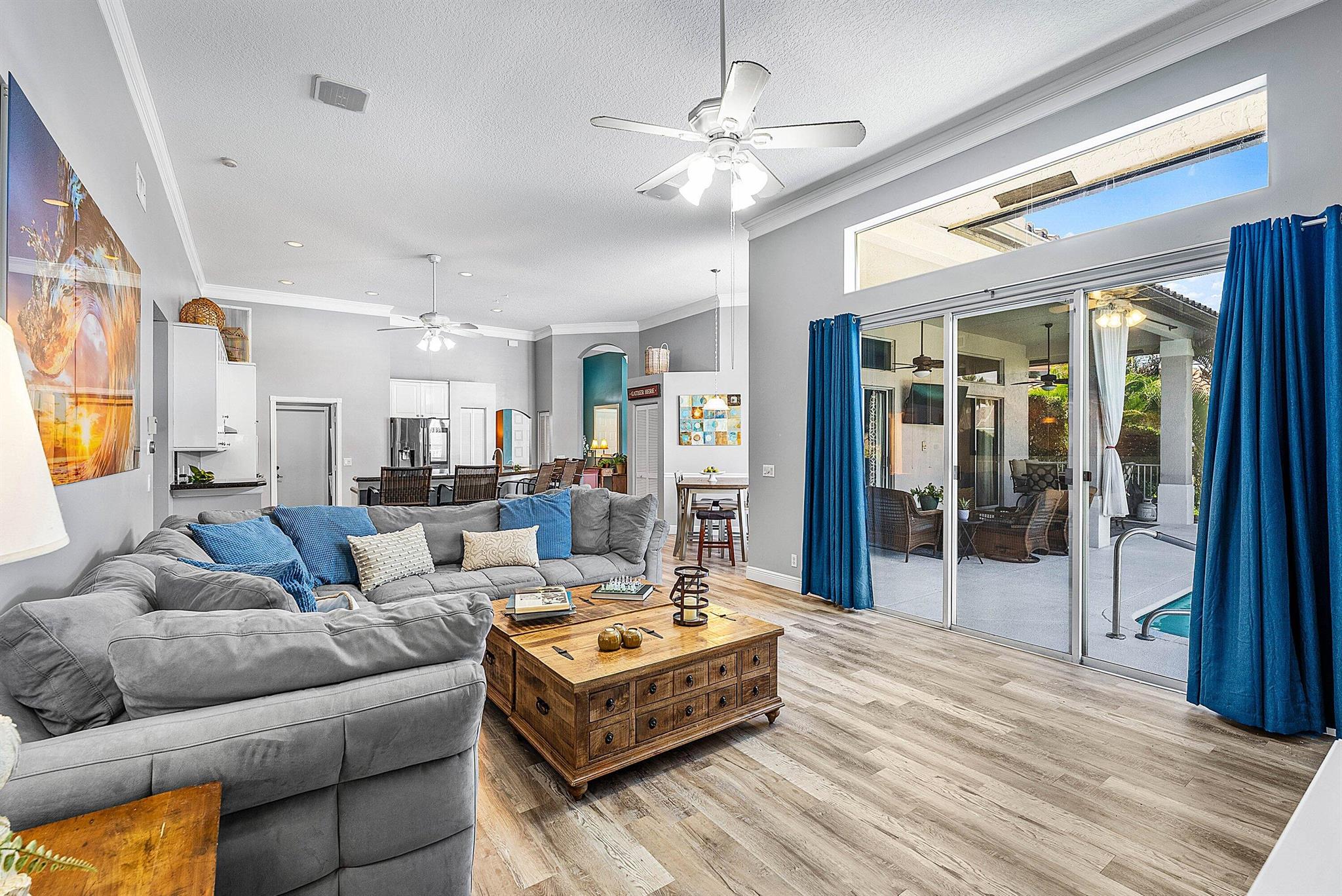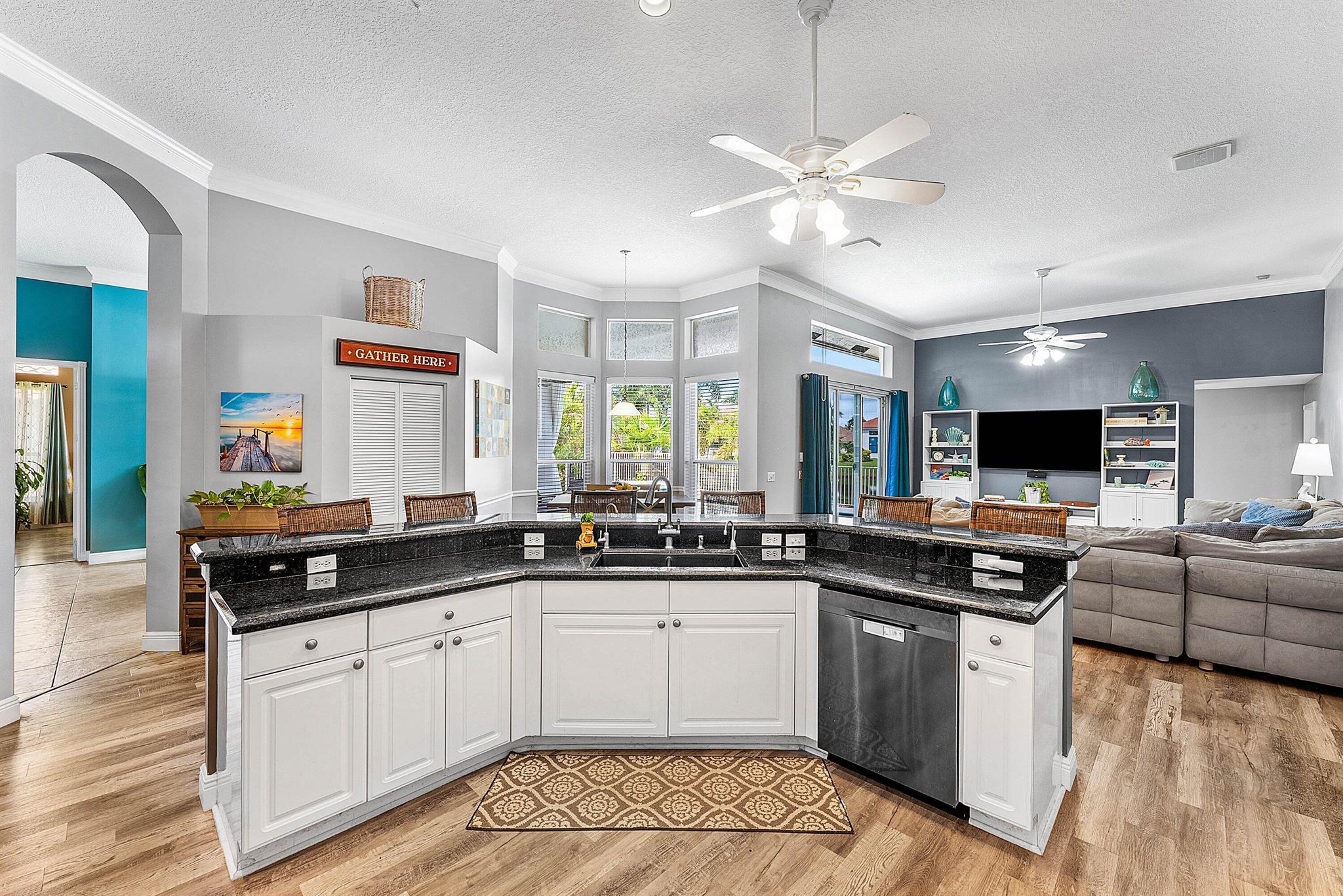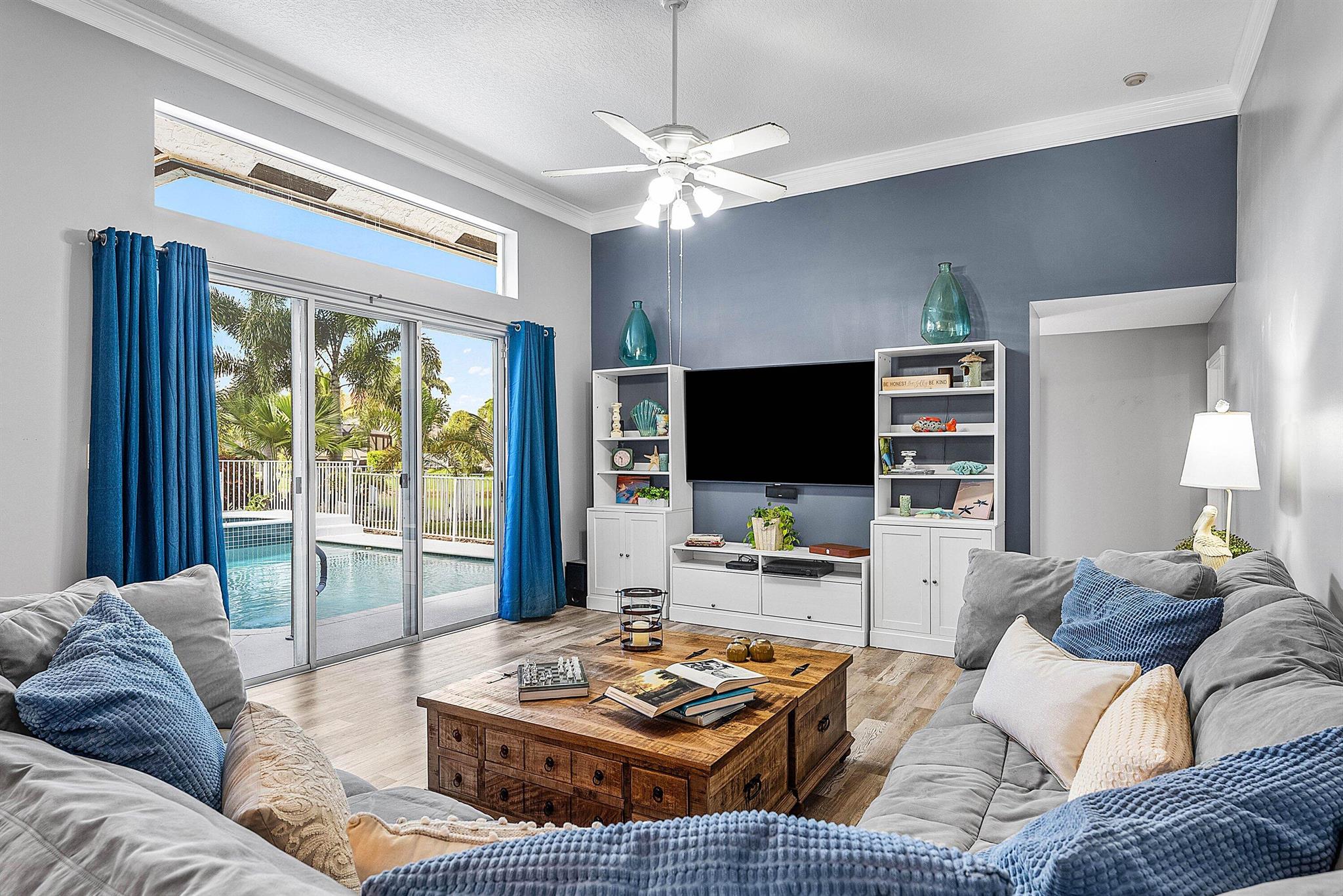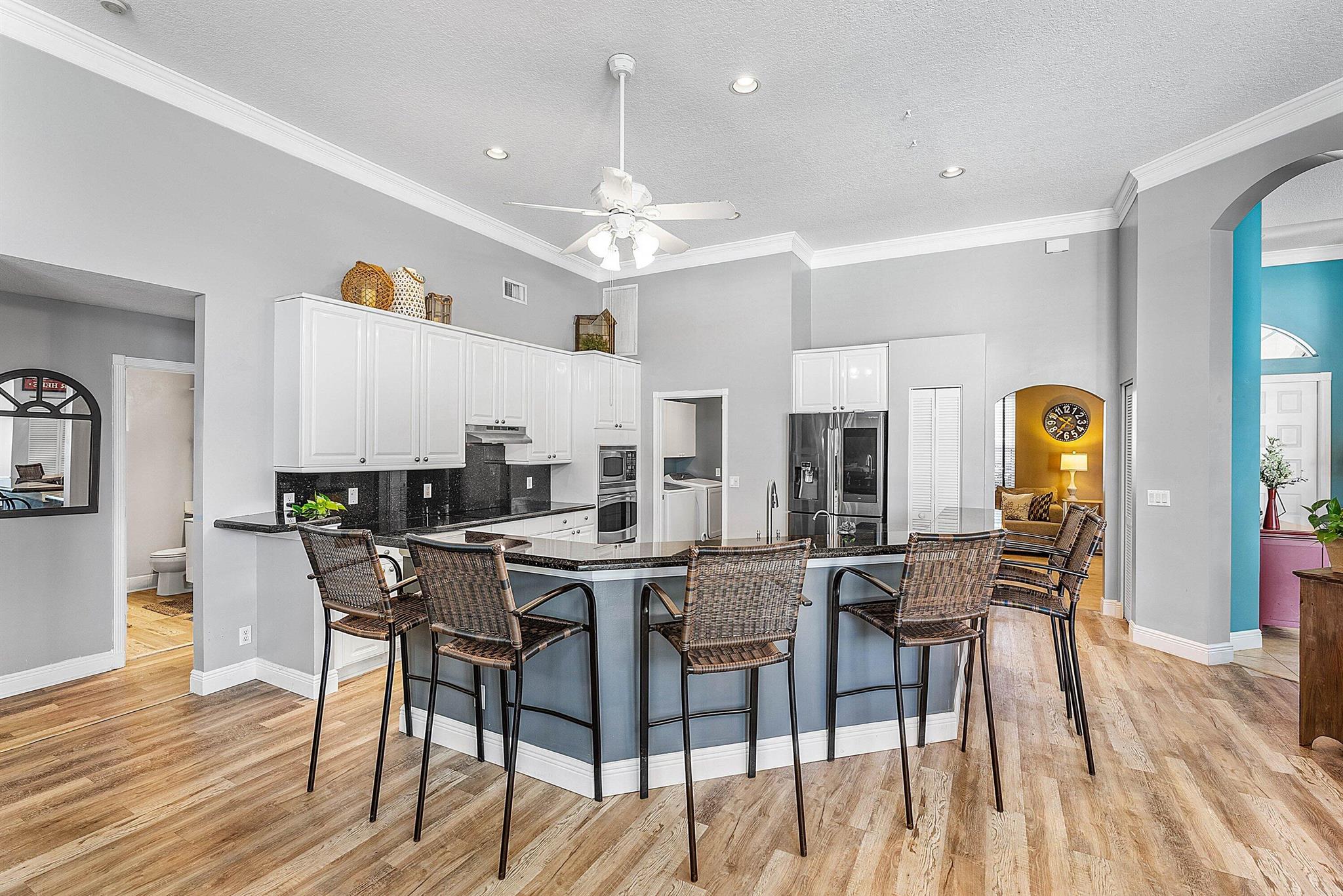 Opportunity to own this popular Cayman V model on highly sought-after oversized, pie-shaped cul-de-sac lakefront lot in gated community. Welcoming double door entry. Volume ceilings, and many updated features throughout the home, roof 2022 - come see! Spacious primary suite opening to upgraded pool and spa, adjacent bedroom can serve as study w/three more bedrooms on the other side. Generously-sized kitchen overlooks spacious family room with breakfast nook - great view of the pool! Expansive covered patio, perfect for relaxing while enjoying the stunning views of the lakefront. Convenient cabana bath. This gated community offers many amenities, including clubhouse with many activities: fitness center, resort-style pool and spa, playground, tennis and basketball courts.