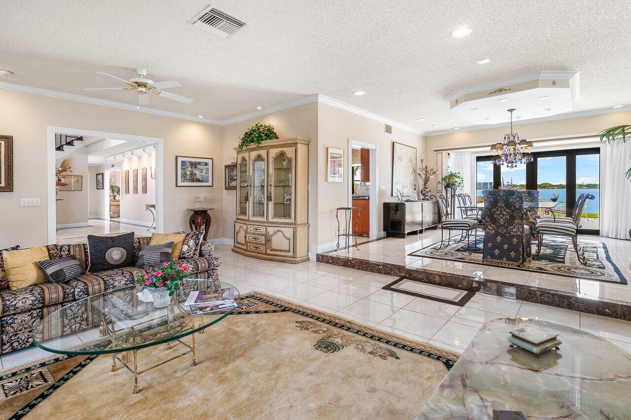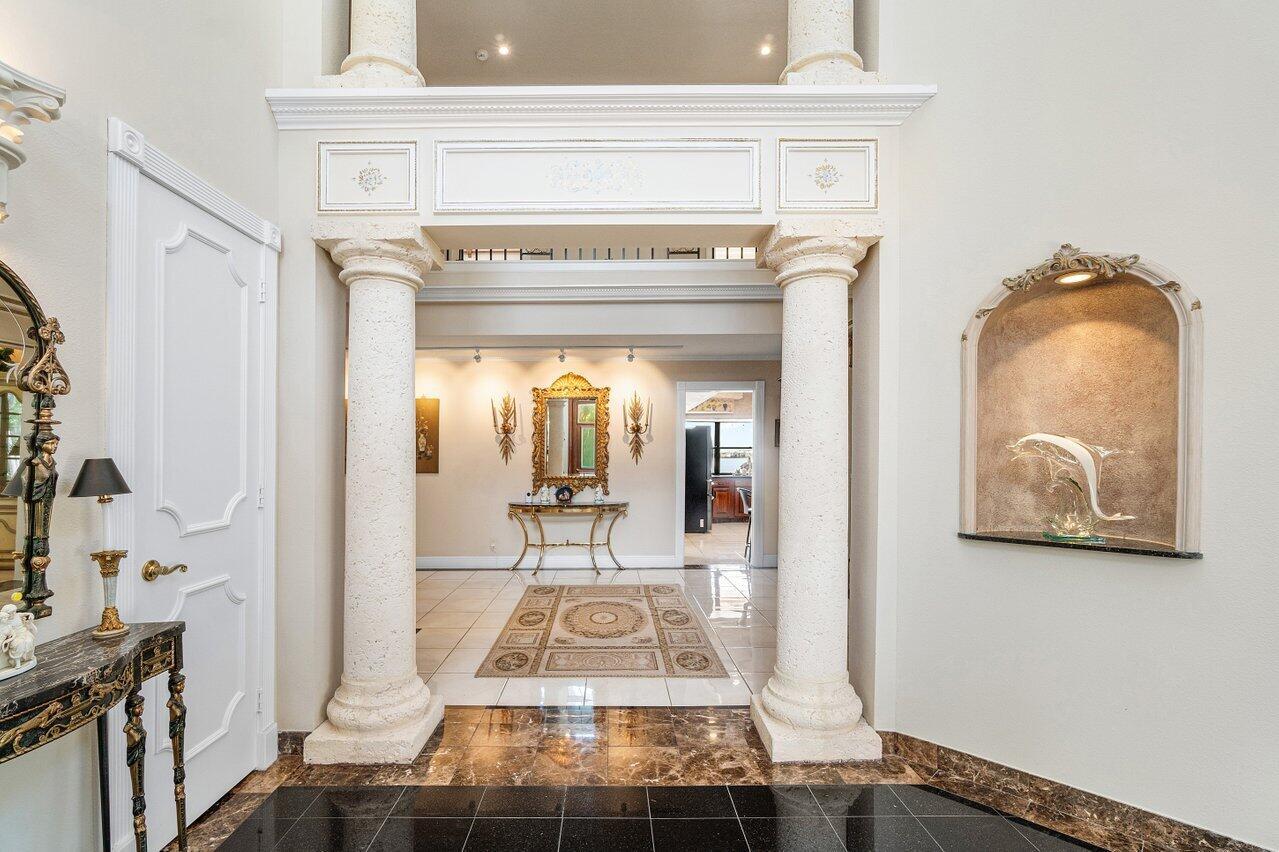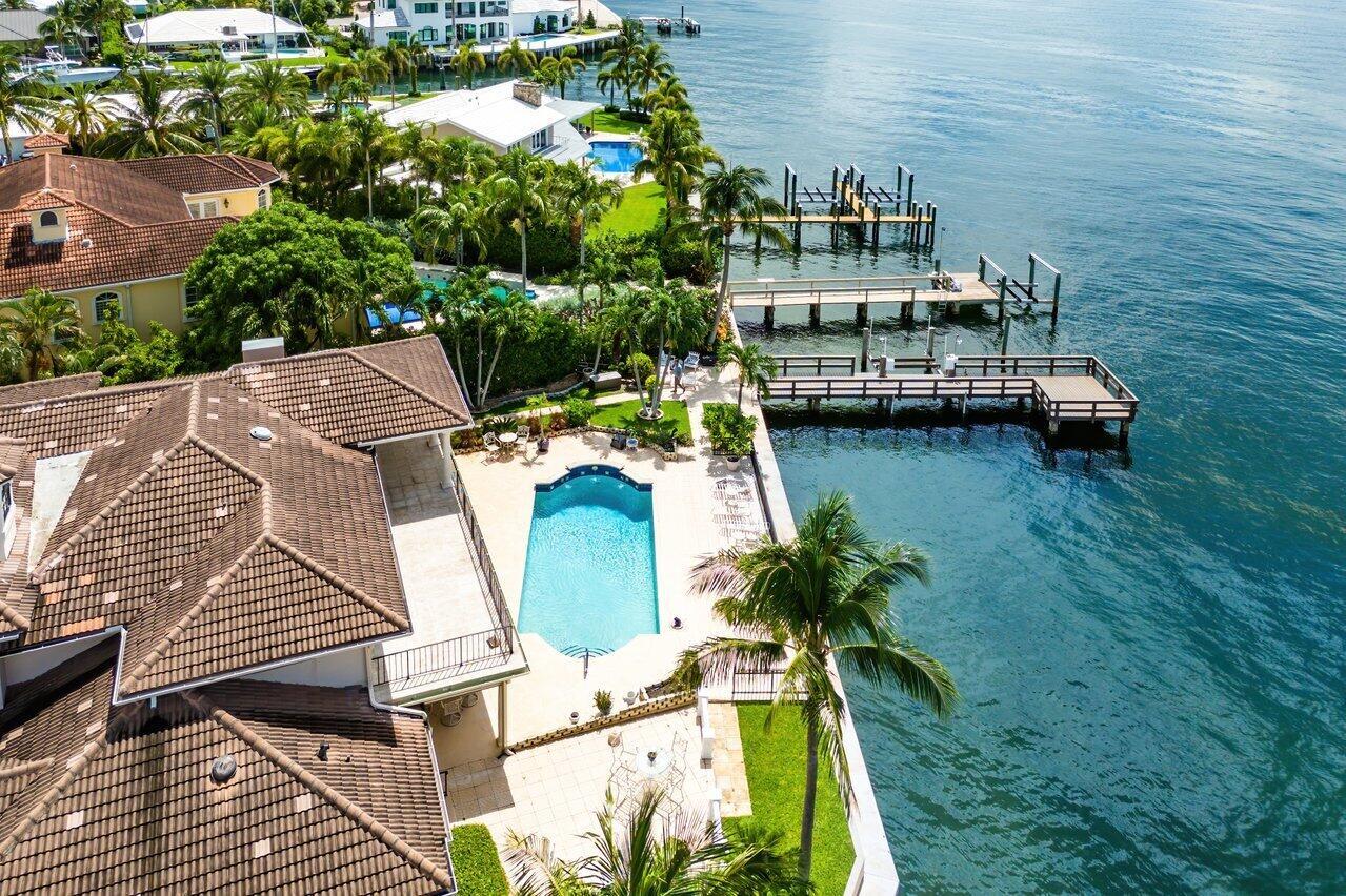 Discover a one-of-a-kind opportunity on Singer Island's most exclusive stretch of single family homes. Positioned on a private cul-de-sac street, 1010 Pine Point Road offers 144 feet of unobstructed Intracoastal frontage with a private dock, 14,000 lb lift, and deep water access just minutes from the inlet, making it a true boater's dream. This Mediterranean Revival residence spans more than 4,000 square feet under air and over 6,000 total, designed for both grand entertaining and quiet waterfront living. A dramatic double-height foyer with a custom cupola floods the home with natural light, leading to expansive living and dining areas finished in marble and natural stone. With four bedrooms, private elevator and a sprawling owner's suite, this home provides scale and gracious livability.